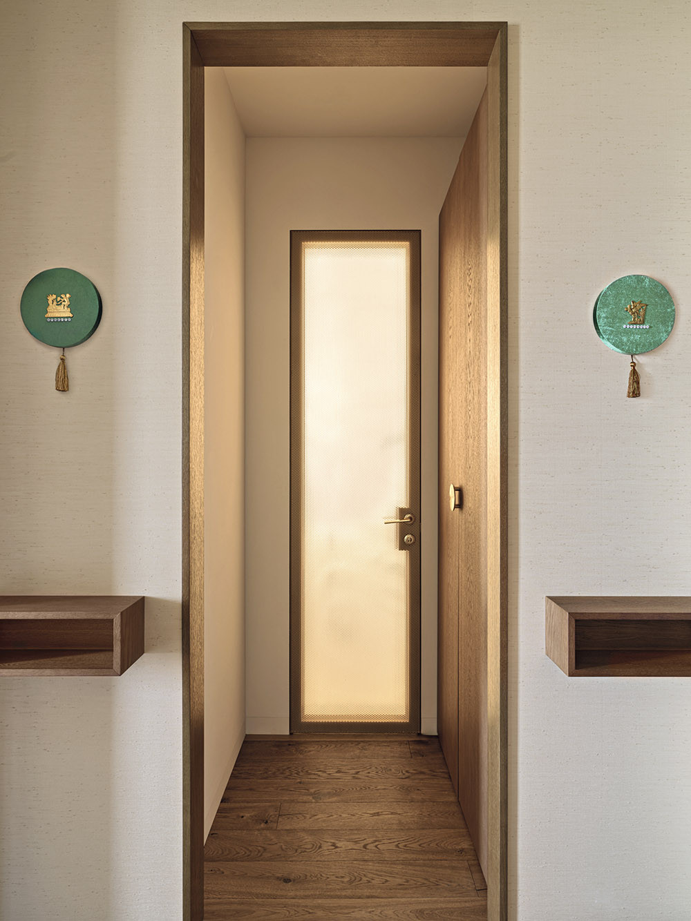 Мария признается, что в своих проектах часто использует дерево, стекло, фактурные обои, любит наполнять пространство искусством, уникальными винтажными предметами, создающими правильный настрой и контекст. В данном случае предметом особой гордости стало разработанное бюро решение для зонирования пространства, которое назвали «функциональный простенок». На сегодняшний день он является украшением объекта, местом притяжения и в то же время выполняет функцию буфета, телестены, декоративной консоли и местом установки новогодней елки. Облицовка оконных проемов деревянными панелями в в зоне гостиной выполнена виртуозно, направляющие штор скрыты в монтажной конструкции стеновых панелей, что позволило добиться эффекта монолитности стенового покрытия и сделать зону гостиной особенно торжественной. Благодаря продуманной совместно с заказчиками карте перемещений, место хранения организовано таким образом, что оно никак не привлекает к себе внимание и позволяет создать комфортную траекторию движения внутри квартиры. «Запрос нового времени, — говорит автор проекта, — состоит в том, чтобы при сокращении жилых площадей застройщиком сохранить необходимый функционал для наших заказчиков. Этот объект стал амбассадором реализации в проектах роскоши будущего».