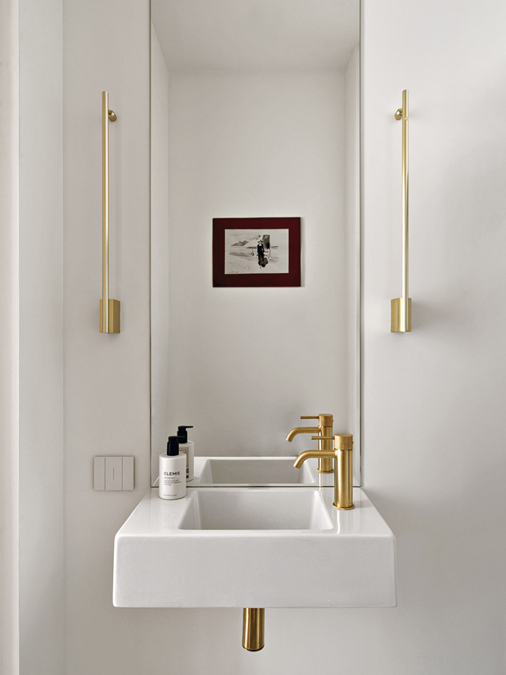 Все окна квартиры выходят на одну сторону, в связи с этим было принято решение разместить в «слепых» зонах все места хранения, вспомогательные помещения и санузлы, а гостиную, столовую и хозяйскую спальню выдвинуть к свету и раскрыть тем самым перспективу. Эффект пространства, пронизанного светом, был достигнут в полной мере. «Хозяйка квартиры прекрасно готовит, — рассказывает автор проекта Мария Фильштинская, — и как только мы попали на объект на этапе приемки его у застройщика, ею было высказано мнение, что было бы прекрасно готовить и созерцать всю красоту открывающегося паркового пространства за окном. Voilà — сделано. Кухня была спроектирована с учетом того, чтобы при занятии кулинарным искусством заказчица могла смотреть на открывающуюся панораму, и ничто не препятствовало этому». Это было одно из самых сложных проектных решений. Для него потребовались значительные усилия по согласованию переноса коммуникаций и устройству дополнительных инженерных узлов.