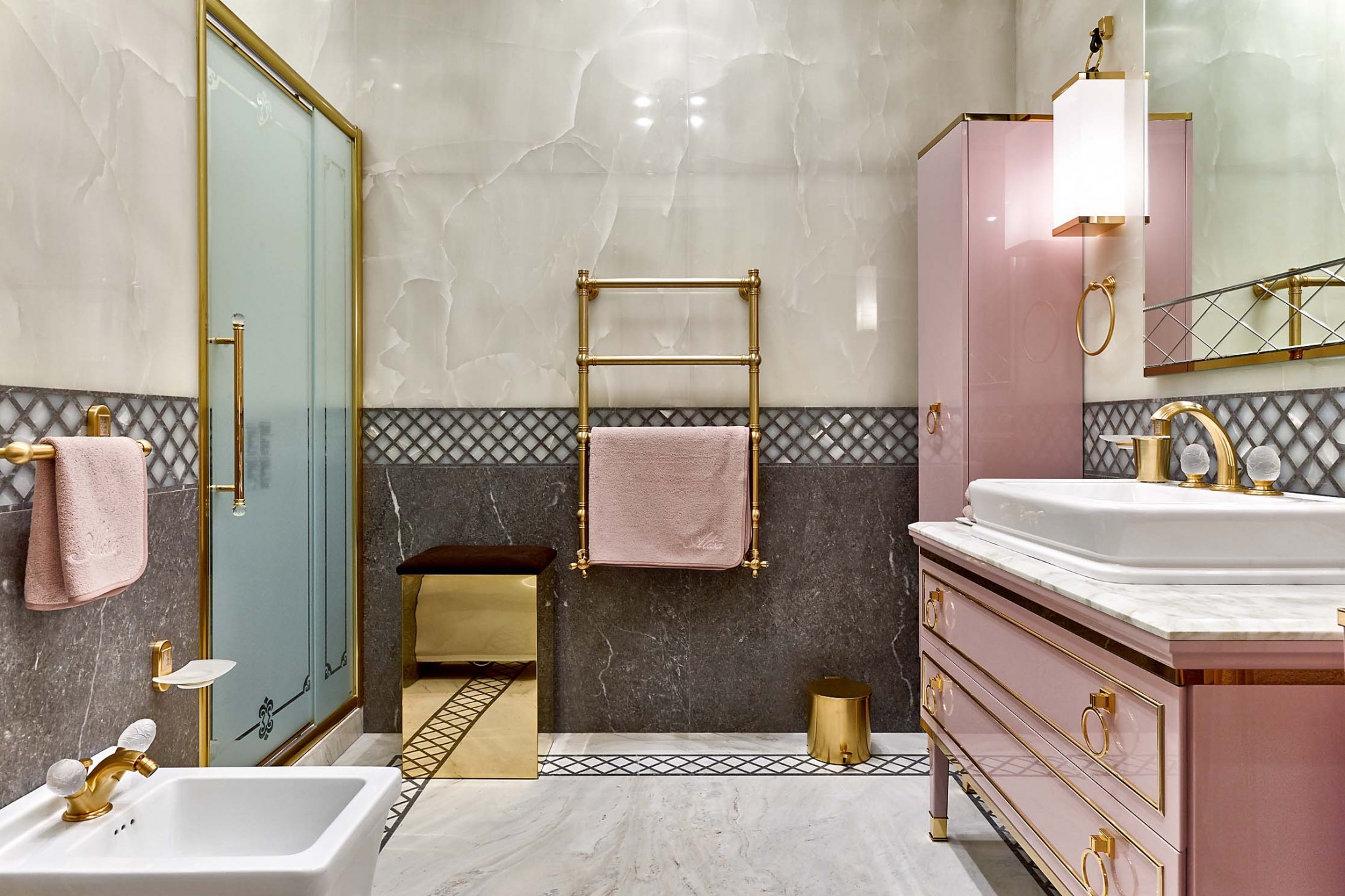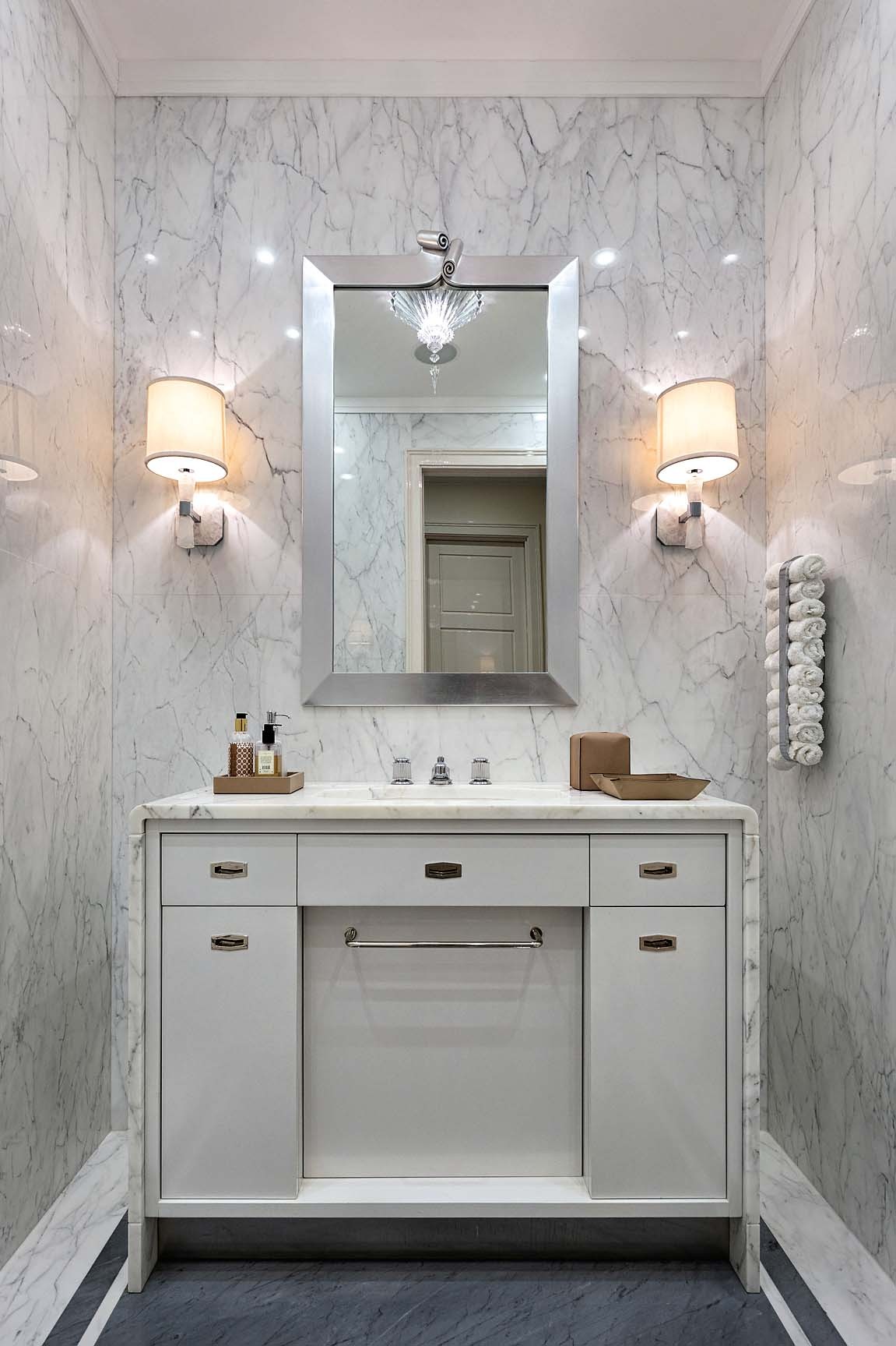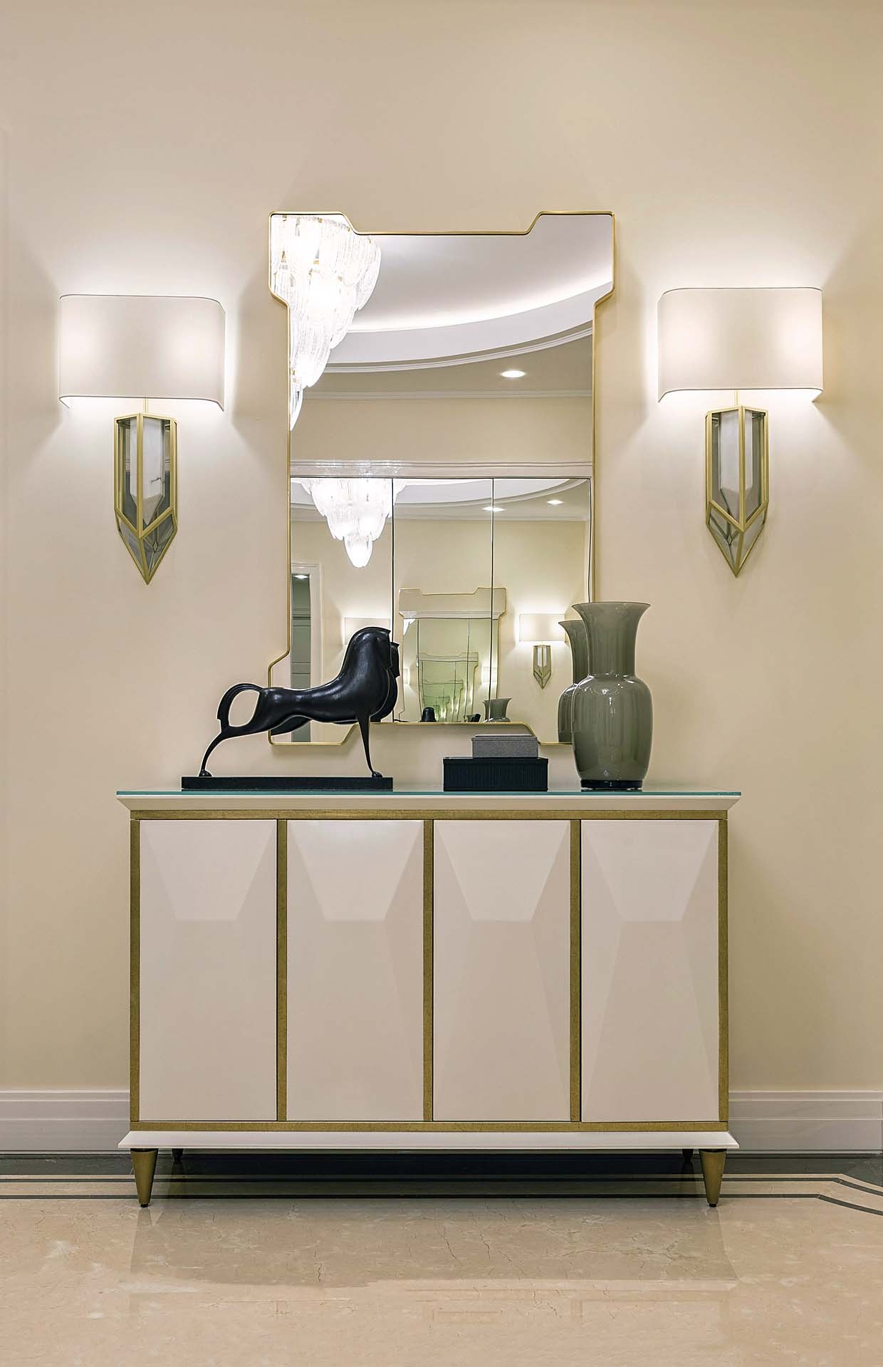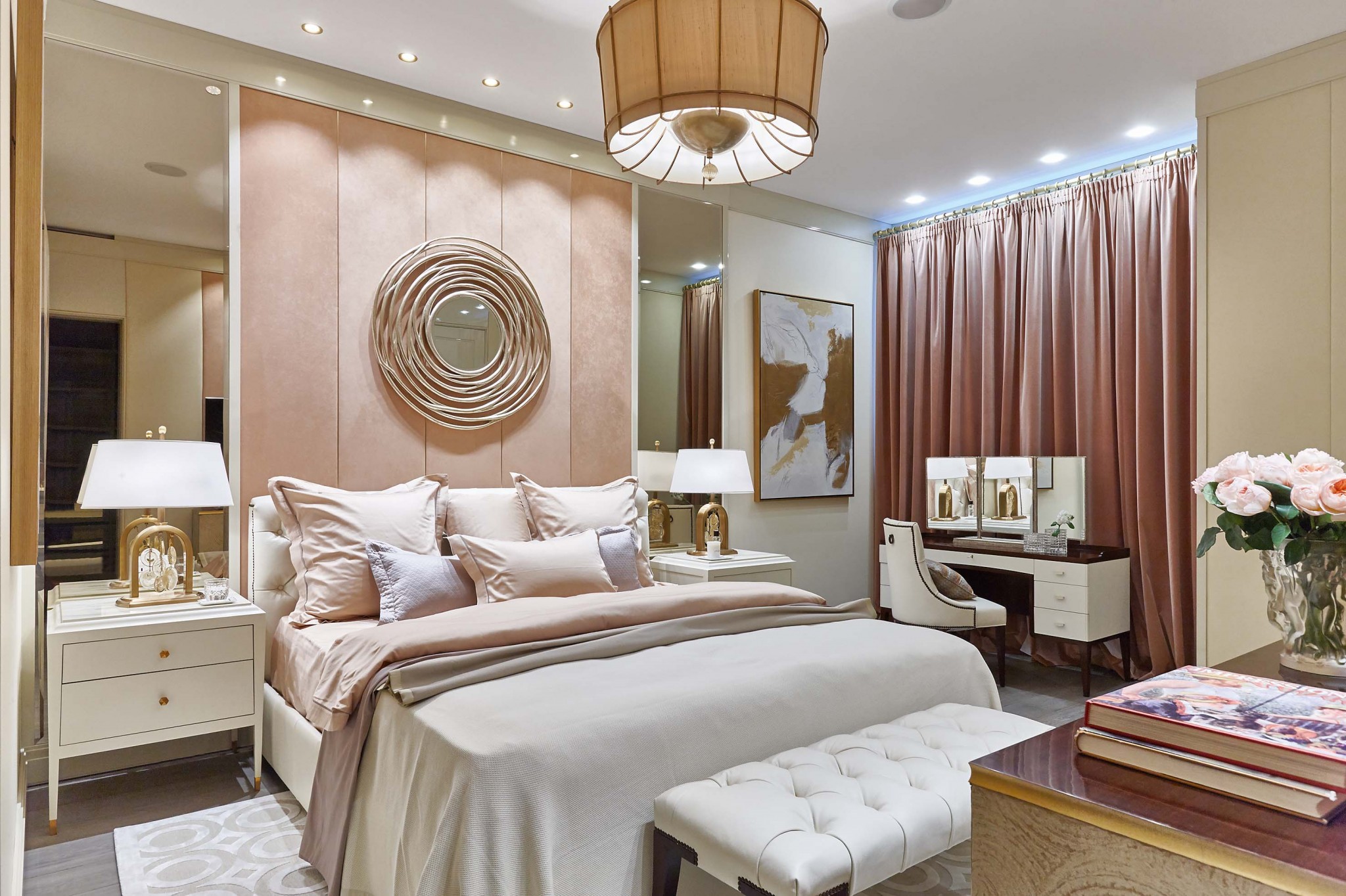 В таком же торжественном ключе выполнены и другие комнаты. Стены просторного холла и прихожей облицованы буазери, выполненными на заказ и тонированными в пыльно– розовый цвет, потолок украшает люстра из муранского стекла, а пространство — антикварные аксессуары в стиле ар–деко. В спальне использованы лак оттенка слоновой кости и пудры, панели из алькантары изысканного пастельного бежево–розового тона.