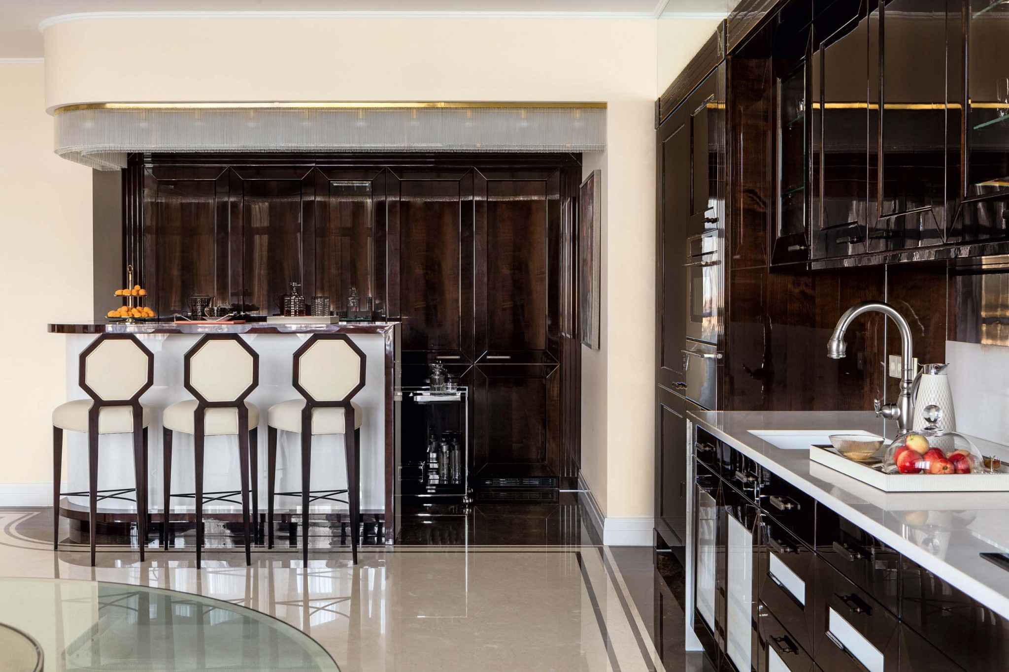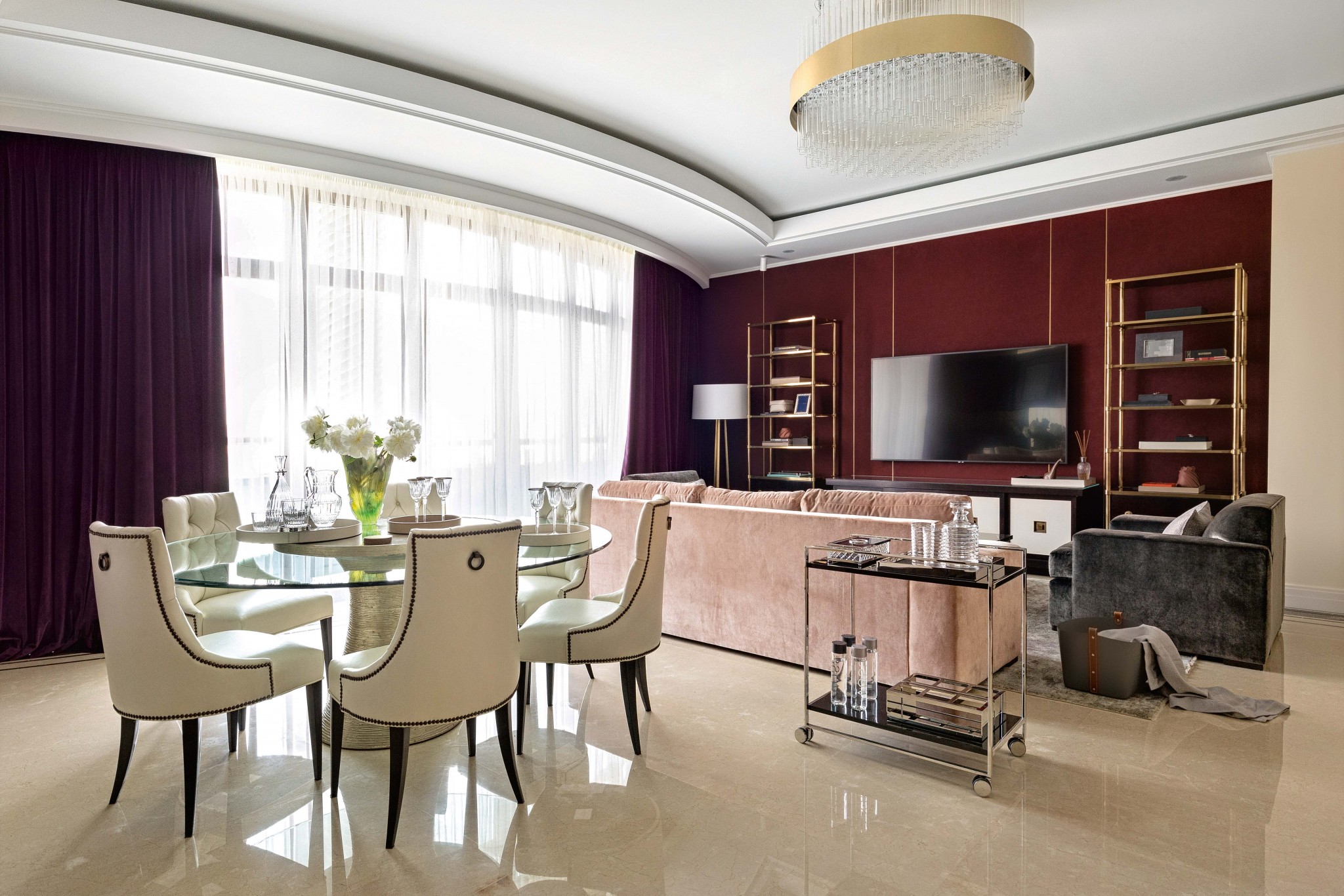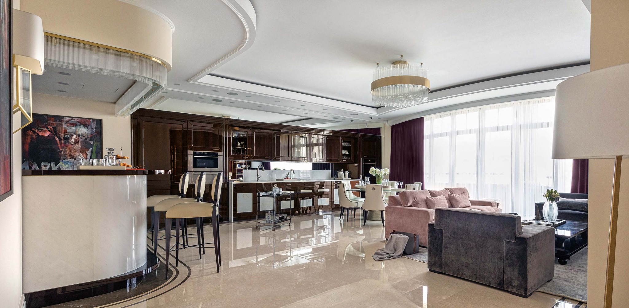 В отделке особый акцент сделан на эксклюзивные, роскошные материалы и элементы декора: редкие сорта мрамора и дерева, хрусталь, тонкую работу с замшей, шпонами и лаками. В интерьере много аксессуаров из частной коллекции заказчиков, а также предметов таких брендов, как LALIQUE, THG, JEAN LOUIS DENIOT, CHRISTOPHER GUY, BAKER, ZEYKO, BARBARA BARRY, BACCARAT, CHRISTOFLE, подобранных специально для этой квартиры. Гостиная, столовая и кухня — это единое пространство, оформленное в современном стиле. Парадное настроение помещению придают пол из натурального мрамора, отшлифованный до блеска, лакированные фасады кухни с инкрустацией из натурального камня, люстра из хрусталя, картины современных художников и живописцев, творивших в начале XX века, и стена, декорированная целиком мягкими панелями из замши благородного винного оттенка.