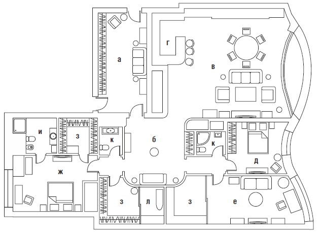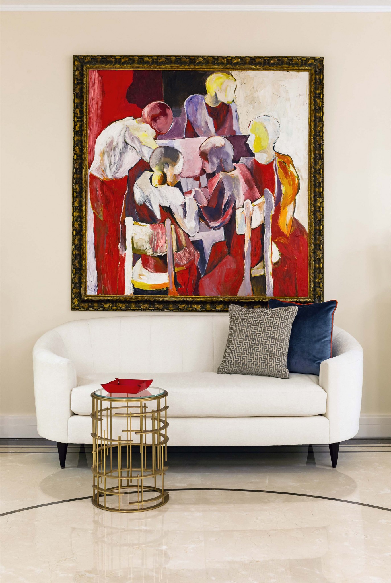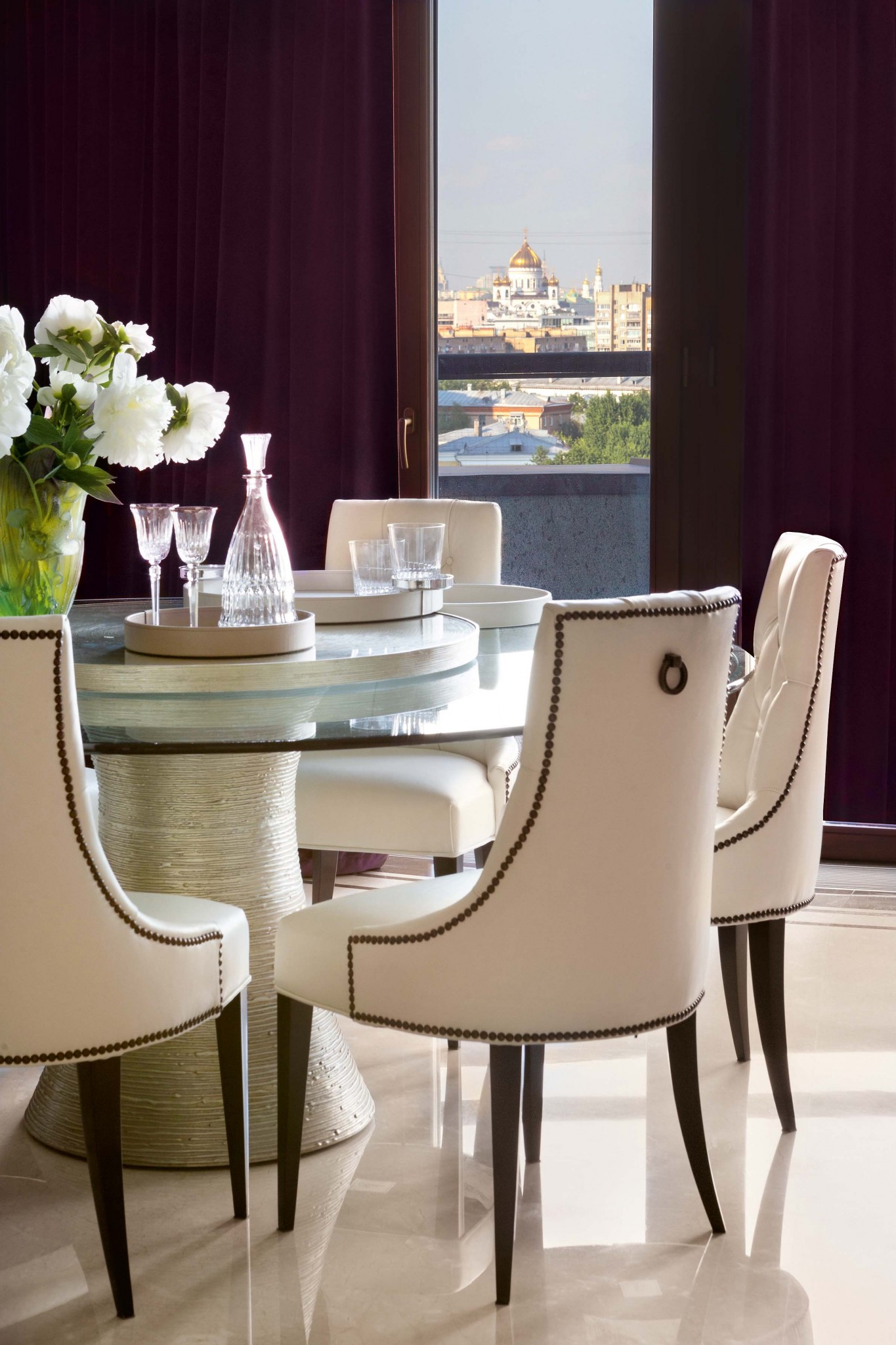 В отделке особый акцент сделан на эксклюзивные, роскошные материалы и элементы декора: редкие сорта мрамора и дерева, хрусталь, тонкую работу с замшей, шпонами и лаками. В интерьере много аксессуаров из частной коллекции заказчиков, а также предметов таких брендов, как LALIQUE, THG, JEAN LOUIS DENIOT, CHRISTOPHER GUY, BAKER, ZEYKO, BARBARA BARRY, BACCARAT, CHRISTOFLE, подобранных специально для этой квартиры. Гостиная, столовая и кухня — это единое пространство, оформленное в современном стиле. Парадное настроение помещению придают пол из натурального мрамора, отшлифованный до блеска, лакированные фасады кухни с инкрустацией из натурального камня, люстра из хрусталя, картины современных художников и живописцев, творивших в начале XX века, и стена, декорированная целиком мягкими панелями из замши благородного винного оттенка.