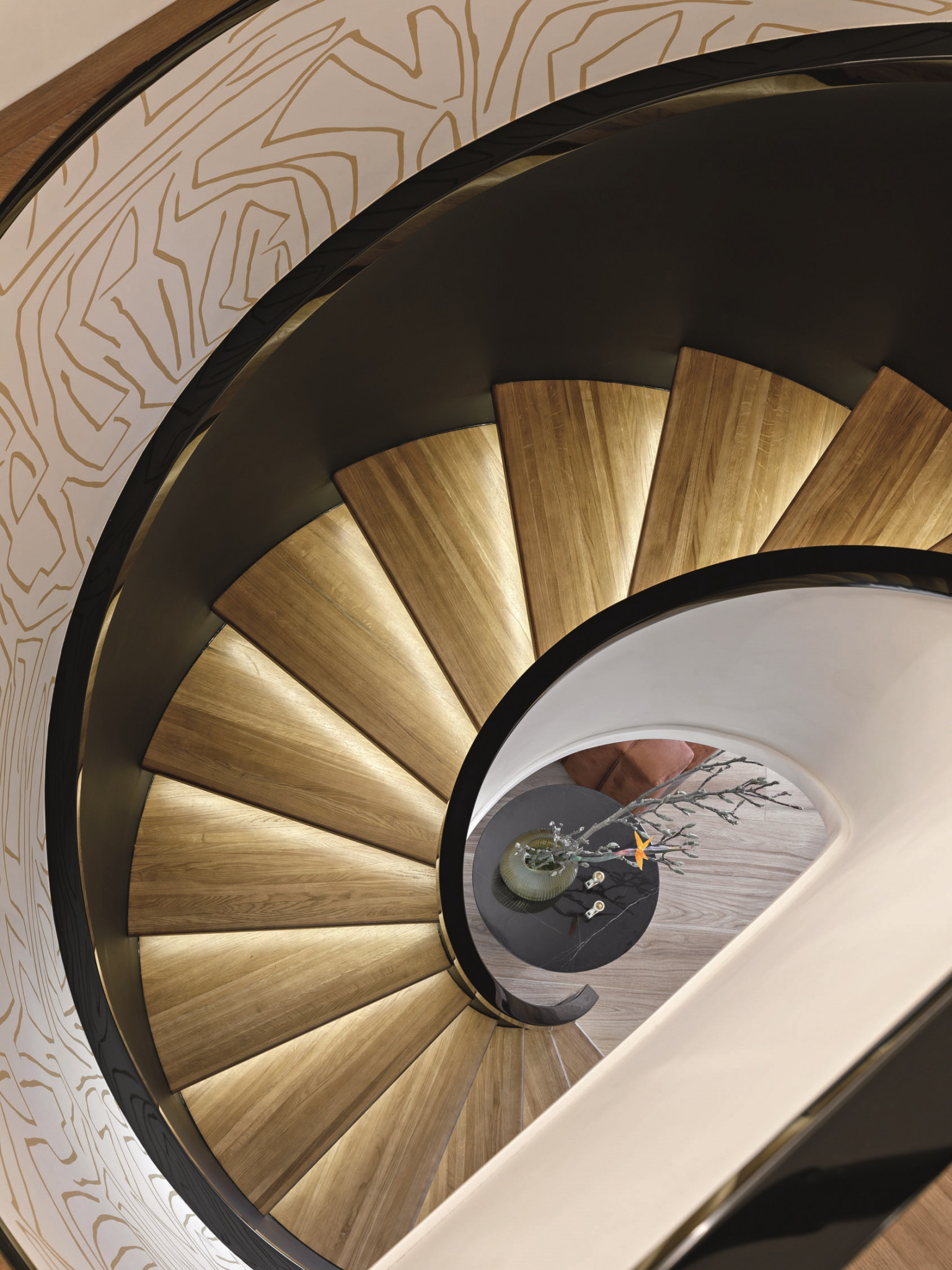 Добиться желаемых результатов помог демонтаж перегородок и проверенные временем дизайнерские приемы. Например, наполнить воздухом узкий коридор (избавиться от которого не позволили несущие стены) удалось за счет ярких и динамичных полов и отделки стен зеркалами, а «сбить масштаб» в спальне позволила люстра размера XXL. «Большинство людей считают, что в маленьком помещении нельзя использовать большие предметы, однако все ровным счетом наоборот. Когда–то давно в книге британского дизайнера Келли Хоппен я прочла, что, если в тесной комнате повесить большую люстру, она будет увеличивать своим масштабом пространство. Идея мне понравилась, а протестировав ее, я и сама убедилась, что большие вещи своим масштабом увеличивают пространство», — рассказывает Кристина. Конечно, это далеко не единственные приемы, которые автор проекта использовала в интерьере, чтобы зрительно расширить пространство: есть функциональный кухонный остров с выдвижным столом, незаметные для глаз системы хранения — как для бытовой техники, так и для одежды и аксессуаров, а также «скрытая» и зеркальная двери. Вообще, дверям в этом проекте уделено особое внимание. «Их высота 2,5 метра, и они выполнены по нашим эскизам компанией Walls Studio, — комментирует Кристина Дмитрова. — Полотно состоит из разных сегментов с фрезеровкой и имеет глянцевое покрытие. Такие двери выглядят эффектно и добавляют интерьеру торжественности». Но главной изюминкой интерьера стала скульптурная, «парящая» лестница, дизайну которой уделили особое внимание. Заказчики просили, чтобы она была максимально удобной и ни в коем случае не чугунной, поэтому в качестве облицовочного материала выбрали искусственный камень и дерево, из которого сделаны ступени. Дополнительную безопасность лестнице придает подсветка «смарт»: ночью всегда подсвечивается первая и последняя ступени, а в дневное время автоматически последовательно подсвечиваются ступени во время движения по лестнице. «В проекте много сложных эстетических и технических решений. Я предложила заказчикам выбрать одного подрядчика под ключ. Благодаря слаженной работе команды Сергея Белоусова проект реализовался в точности как на визуализации». Что касается цветовой гаммы интерьера, то, по словам автора проекта, она родилась сама собой. «Белый интерьер не для наших заказчиков: им в нем визуально было бы скучно, — рассказывает Кристина Дмитрова. — Поэтому мы изначально поставили себе задачу создать интерьер, в котором будет