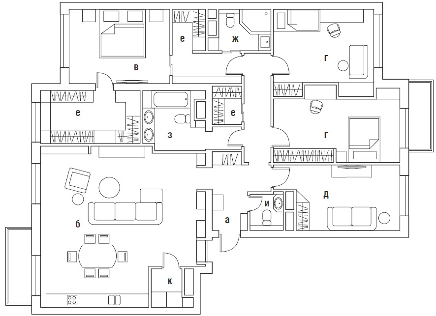 Хозяева — молодая семейная пара с двумя детьми — приобрели две квартиры и поставили перед дизайнерами задачу создать комфортное пространство с большой общественной зоной для приёма родных и друзей. Гостиную с кухней владельцы планировали обустроить на месте маленькой квартиры, из окон которой открывается вид на набережную Москвы–реки. Дизайнеры всецело поддержали это решение, оно было самым логичным. Но при этом вход в гостиную получался неудобным, впритык к входу в квартиру. Поэтому основным сделали второй вход (со стороны большой квартиры), а «запасной» скрыли, задекорировав его порталом с витражной дверью. Благодаря объединению квартир удалось разделить объём на два отдельных, самостоятельных блока. «Во всех своих проектах мы всегда стараемся максимально развести общую зону и приватную, чтобы они не пересекались. Это наш главный критерий при создании планировочного решения, особенно когда речь идёт о семье с детьми. Эта квартира не стала исключением», — поясняет решение Анастасия Ламидова.