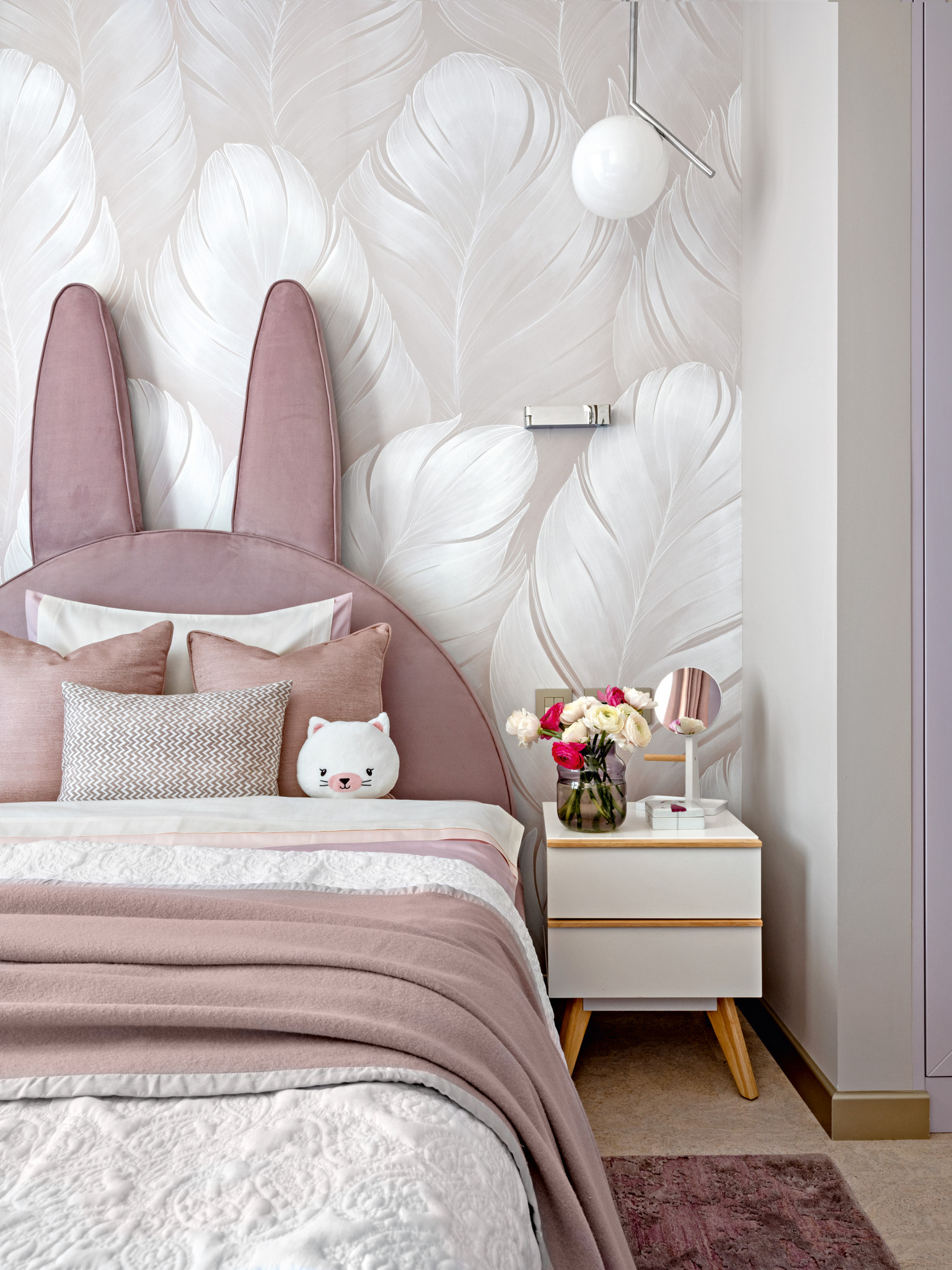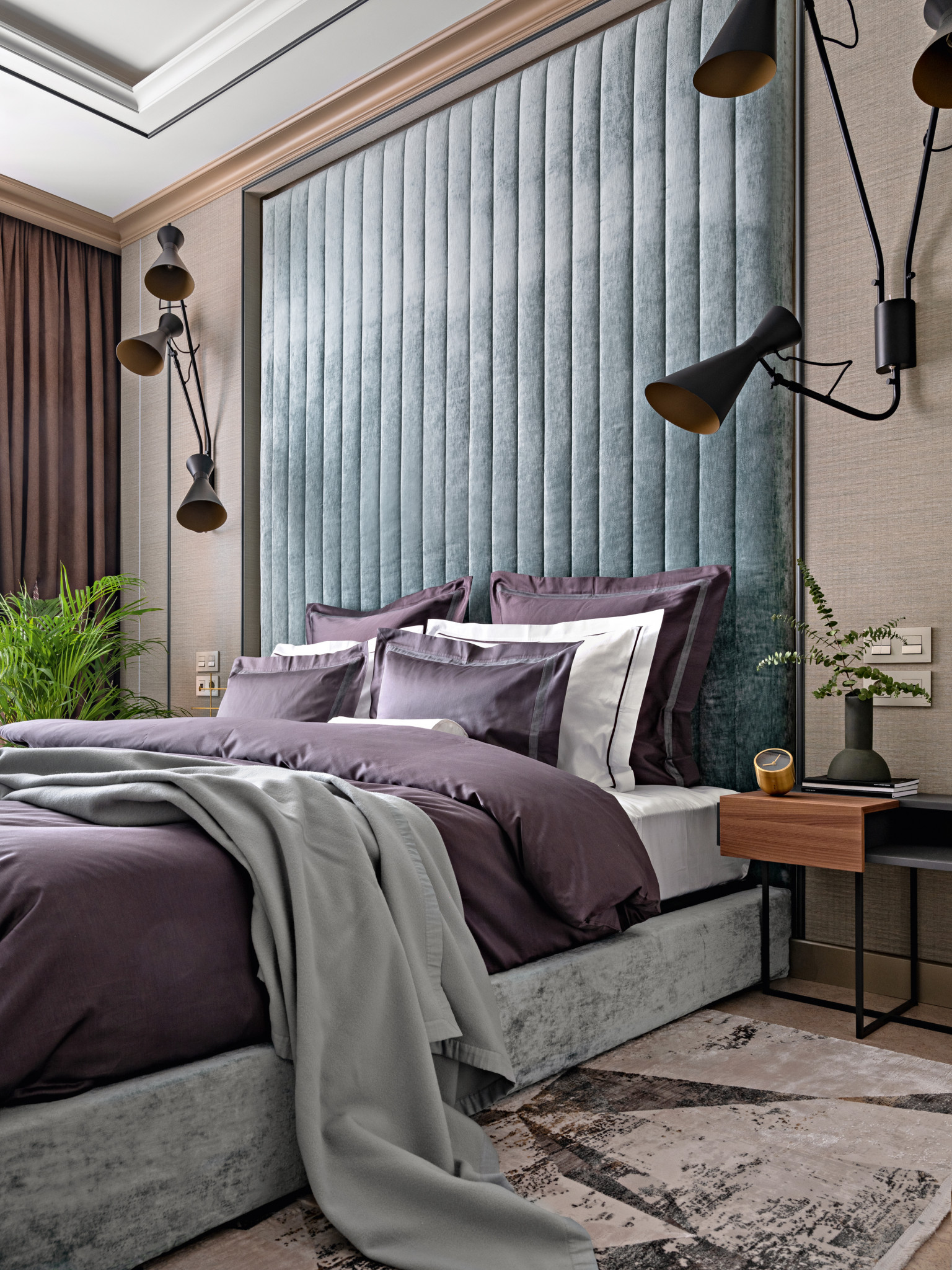 Хозяева — большие ценители вина, что нашло отражение в интерьере. В гостиной появилась винотека (ей отведено одно из центральных мест), а в оформлении использован глубокий винный оттенок. Уютное кресло и мягкие подушки бордового цвета выступают в качестве акцентных элементов. Закольцовывает композицию картина «Билатеральная симметрия №6» Татьяны Неги, выдержанная в той же цветовой гамме. Ещё один знаковый элемент — ниша из натурального оникса Ivory, ставшая настоящим украшением гостиной. В приватной зоне цветовой диапазон шире, здесь Анастасия и Игорь применили любимые хозяевами цвета. В спальне парой к основному оттенку тортора выступил пастельно–бирюзовый, привнёсший свежие нотки тропиков. В спальне дочери доминирует пыльно–розовый цвет, который в сочетании с жемчужным рисунком обоев ручной работы и серым оттенком стен выглядит ещё более изысканным. Для комнаты сына выбрали уверенный серо–бежевый цвет.