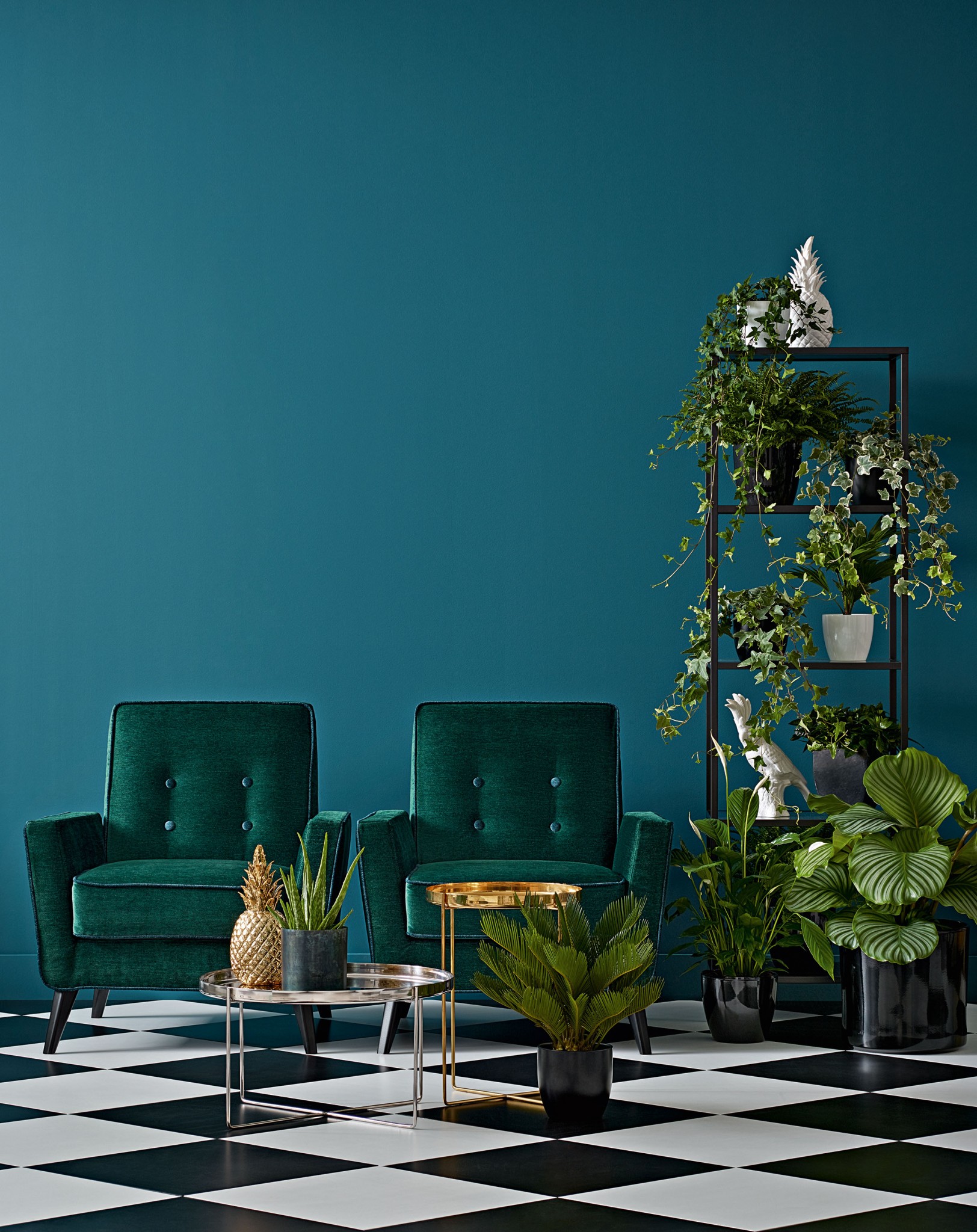 Зелёный & растения. Стена бирюзового цвета, кресла в тёмно–зелёной обивке (SAHCO) — хорошая основа. Если поставить рядом стеллаж с ампельными растениями, а несколько других разместить на полу и на кофейном столике, в комнате сразу появится «загородное» настроение. Актуально: тропические растения.