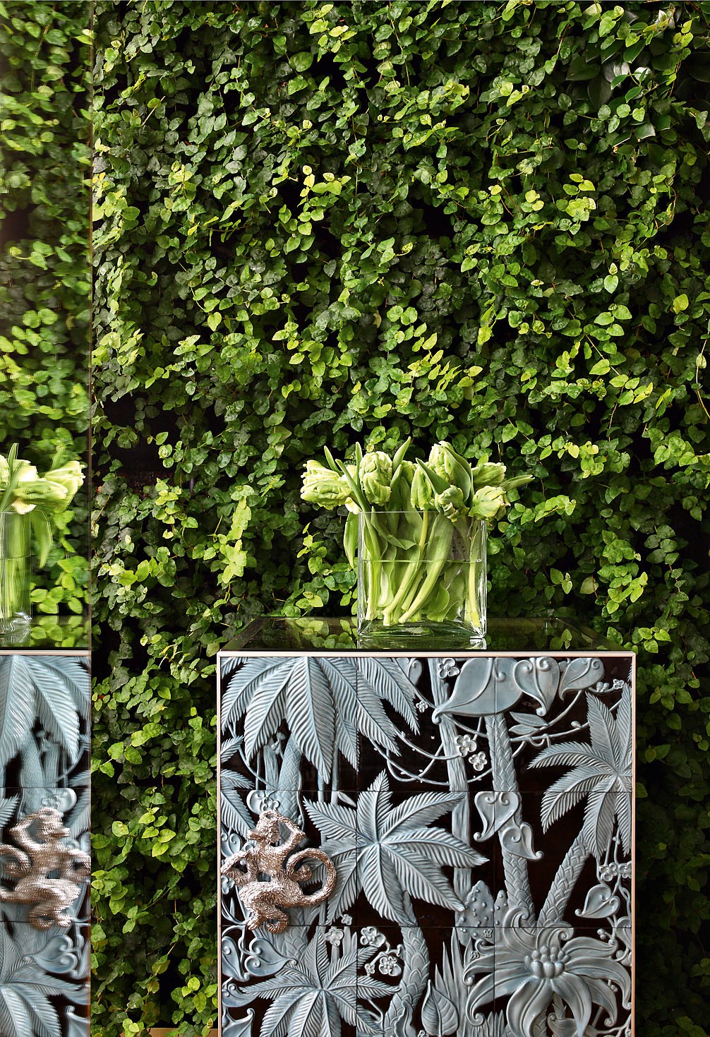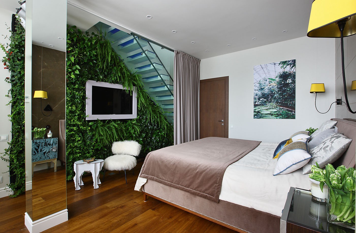 Вертикальное озеленение. Ещё недавно этот приём использовали только в общественных пространствах, сегодня же всё чаще — в частных. Авторы проекта Анна Смирнова и Юлиан Суетин предусмотрели вертикальное озеленение в спальне городской квартиры. Эффект усилили при помощи зеркал и пейзажа на стене.