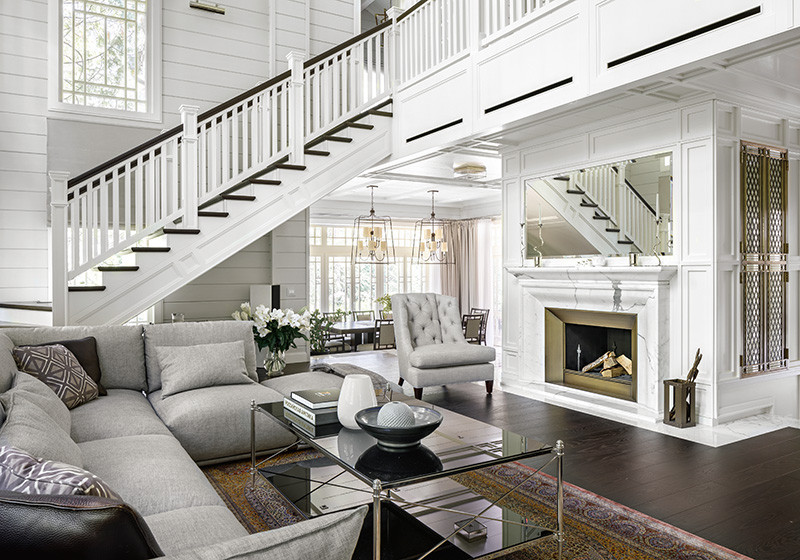Первое, что выделяет дом на фоне окружающей застройки, — площадь и количество окон с рисунком расстекловки, характерным для оконных переплётов старых дач. Благодаря чему внутри дом пронизан солнечным светом и сливается с окружающей природой. Вторая особенность — двусветное пространство гостиной с камином и мягкой группой, являющейся своеобразным центром, стержнем дома. Отсюда открываются виды на другие парадные помещения первого этажа (кухню с барной стойкой, столовую, холл) и галерею–библиотеку второго этажа.
