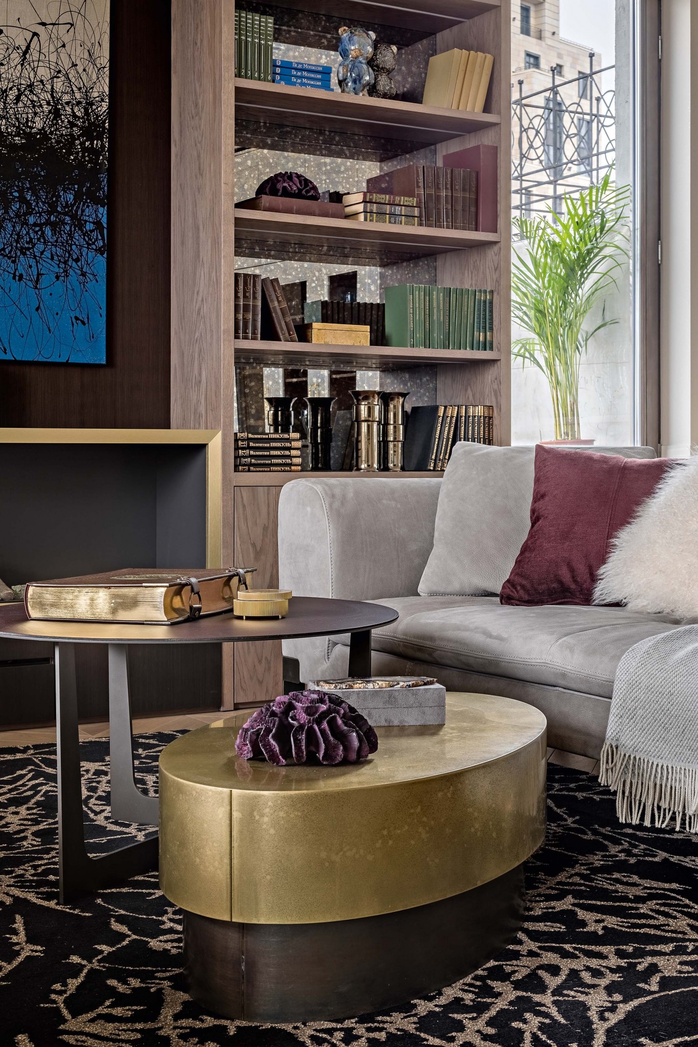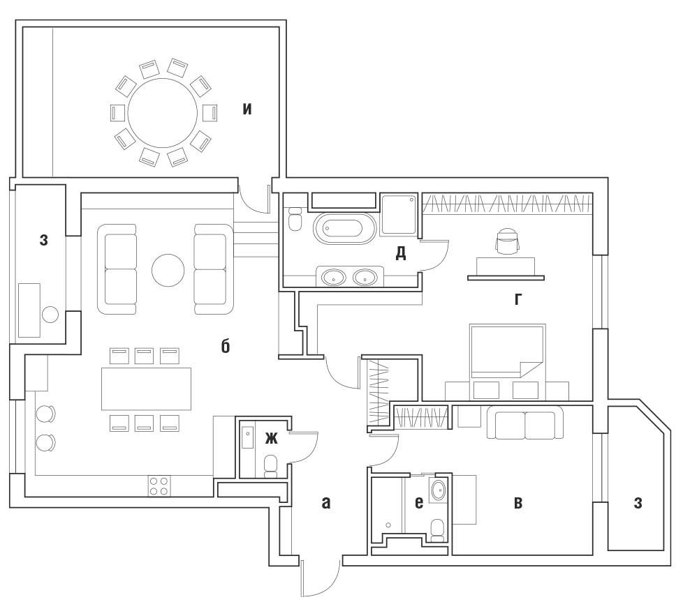 Квартира находится на последнем этаже ЖК «Донской Олимп», заказчики приобрели её из-за большой открытой террасы, прилегающей к гостиной. «Гостеприимные хозяева хотели сделать её гвоздём программы,— замечает автор проекта. —Именно поэтому мне нужно было уделить внимание как функциональности гостиной, так и её визуальному образу, чтобы интерьер стал своего рода развлечением для гостей, привлекал внимание своими дизайнерскими решениями». Чтобы получить большую общественную зону, Наталья объединила прихожую с кухней и гостиной и выделила при входе место для гостевого санузла. Для большего эффекта убрали подоконный блок балкона — так гостиная стала казаться ещё более просторной.