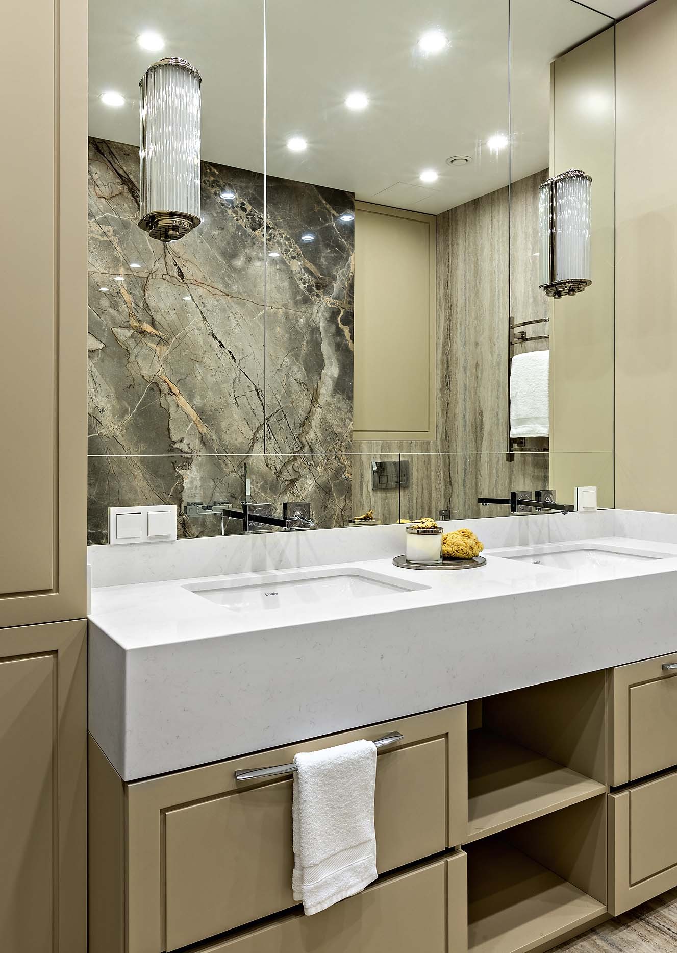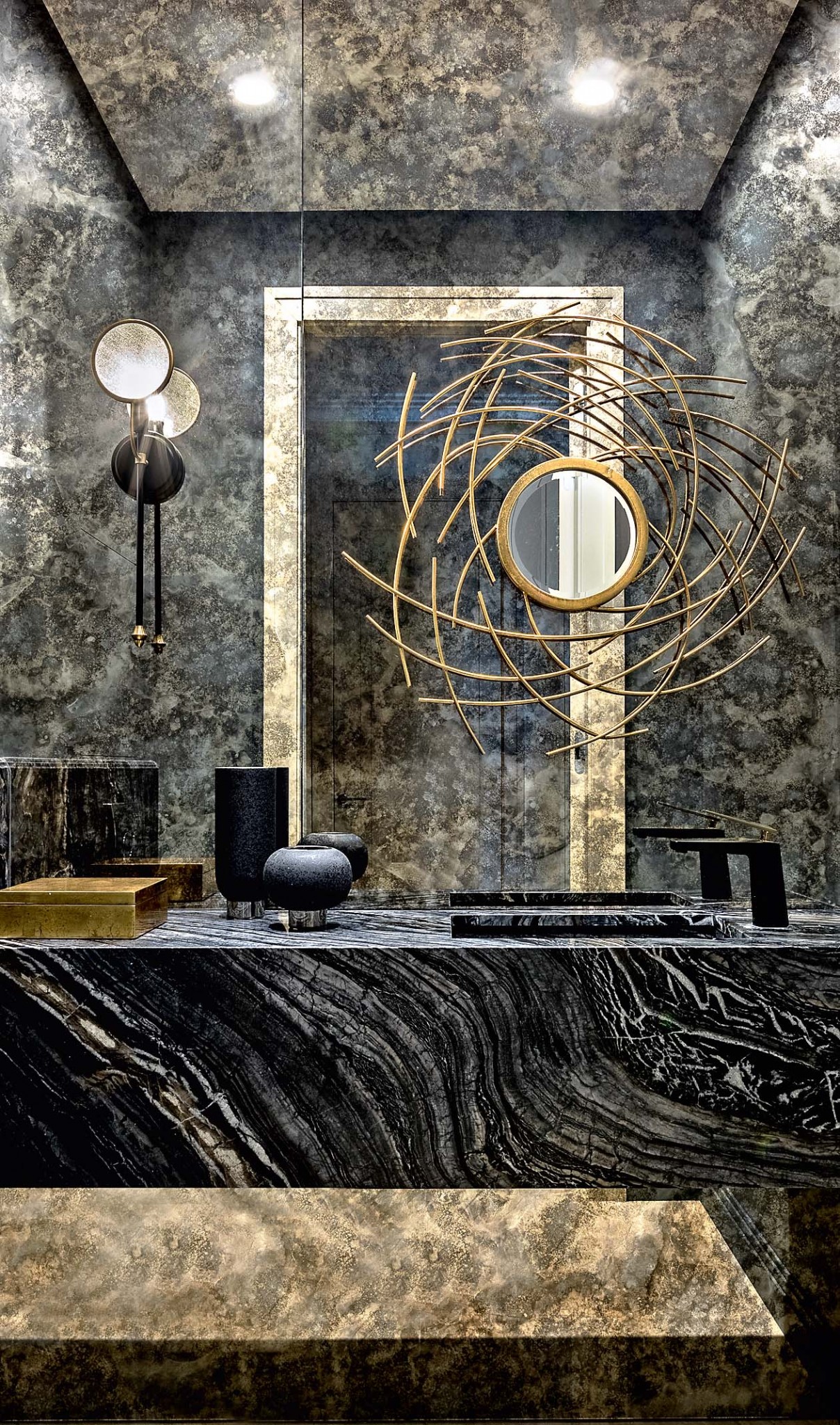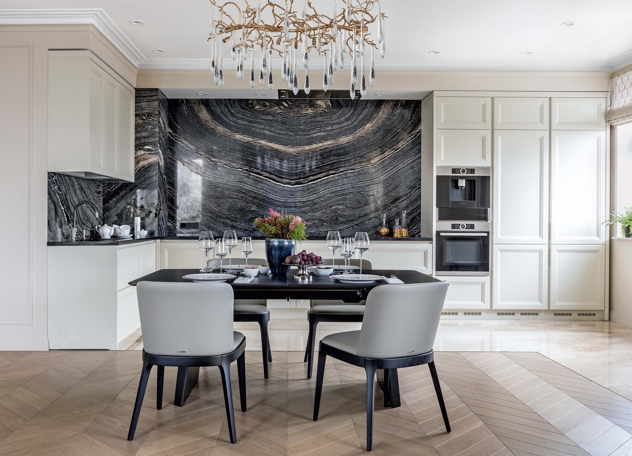 Источником вдохновения при разработке дизайна стал мрамор. Им отделали гостевой санузел, гостиную, пол в прихожей и ванную комнату хозяев. Чтобы подчеркнуть природный рисунок камня, паркет, мебель и кухню подобрали спокойных, нейтральных цветов и фактур. Органическим линиям мрамора вторят люстра из металлических ветвей с каплями из хрусталя и предметы декора. «Когда я работала над проектом, меня зацепила фотография с чёрным мрамором, —рассказывает Наталья. — Я показала её заказчикам и услышала от них, что это слишком смелое решение, такие вещи разве что для журналов подойдут, но им очень нравится идея. В течение долгого времени меня не покидала эта мысль, и я всё-таки сделала первые наброски именно с использованием чёрного мрамора. И, как оказалось, не зря: заказчики сразу же утвердили концепцию». Найти нужный мрамор было сложнее, чем предполагала дизайнер. В силу своего природного происхождения рисунок камня каждый раз уникальный, а хотелось максимально приблизиться к утверждённому варианту, нужно было найти слэбы с определённым, изгибающимся орнаментом и с бежевыми прожилками. Кроме характерных для этого типа мрамора черт и серо–чёрного цвета, он должен был раскладываться зеркально — в виде бабочки. Объездив все склады в Подмосковье, подходящий камень Silver Wave дизайнер нашла в компании MAGMASTONES.