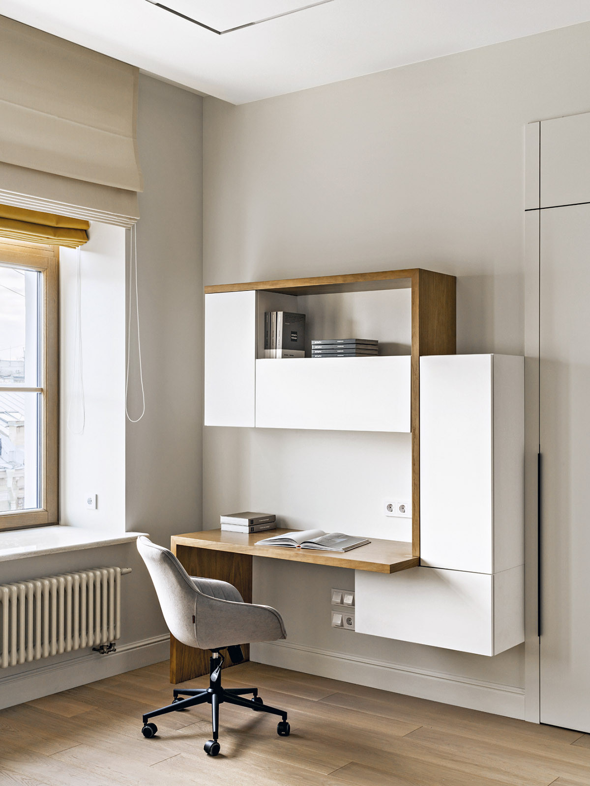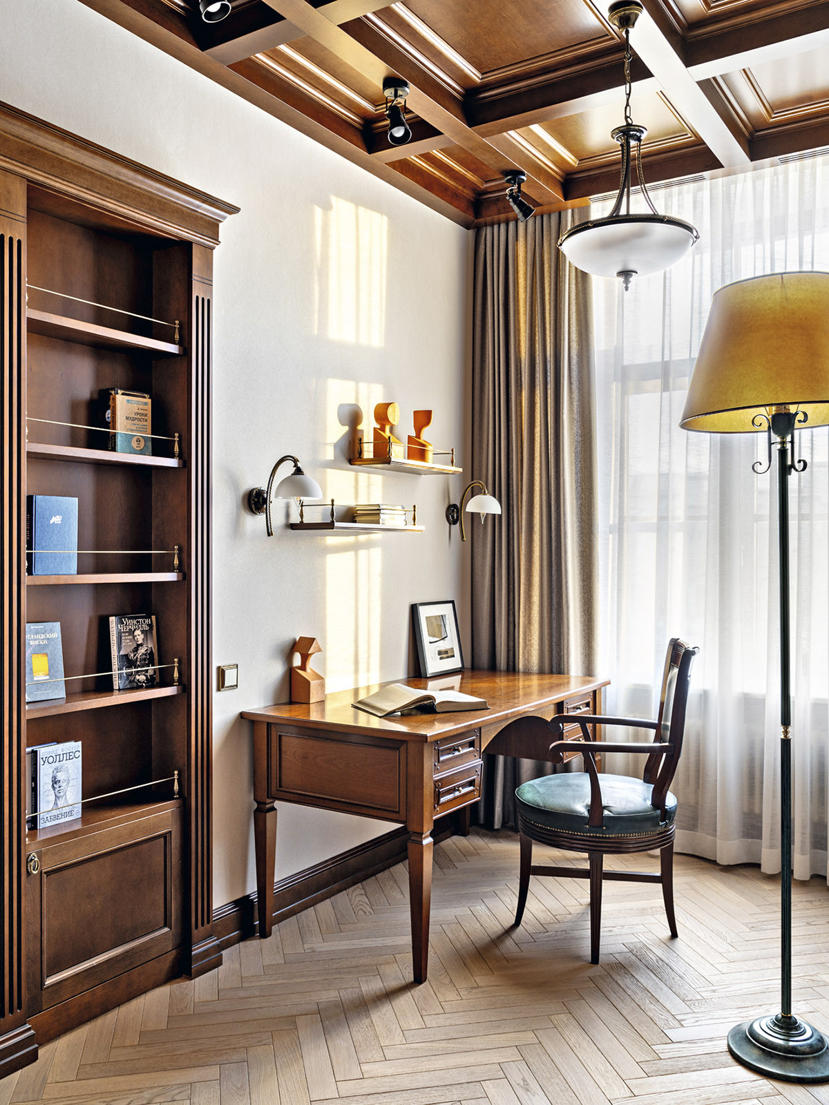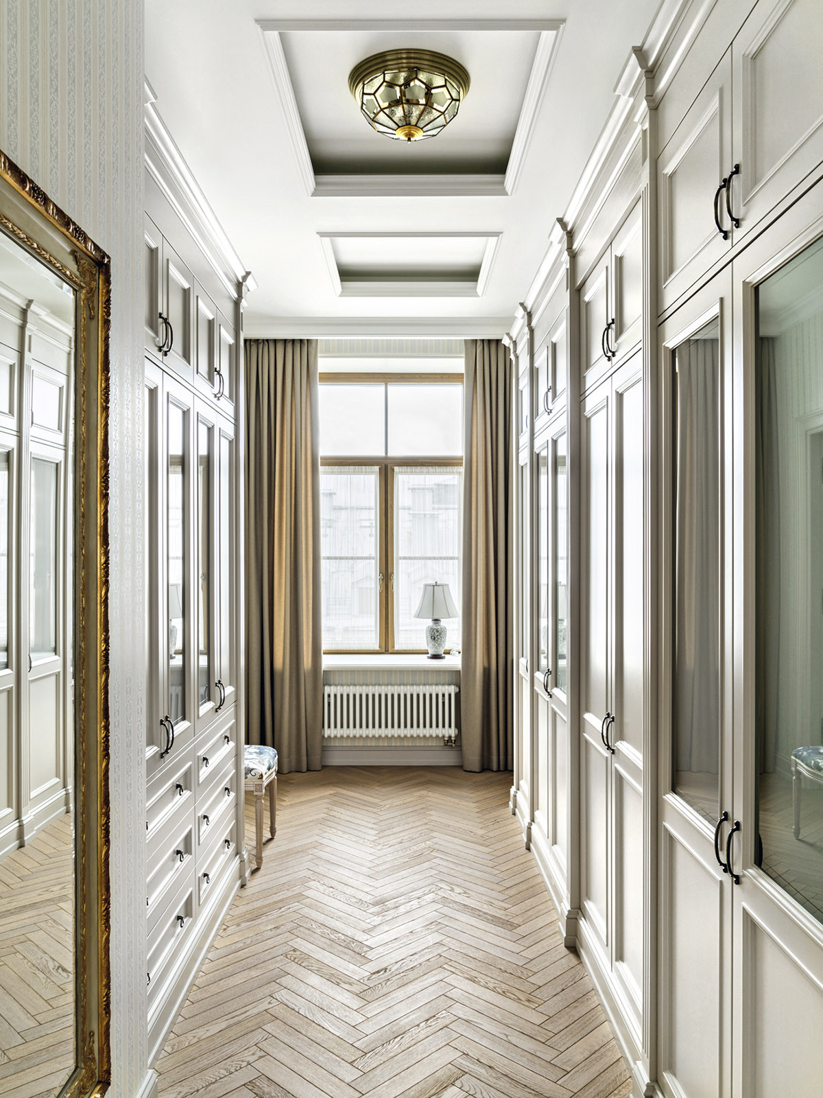 Образ интерьера — сдержанный, деликатный, без излишней пышности, блеска и золота. Это красивое и утонченное пространство вне времени. Оно не привязано к сиюминутным трендам и модным тенденциям, поэтому будет актуально многие годы. «В сравнении с минимализмом и многими другими стилями, классика, конечно, более нарядная. Но в классицизме есть строгость, линейность и сдержанность. Поэтому именно этот стиль взят за основу, а дальше нанизывались, как бусины, детали в виде витражных дверей в духе ар-нуво в кухню и ванную. В интерьере много вплетений из других эпох и направлений, которые позволяют из - бежать стилистической монотонности», — добавляет соавтор проекта Ксения Леон. «Каждый проект создается с учетом индивидуальных пожеланий заказчиков — это основной ориентир. Для нас важна не только эстетика, но и функциональность», — подчеркивает Ксения. «Изящество линий пре - обладает над декором, а функциональные элементы, например, скрытый шкаф в гостиной в зоне портала с колоннами, деликатно вписаны в архитектурный ансамбль». У заказчиков часто гостит девятилетний внук. Поэтому особое внимание уделили созданию детской комнаты. «Детская — дань творчеству Казимира Малевича. Цветовые блоки на стенах отсылают к палитре супрематизма, а мобильная сцена с театральным светом позволяет разыгрывать кукольные спектакли. Спальное место скрыто под подиумом, превращая комнату в мини-театр», — дополняет Александра. Центральным элементом гостиной стал камин из итальянского мрамора — реплика работы Фёдора Лидваля, выполненная мастерами «Камины Петербурга». Столярные изделия — двери, встроенные шкафы, консоли с зеркалами, часть тумб и буфет — созданы петербургскими специалистами компании «СТЭК» по эскизам авторов. «Каждая деталь, будь то витражные двери или «двери-стеллажи», тщательно продумана. Каждое решение гармонично вписалось в общий стиль квартиры и подчеркнуло ее уникальность», — рассказывает Александра. Перепланировка вернула апартаментам монументальность: анфиладная структура наполнила прихожую и гостиную светом и воздухом. Санузлы расширили за счет коридора, вход в приватную зону организовали из гостиной, а кабинет и библиотеку скрыли за панелями с эффектом старинного зеркала. Большое количество книг нашли свое место в новой двухъярусной библиотеке. Для создания второго яруса вдохновением послужила библиотека Николая II в Эрмитаже. «И хотя стилистически она спроектирована совершенно иначе, именно оттуда мы почерпнули идею планировочного устройства, — поясняет Александра. — Через замаскированную под фасад шкафа дверь, можно попасть в зону кладовой. Тут нашлось место и для лыж, и для большого количества чемоданов, и для сезонного хранения одежды, а также располагается красивая витрина для хранения коллекции сумок. Каждый сантиметр кладовой продуман до мелочей». «Мы заметили, что в условиях динамичного мира люди все чаще обращаются к традиционным стилям, — размышляет Ксения. — Это закономерно: в эпоху перемен человек ищет опору в привычном, в наследии прошлого. И классика становится необходимым якорем стабильности. Но и заказчики, и мы понимаем, что живем в современном мире, поэтому интерьер не мыслим без современных технологий. Живя в большом городе, люди хотят дышать свежим воздухом, отдыхать в тишине, видеть вокр