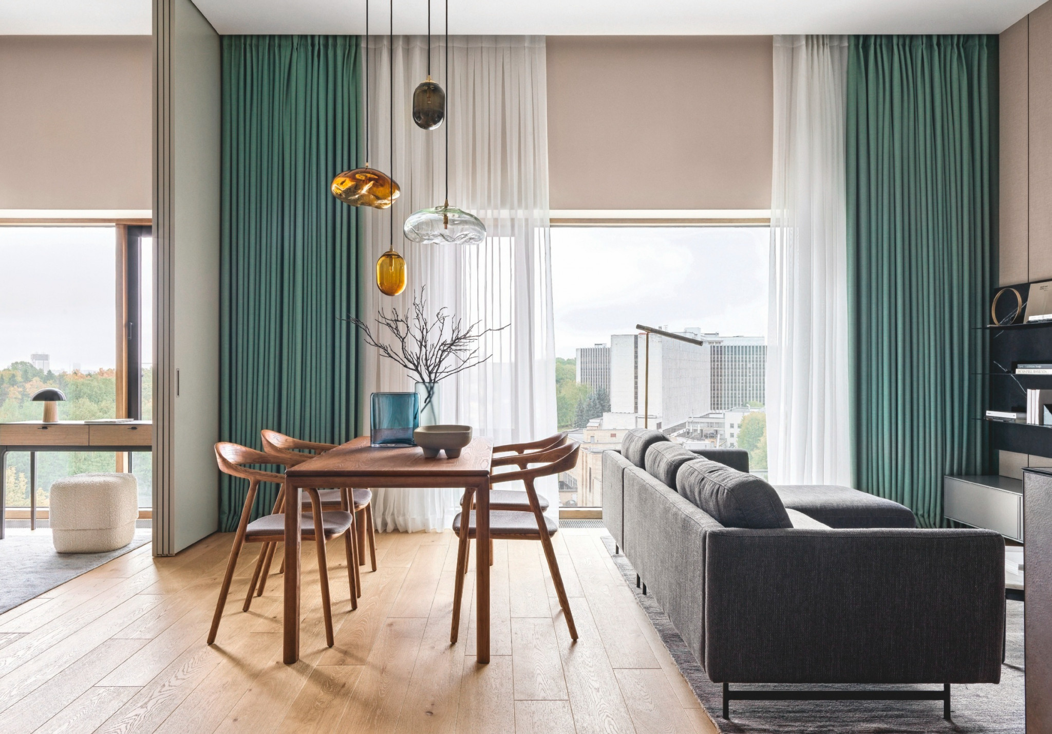 «Увидев объект, мы практически сразу пришли к свободной планировке, потому что просто невозможно закрывать глухими перегородками выразительные окна с таким живописным пейзажем», — рассказывает Ирина. Так родилась концепция «дневного» и «ночного» зонирования интерьера. Днём, когда в квартире максимальное количество света, перегородка в спальне остаётся открытой. А вечером и при приёме гостей закрывается, отделяя спальню и личное пространство хозяина от общей кухни–столовой–гостиной.