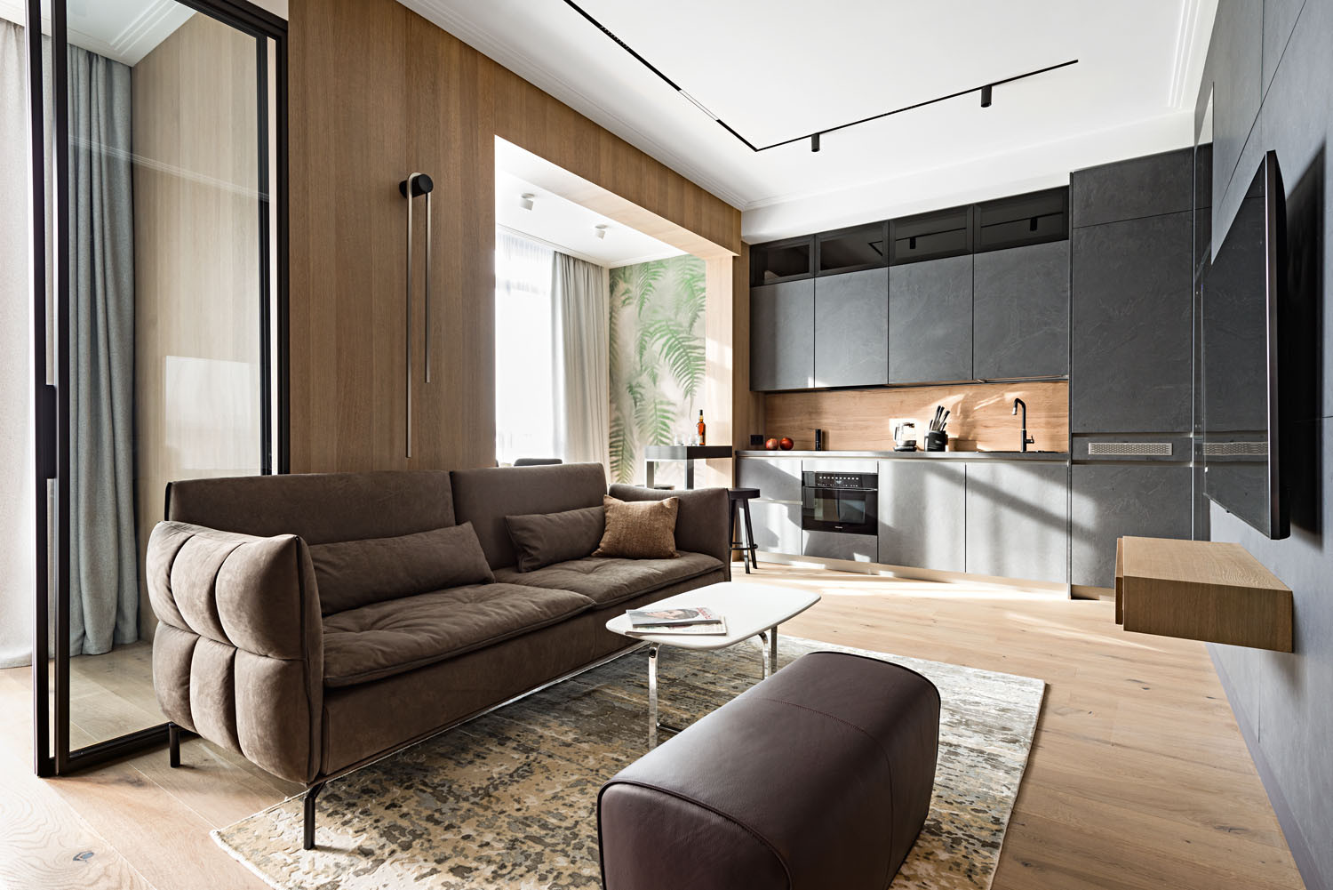 Заказчиком творческого тандема Екатерины Богачик и Натальи Мациенко выступил молодой человек, вернувшийся на родину после окончания учебы в Лондоне для дальнейшей работы и продолжения карьеры. «С самого начала заказчик озвучил свои идеи: интерьер в темных, сложных оттенках, от которого бы веяло брутальностью и шиком, — говорит один из авторов проекта Екатерина Богачик, — Он категорически был против светлой кухни. Важным моментом холостяцкого быта было наличие полноценной обеденной зоны со столом и стульями, а также барная стойка — «…ну хотя бы небольшая!». Ванная комната ему виделась в темном цвете, непременно на сочетании фактуры камня и дерева, и гардеробная за стеклянной перегородкой — это было обязательным условием». Пожелания владельца, который четко знал, чего хочет, стали большим подспорьем к созданию дизайн-концепции.