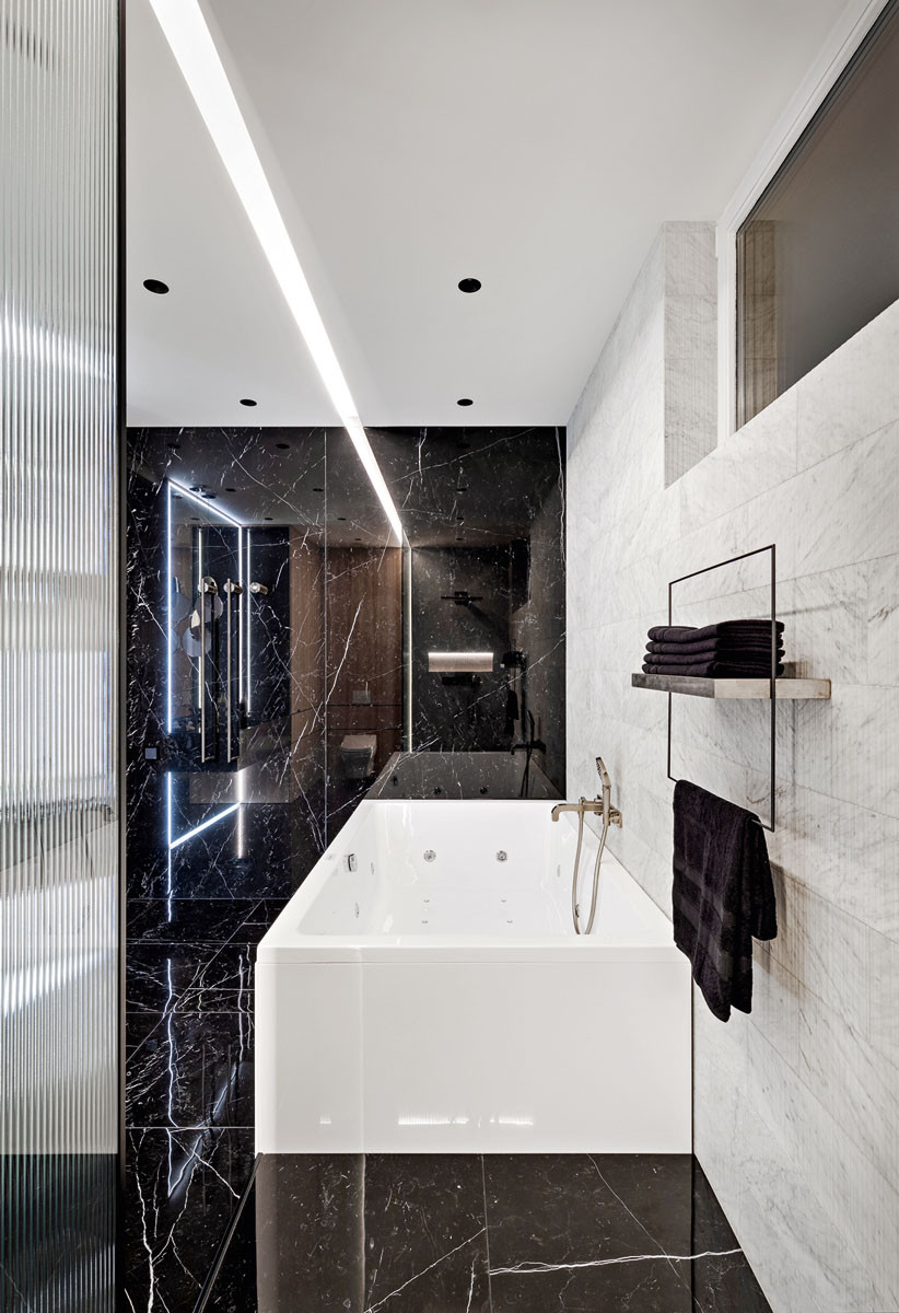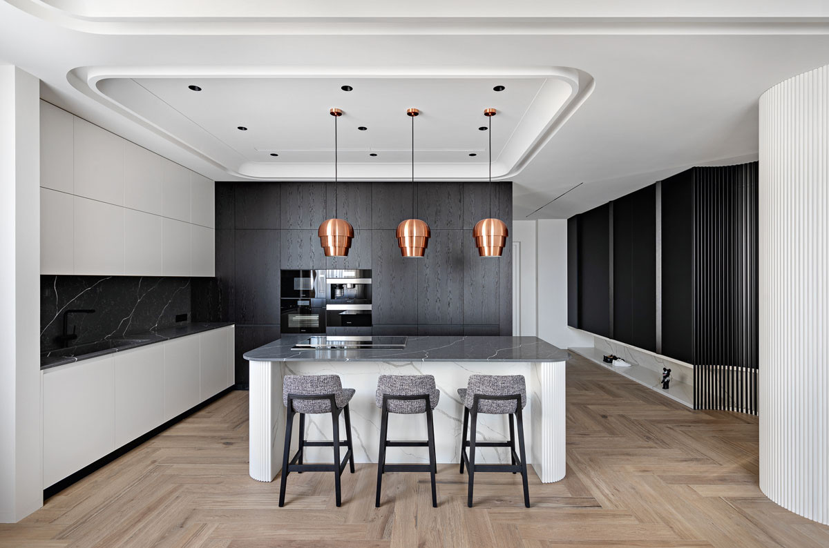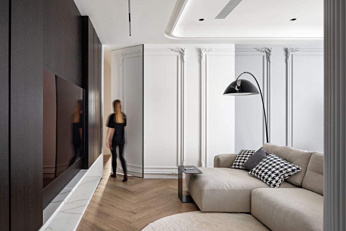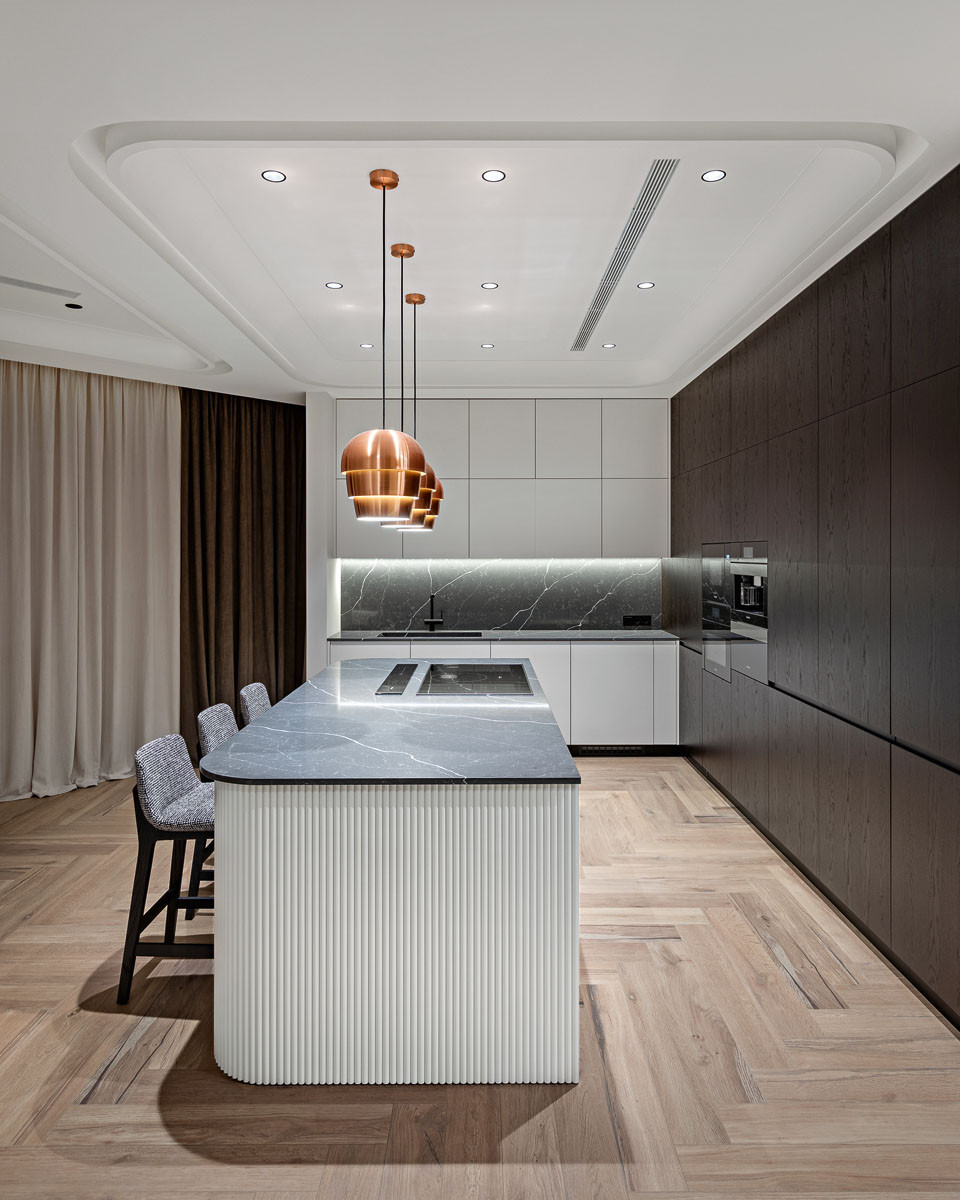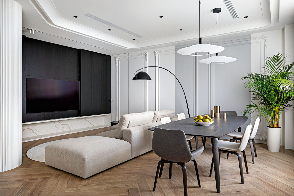 Для комфортной жизни семейной пары пространство разделили на два блока: зону дневного пребывания и ночного. Общественная часть квартиры представляет собой просторную студию–гостиную с кухней и столовой. Приватная часть состоит из спальни, ванной комнаты, гардеробной и гостевой спальни, которая впоследствии может трансформироваться в детскую. Их разделяет короткий тёмный коридор вроде буферной зоны между двумя светлыми объёмами. Конструктивная особенность квартиры — несущая колонна между гостиной, кухней и прихожей, визуально разрывающая пространство. Чтобы нивелировать этот недостаток, колонну декорировали тонкими металлическими стержнями по типу каннелюров, которые сделали квадратное сечение круглым, а благодаря мелкому членению конструкция выглядит легче, чем есть на самом деле. Мотив стержней прослеживается в зоне кухни, где аналогичным образом оформлено основание острова, и на стыке гостиной и прихожей, только здесь белые стержни заменены на чёрные (в цвет фасадов шкафов), и создают они уже не объём, а пустоты, эффектно подсвеченные изнутри. Вертикальный ритм вообще основная тема в интерьере. Одна из стен гостиной украшена тонким лепным декором в виде больших рам, который маскирует дверь в коридор, ведущий в приватную часть. Мало того что двери доходят до потолка, тонкие рамки появляются и в спальне в виде элементов шпонированной панели.