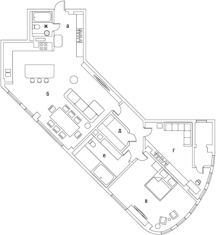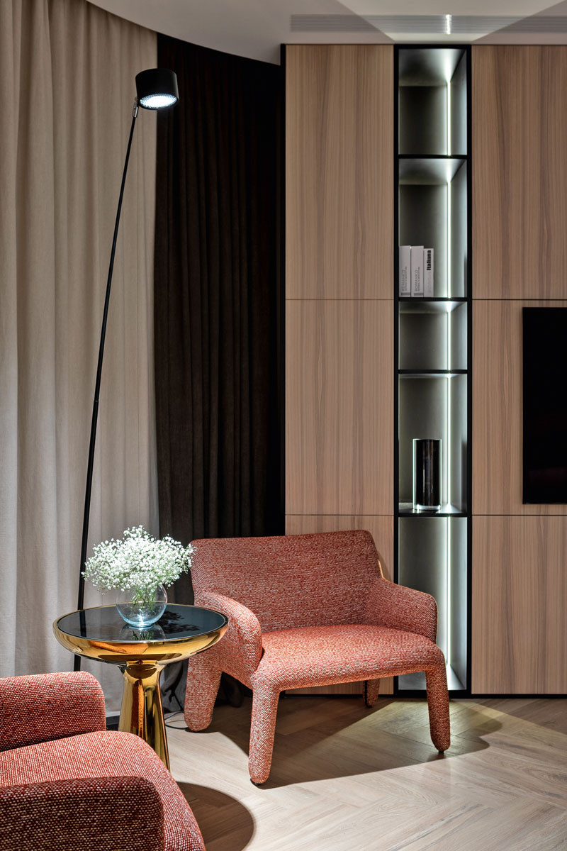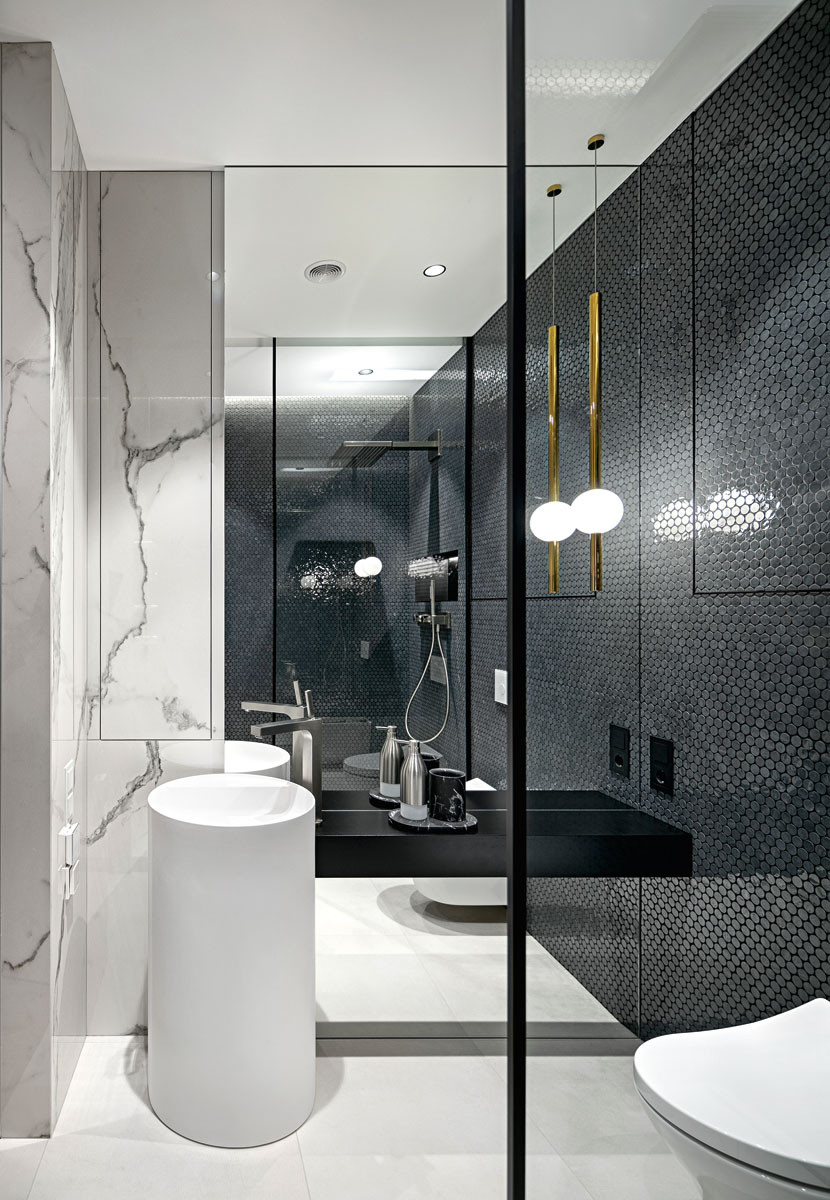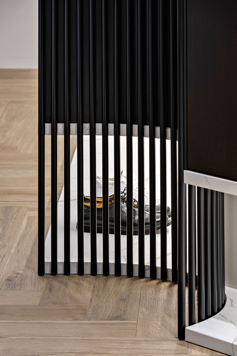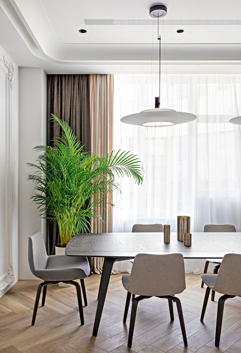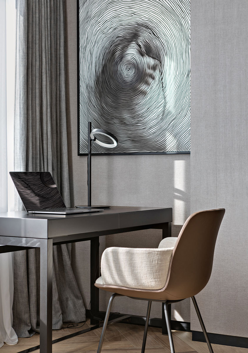 Для комфортной жизни семейной пары пространство разделили на два блока: зону дневного пребывания и ночного. Общественная часть квартиры представляет собой просторную студию–гостиную с кухней и столовой. Приватная часть состоит из спальни, ванной комнаты, гардеробной и гостевой спальни, которая впоследствии может трансформироваться в детскую. Их разделяет короткий тёмный коридор вроде буферной зоны между двумя светлыми объёмами. Конструктивная особенность квартиры — несущая колонна между гостиной, кухней и прихожей, визуально разрывающая пространство. Чтобы нивелировать этот недостаток, колонну декорировали тонкими металлическими стержнями по типу каннелюров, которые сделали квадратное сечение круглым, а благодаря мелкому членению конструкция выглядит легче, чем есть на самом деле. Мотив стержней прослеживается в зоне кухни, где аналогичным образом оформлено основание острова, и на стыке гостиной и прихожей, только здесь белые стержни заменены на чёрные (в цвет фасадов шкафов), и создают они уже не объём, а пустоты, эффектно подсвеченные изнутри. Вертикальный ритм вообще основная тема в интерьере. Одна из стен гостиной украшена тонким лепным декором в виде больших рам, который маскирует дверь в коридор, ведущий в приватную часть. Мало того что двери доходят до потолка, тонкие рамки появляются и в спальне в виде элементов шпонированной панели.