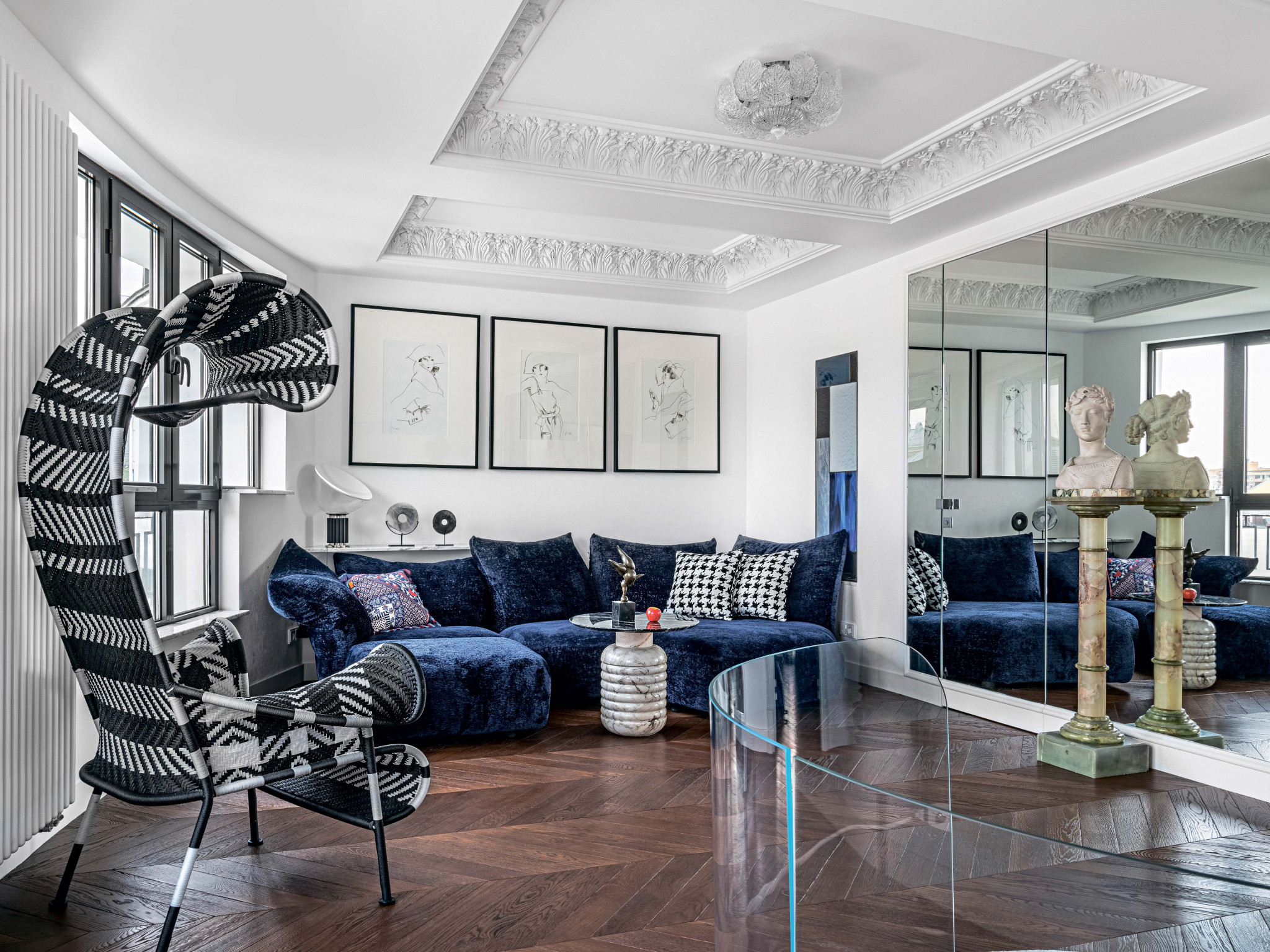 Сейчас сложно себе представить, что на месте этого элегантного пространства, объединившего классику и современность, раньше была типичная «холостяцкая квартира» немудрёной планировки. Посоветовавшись, супруги решили, что здесь нужно будет снести всё до бетона и создать эргономичный, стильный и функциональный интерьер. Уже через 6 месяцев он был закончен. «Мы вообще любим сочетать в своих проектах вещи разных эпох, а в собственной квартире мы экспериментировали, смело смешивая приёмы и предметы, — рассказывает Ксения Круглова. — Единогласно решили использовать в оформлении квартиры классическую базу — как отражение исторического облика здания и атмосферы района».