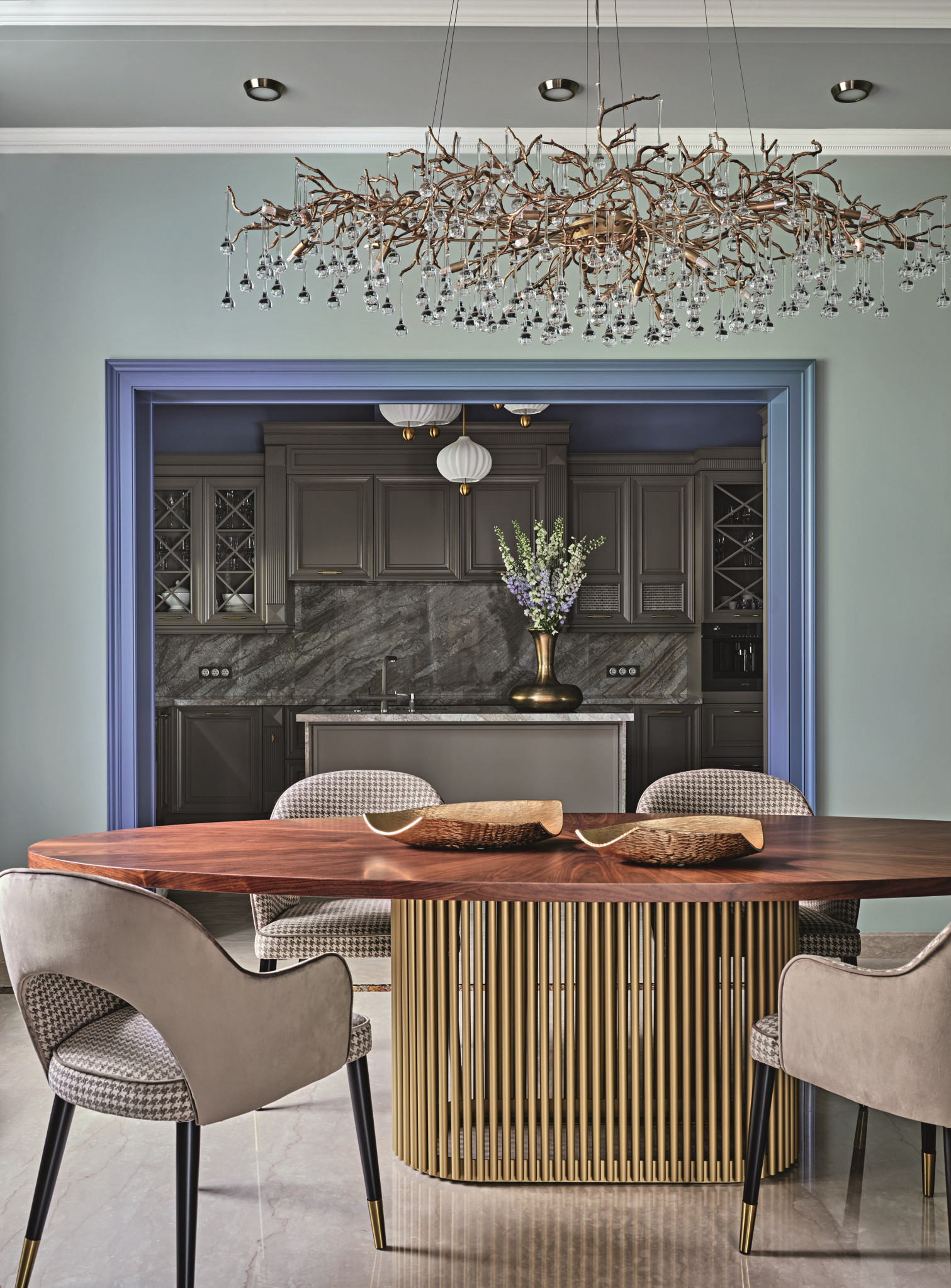 Участок с домом имеет только одного смежного соседа, что позволило правильно организовать видовые зоны и собственный выход в лес. К заказчикам часто приезжают родственники и друзья, поэтому дизайнер придумала много вариантов общественных и приватных пространств для семьи и гостей. Ниже основного уровня первого этажа спроектирована гостиная, в которую можно по ступеням спуститься из столовой. Этот приём вкупе с высокими потолками и парадной люстрой делает эту комнату ещё более торжественной. Также на первом этаже расположились основная и сезонная гардеробные, гостевой сан узел в английском стиле с отдельными кранами горячей и холодной воды. В спа- зону с хаммамом и сауной можно попасть прямо из дома, не выходя на улицу, а летом — полностью открывать окна бассейна и наслаждаться свежим воздухом. В приватном блоке спланированы семь спален и восемь санузлов, три из них — для родителей и двух дочерей. Сначала заказчики хотели дом в стиле современной классики в нейтральных мягких тонах. Но дизайнер предложила быть смелее и добавить цвет, в итоге после десятка выкрасов хозяева согласились на интерьеры в лазурно-зелёной гамме.