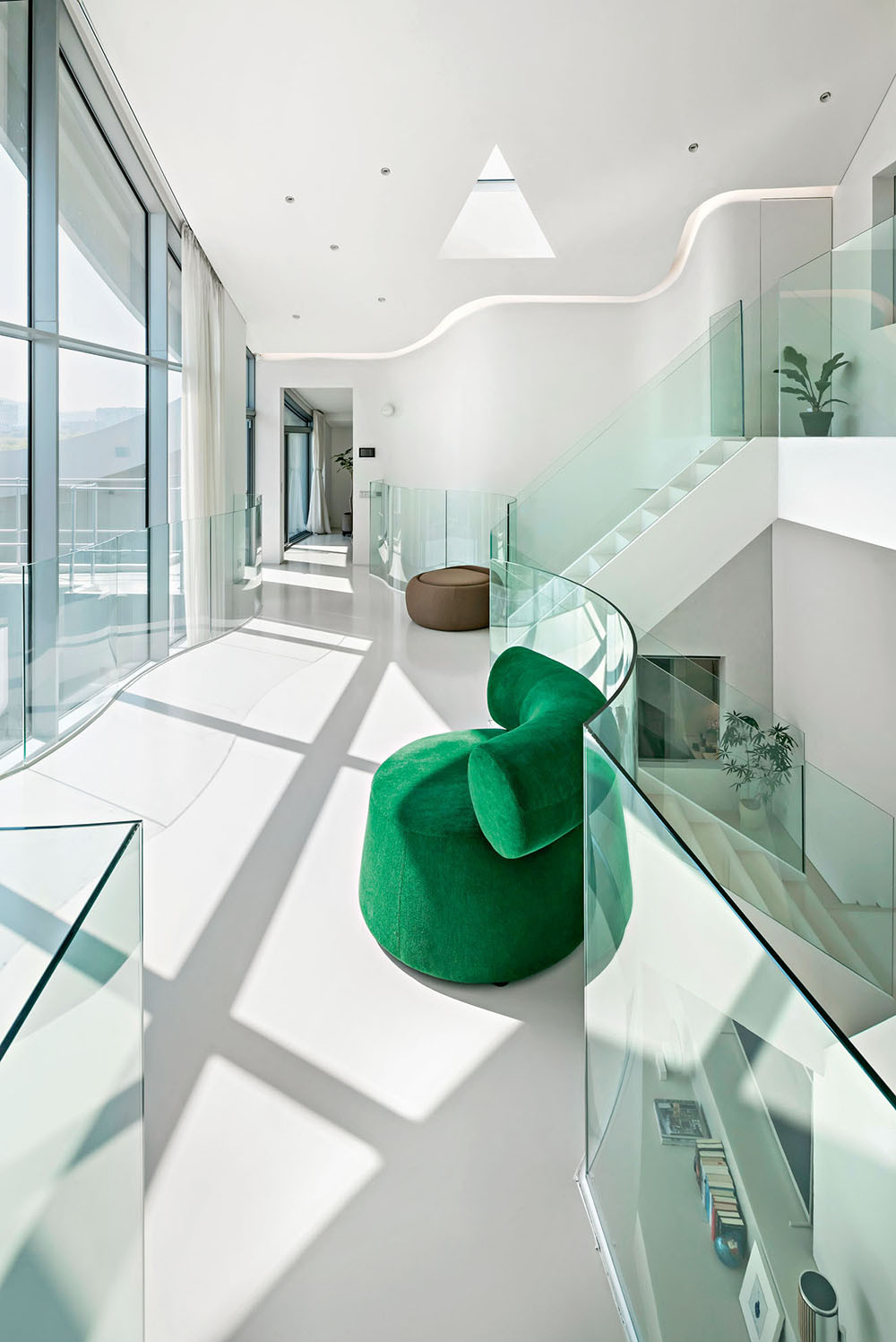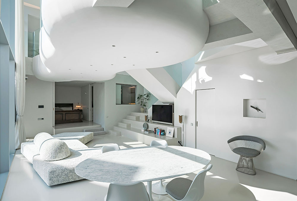 Художественный образ, которым руководствовался Ким Хё-Ман, — облако. «Название проекта — HO-UN — буквально означает «Облако над озером». Оно идеально подходит для легкого, парящего дома с невесомой крышей», — говорит автор проекта. Сам дом представляет собой сложное многоуровневое пространство — оригинальные конструктивные решения сочетаются с ощущением простора и воздуха. На трех уровнях расположились четыре спальни, большая кухня-гостиная и уединенная зона под крышей. Динамика — визитная карточка студии: мостики и переходы соединяют помещения на этажах разной высоты, а диагональные и волнистые линии задают ритм. На третьем уровне, над гостиной, архитектор расположил зону в необычной форме облака — по его задумке, здесь может собираться вся семья.