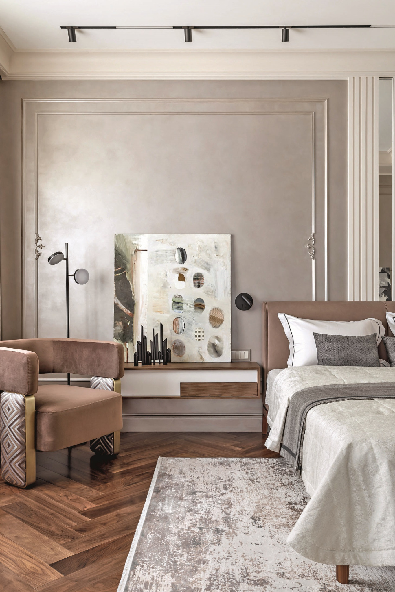 Спальня хозяев. Здесь центральным элементом компози- ции служит кровать (Bizzotto Italia) с мягким «обнима- ющим» изголовьем. Геометрия текстиль- ных панелей на стене за изголовьем также подчеркнуто мягкая: главный мотив — арка. В эркерной части спальни устро- или уютный уголок для отдыха — кресла (DV Home Collection) с кофейным столиком