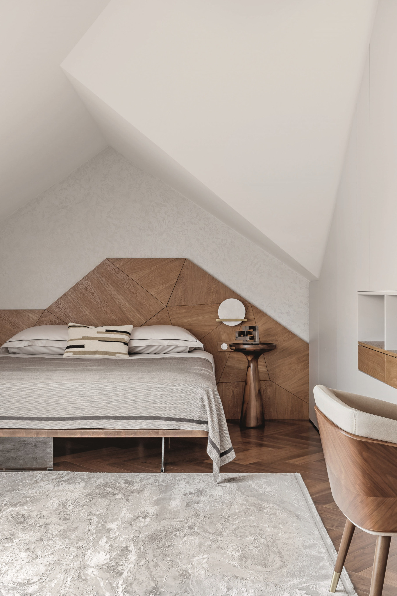 Функционально дом разделен на несколько зон. Первый этаж — место, где собирается вся семья, куда приходят гости. Это кухня, столовая и гостиная с камином. Второй этаж — приватный. Там расположены блок хозяев (спальня со своими гардеробной и санузлом), кабинет главы семьи, а также спальни сына и дочери. Мансардный этаж задуман как территория детей заказчиков и их друзей: «дом в доме» со своими мини-кухней, гардеробной, санузлом, гостиной, спальней и тренажерным залом. Интерьеры первого и второго этажа получились легкими и воздушными, при этом стилистически многослойными: автор проекта миксовала в разных пропорциях ар-деко, классицизм, современный стиль, а кое-где прибавляла богемного французского флера. Что касается мансардного этажа, его интерьер напоминает об альпийском шале — некоторыми деталями, тонко, ненавязчиво. Например, в гостиной это панно с силуэтом горного массива, поросшего лесом, а в спальне — изголовье кровати, сложенное из деревянных фрагментов. Человеку с воображением абрис изголовья напомнит линию горных хребтов.