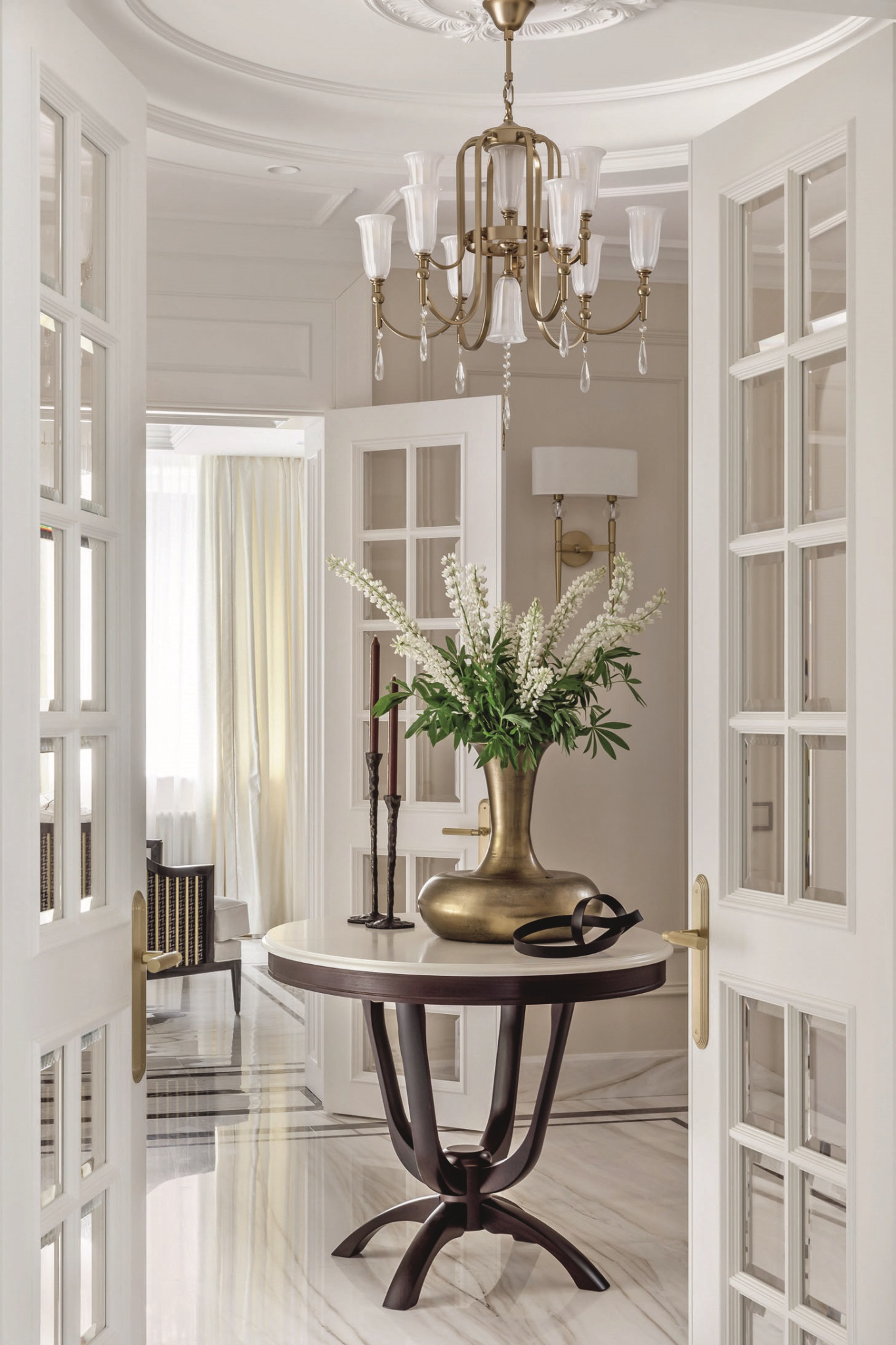 Вид на парадный холл от кухни. За дверями напротив — гостиная. Холл и прихожая нанизаны на единую ось, а кухня и гости- ная — на другую. Красивое решение: на пересечении осей, в центре первого эта- жа, поставили круглый стол с декоративной композицией. Двери, эксклюзивное ме- бельное производство INTERIO GRAND