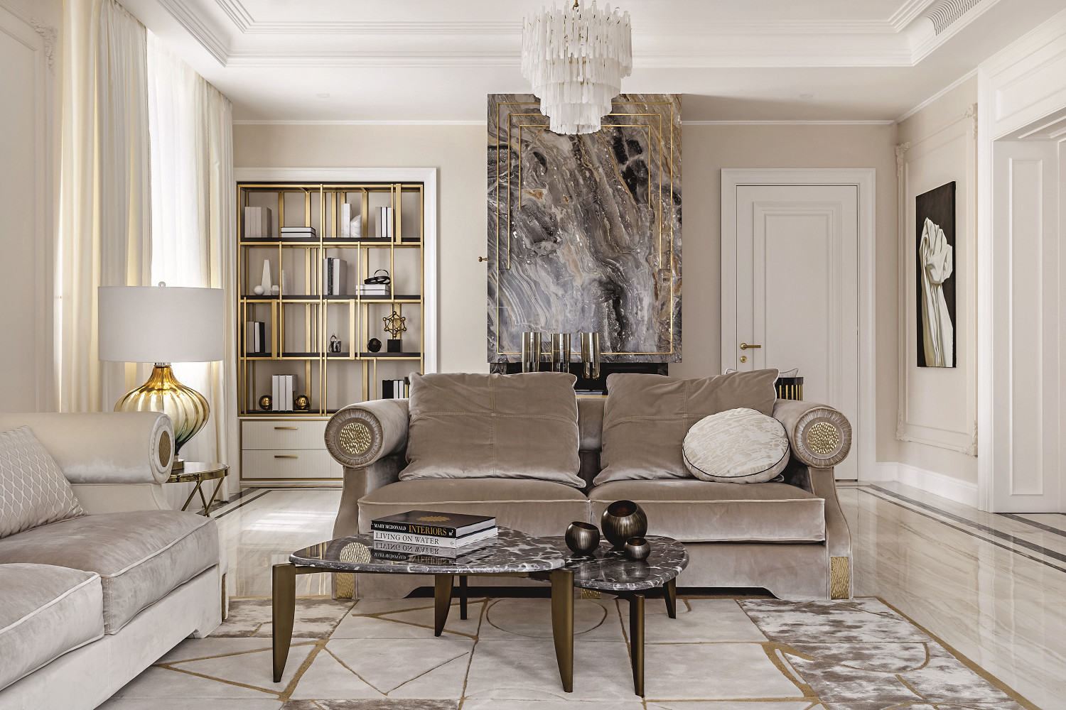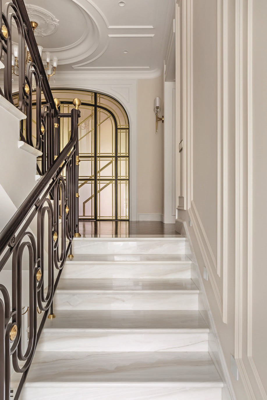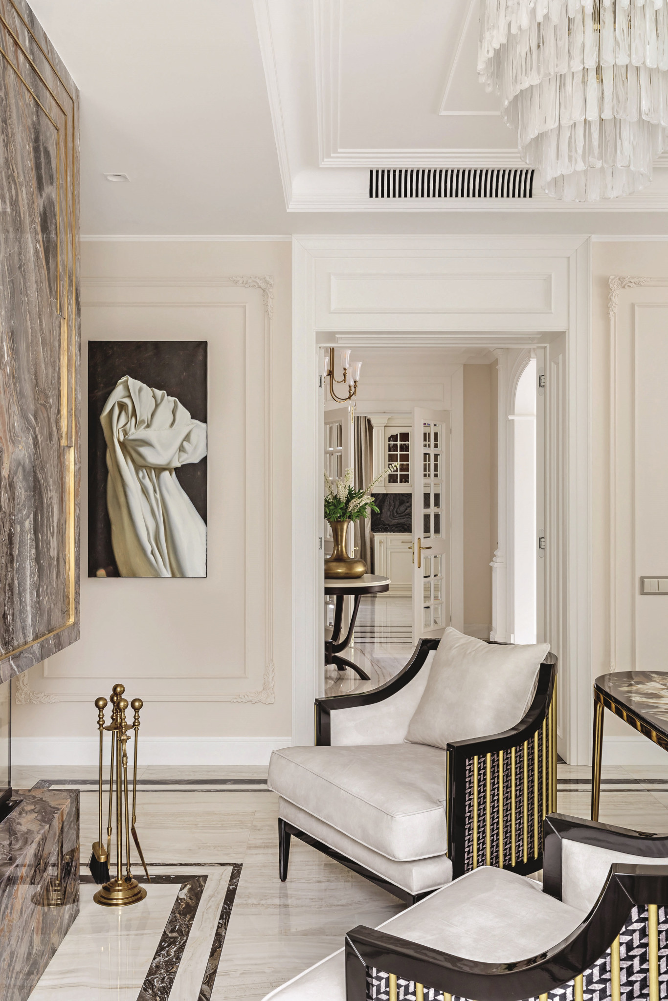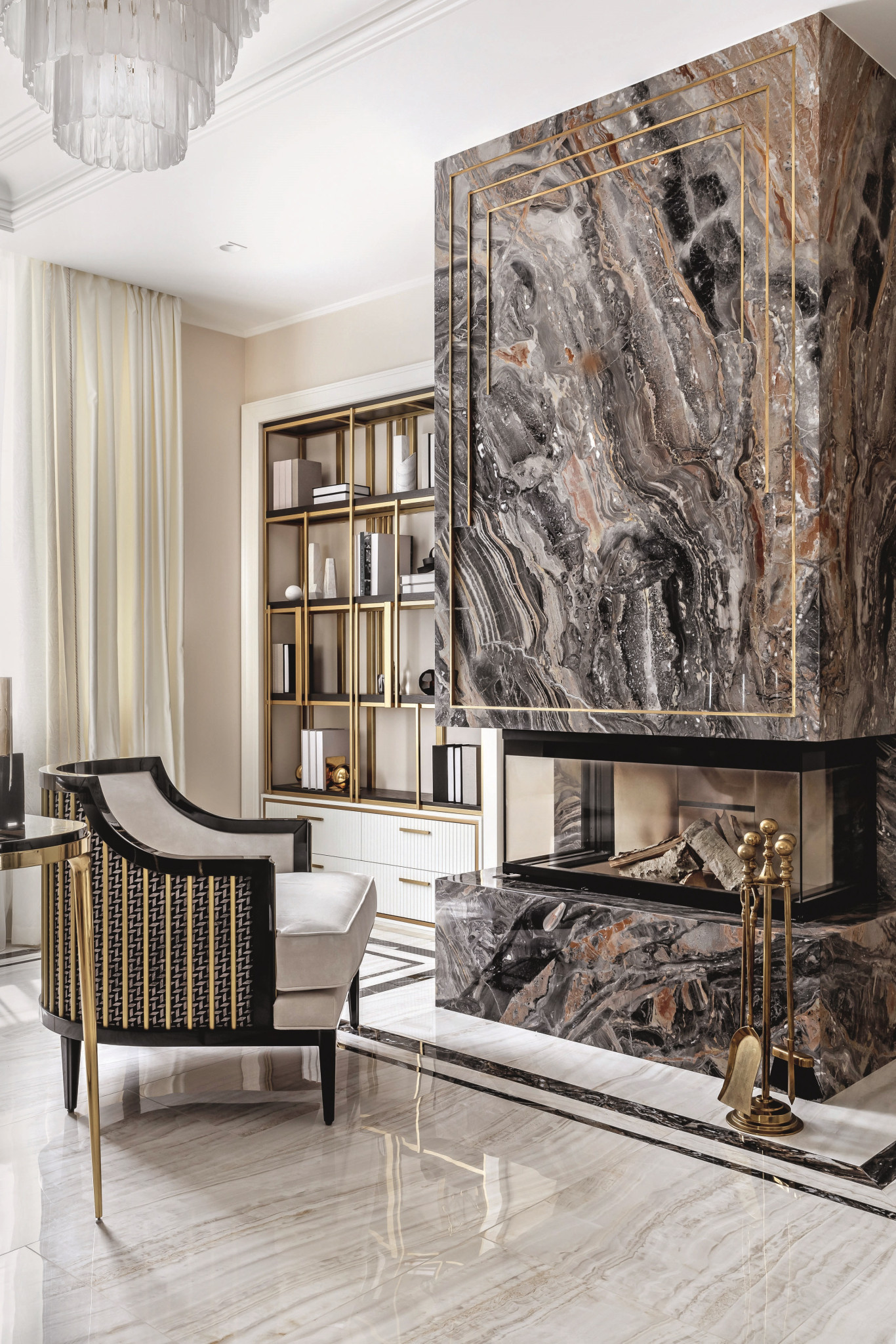 «Важным критерием в создании изысканного по характеру интерьера было использование натуральных материалов — дерева, латуни, мрамора, — отмечает автор проекта. — Так, в центре композиции гостиной — большой камин, облицованный мрамором Arabescato Orobico, который мы выбирали вместе с заказчиками: он превосходно справился с ролью доминанты, не перегрузив при этом легкий воздушный интерьер».