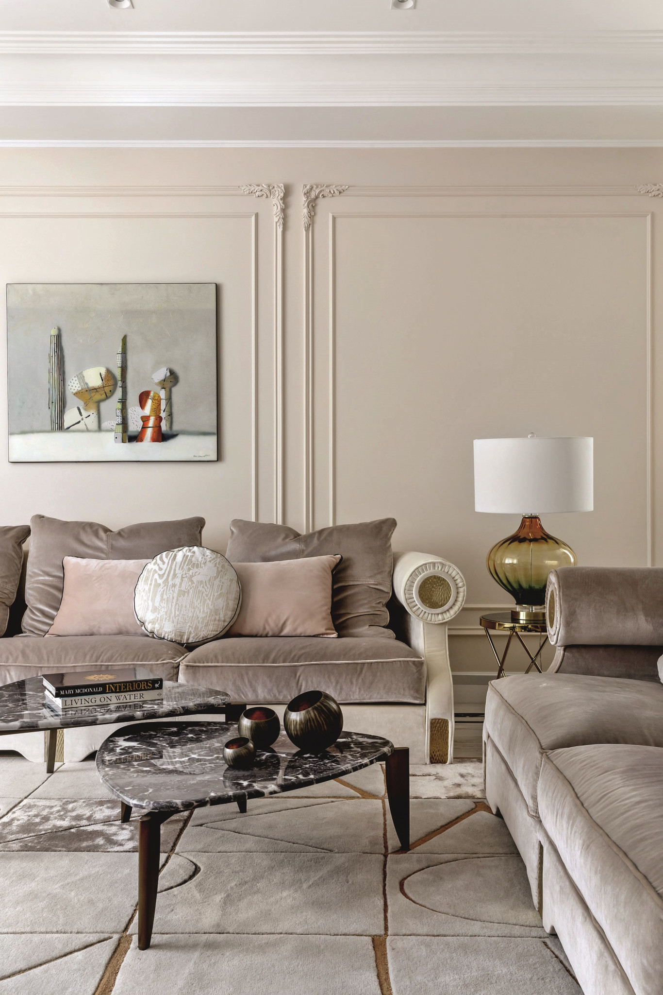 Гостиная поделена на две части: каминную (на странице слева) и ТВ-зону (на этой странице). В ТВ- зоне — кофейные столики со столеш- ницами из мрамора и диваны по дизайну Giuseppe Iasparra (Longhi). Над дива- ном — картина «Ар- хитектурный мотив» Василия Власова, слева от дверного проема — работа «Белое-33» Виктора Пономаренко (обе картины — галерея SMART). Совре- менное искусство эффектно контра- стирует в интерьере с лепными молдинга- ми и величественны- ми порталами в духе неоклассики. Пол отделан мрамо- ром, а это по ощуще- нию прохладный ма- териал. «Согревают» интерьер гостиной бархатные обивки диванов и ковер из шерсти и шелка. На полу в ТВ-зоне — ковер Art de Vivre by DETALI по дизайну Ирины Татарниковой: в геометрический узор вплетены буквы русского алфавита