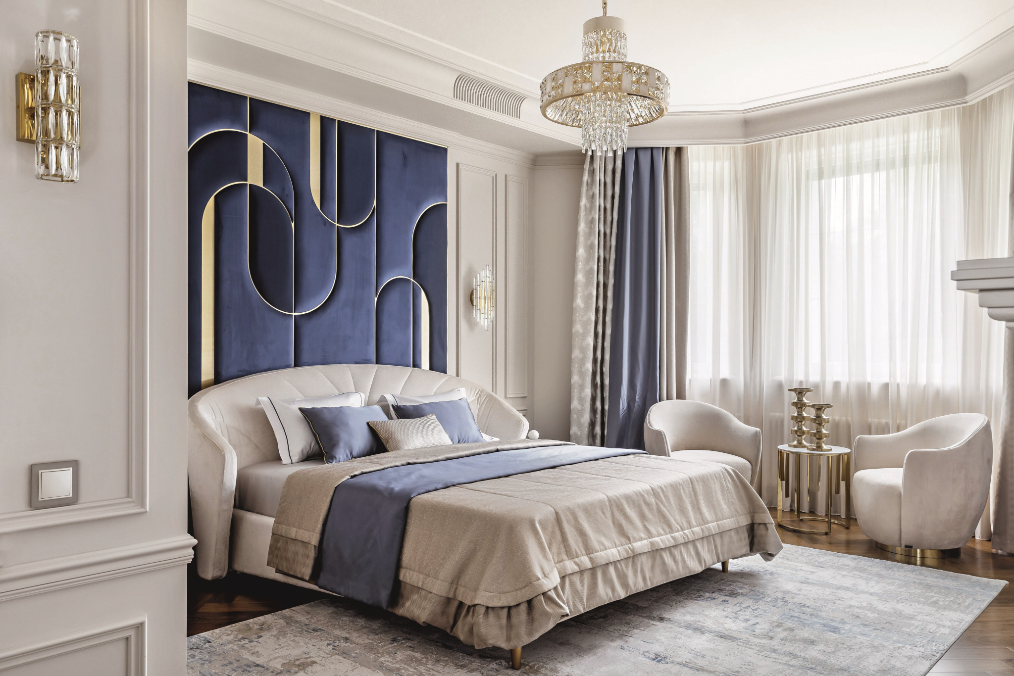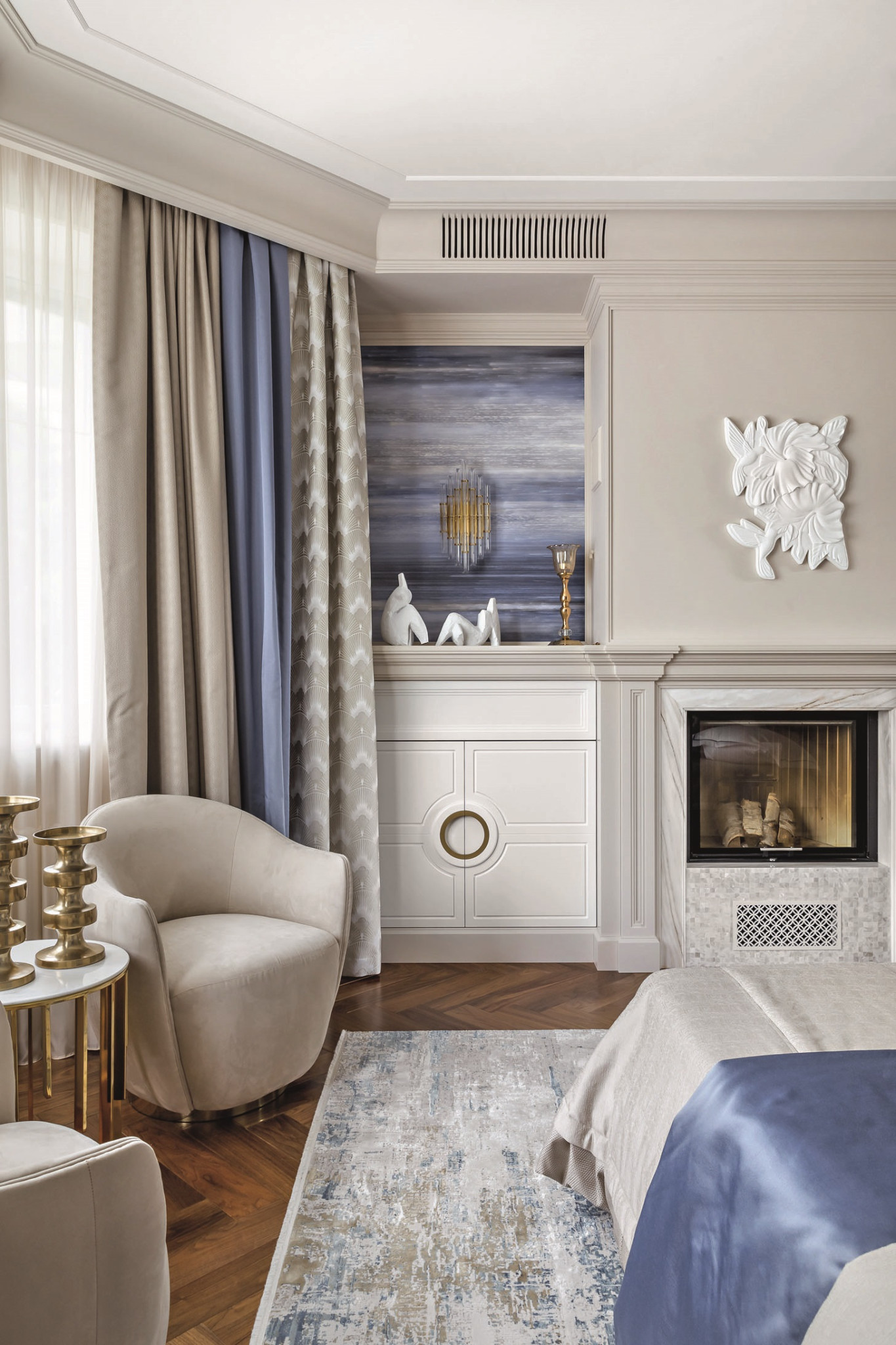 Цветовая гамма общих зон — благородное сочетание бежево-сливочных оттенков с черными и темно-коричневыми акцентами. В главной спальне — серо-бежевые стены и мебель, а в качестве акцента использовали глубокий синий цвет летнего ночного неба (таково было пожелание хозяев). Его мы видим на мягком панно за изголовьем кровати, на шторах и на панно по сторонам камина. По авторским эскизам изготовили двери, порталы, встроенную мебель. Например, для главной спальни разработали симметричную композицию с комодами и камином. Пришлось задействовать несколько подрядчиков одновременно: столярную компанию, поставщика мрамора для камина, мастеров по монтажу гипса и паннофрески. Зато композиция получилось гармоничной и эффектной. И главный итог: интерьер вдохновляет.