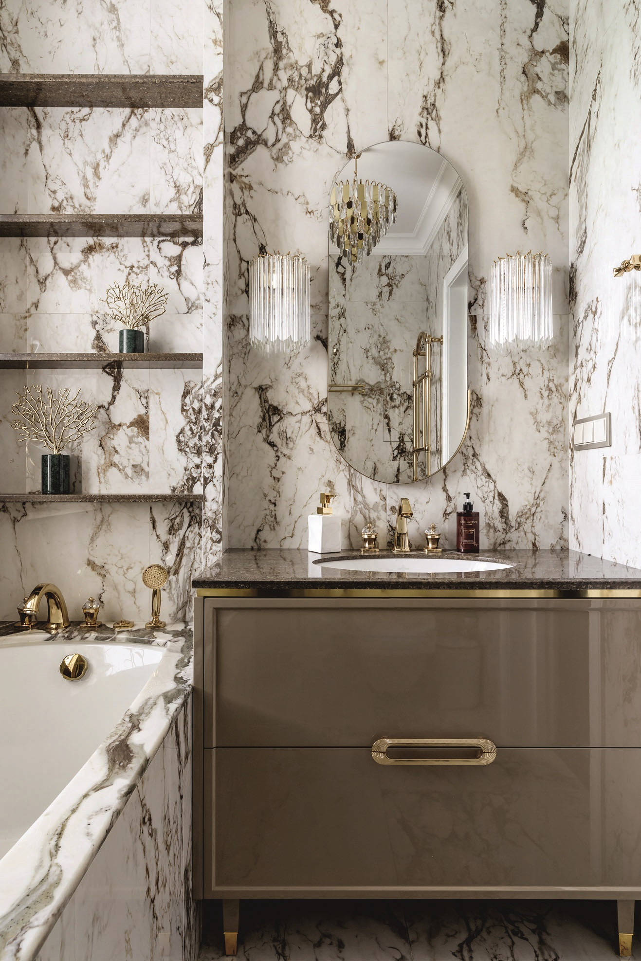 Ванная комната при спальне хозяев де- корирована мрамо- ром с красивейшим природным рисунком цвета кофе со сливка- ми. Мраморный бортик ванны и мраморные торцы стеллажа — смотрятся просто шикарно и много говорят о внимании автора проекта и хозя- ев к деталям