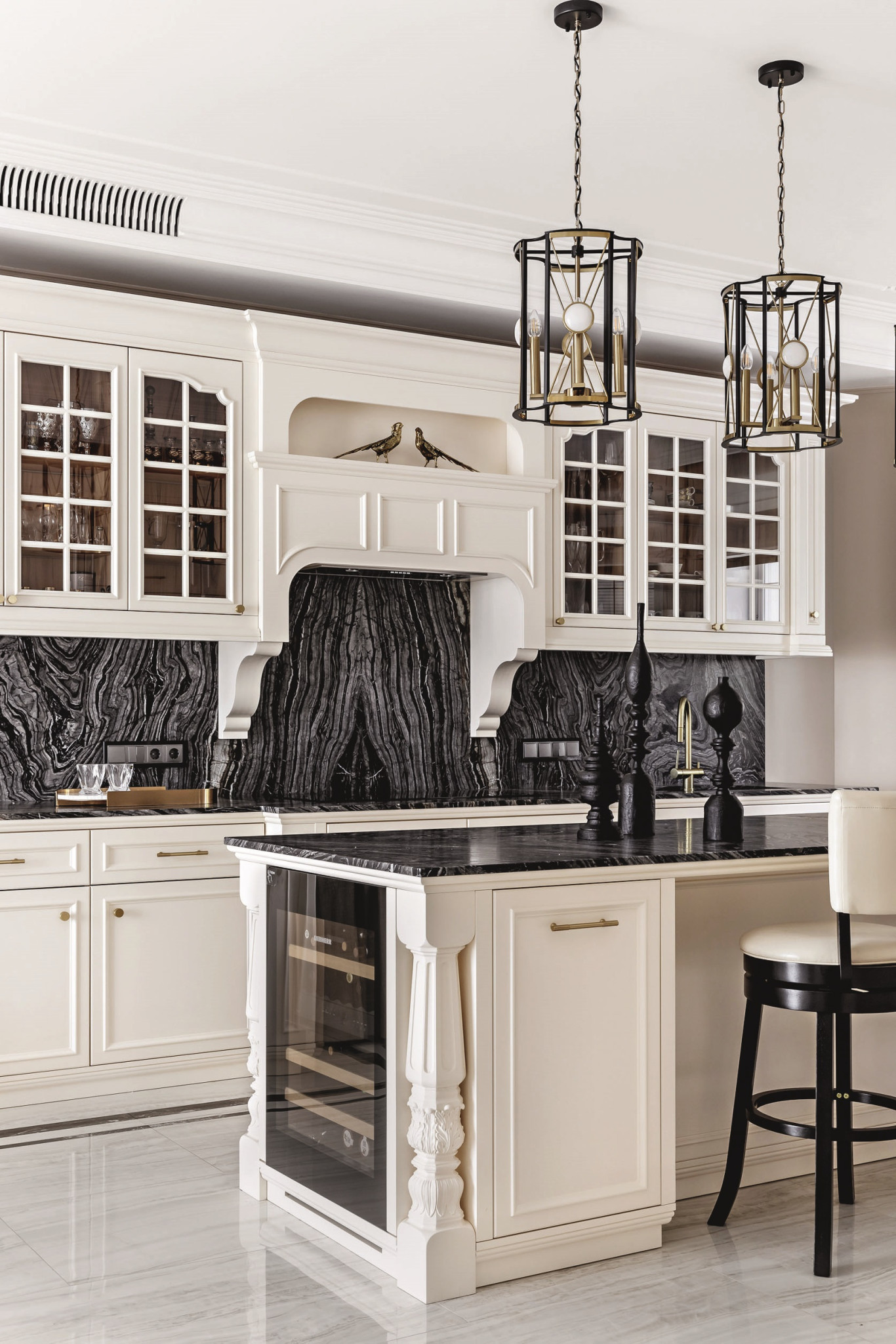 Кухня. Фартук из темного мрамора под- черкивает изящество светлой неокласси- ческой мебели. Два фронта основных шкафов расположены друг напротив друга, между ними — остров. Здесь есть неболь- шой обеденный стол, но основная обеден- ная зона находится в смежном с кухней остекленном помеще- нии. Кухня выполнена на заказ эксклюзив- ным мебельным про- изводством INTERIO GRAND
