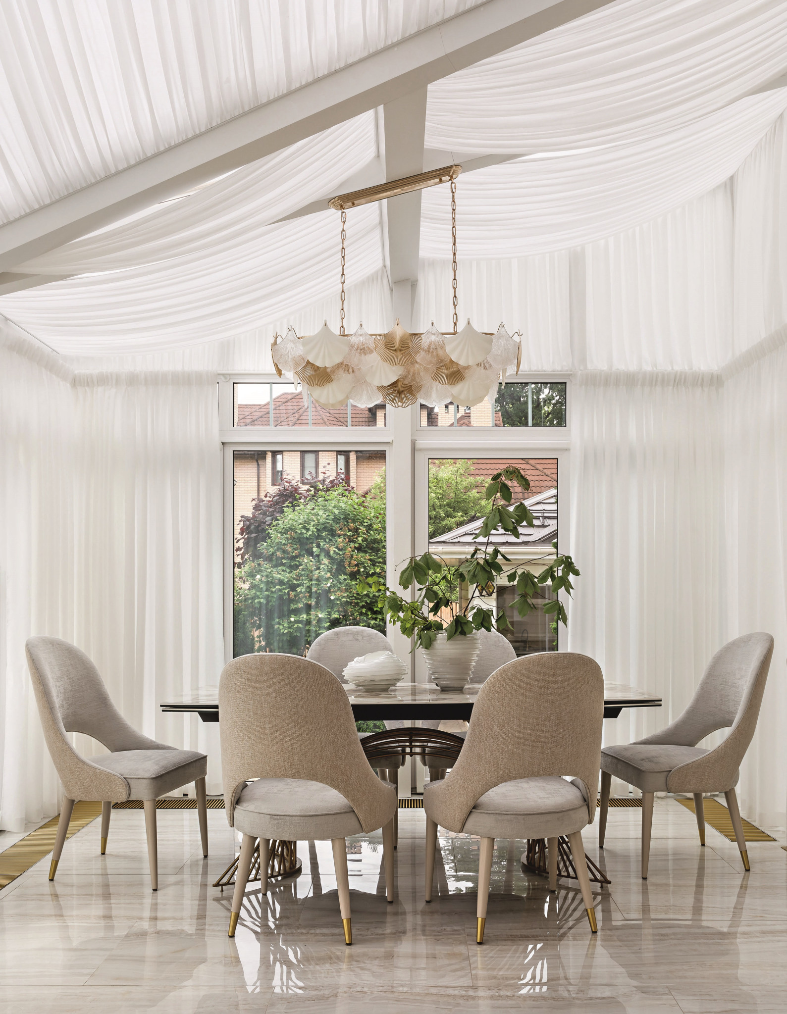 Основ- ная столовая залита естественным светом благодаря сплошному остеклению. Чтобы смягчить свет, стены и потолок задрапиро- вали белой тканью. Ничего лишнего: толь- ко обеденный стол, стулья и лаконичная люстра в духе ар-деко