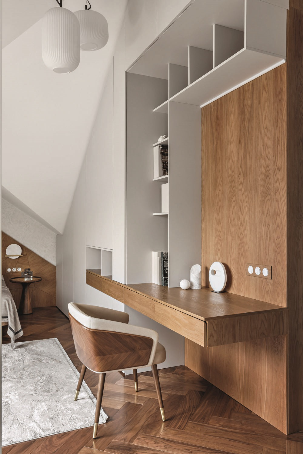 Кабинетная зона в гостевой спальне, кажется, вырастает из стены — настолько гармонично смотрятся вместе стол и стеллаж. Они, как и многое в этом доме, сделаны по авторским эскизам Юлии Стоя- новой. Шпон дерева в тон паркету создает спокойную, умиротво- ряющую атмосферу