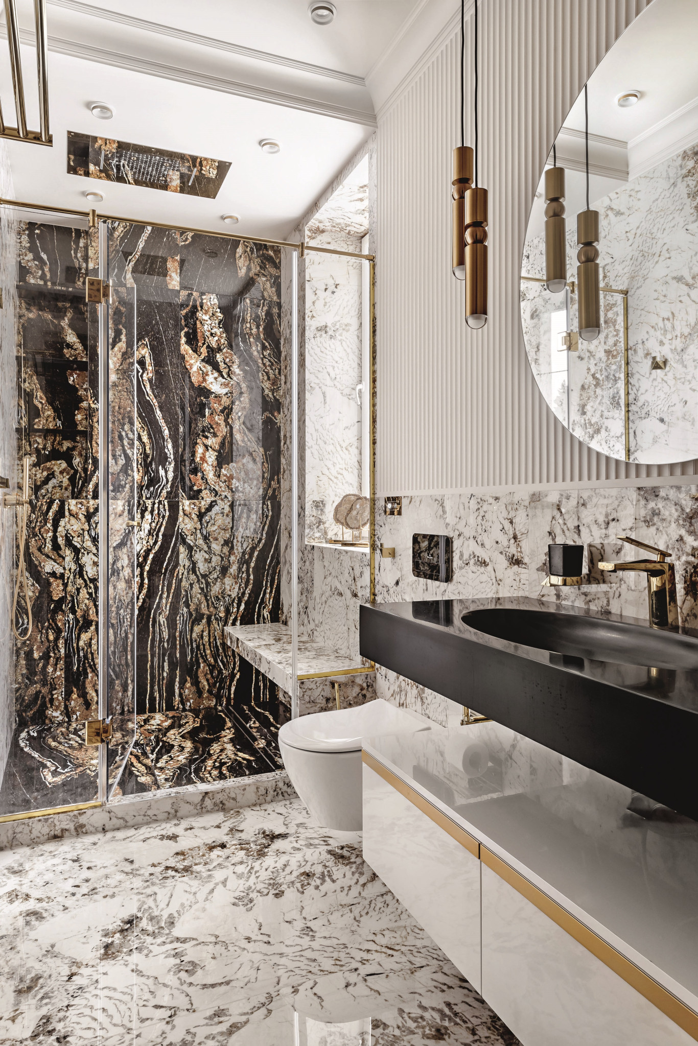 Гостевой санузел на втором этаже впечатляет мрамор- ной отделкой стен и пола: это крупно- форматные панели, уложенные таким об- разом, что рисунок по характеру получился очень энергичным, текучим, бурля- щим. Его несколько «успокаивают» гладкие монохромные поверхности шкафа и лепной декор в виде полосок в верхней части стены