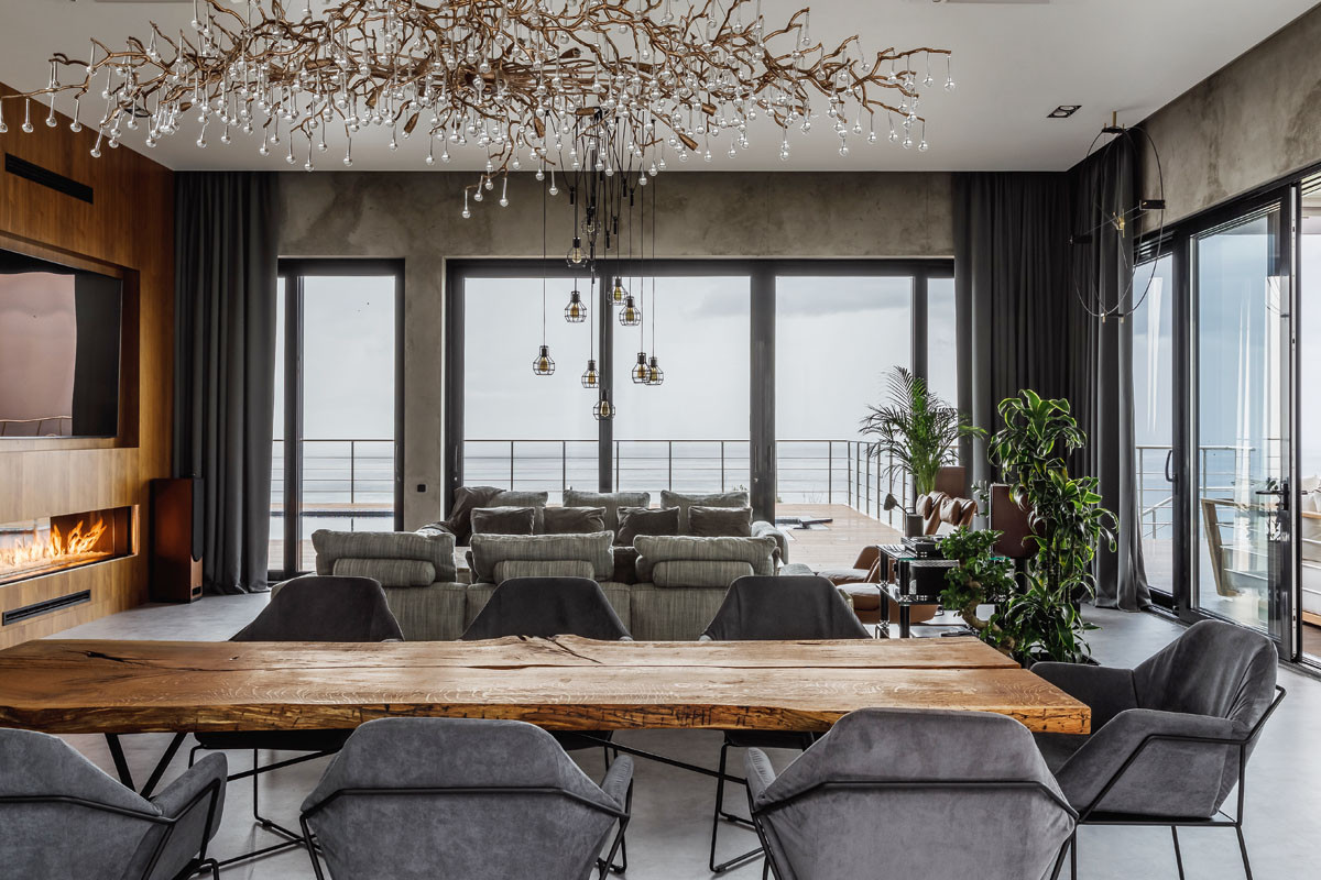 Заказчик, обладающий хорошим вкусом, идущий в ногу со временем, обратился в студию JPArchitect за помощью в реализации своих задумок и мыслей в интерьере. Когда Елена Паунич и её команда попали на объект, дом был построен и представлял собой готовый бетонный каркас. «Форма здания была проста и сложна одновременно, — вспоминает автор проекта. — Такое решение обусловлено непростым рельефом. Все постройки в городе архитекторы сегодня стараются вписать в окружающий контекст — гористая местность диктует свои правила. По такому же принципу спроектировано и наше здание: дом каскадом спускается сверху вниз. Парковка находится на девять метров ниже первого этажа дома — в цокольной части, под землёй. А за жилыми этажами возвышается большая подпорная стена, держащая верхний склон. Связующий стержень конструкции — лифтовая шахта с лестницей. Под землёй, ниже первого этажа, стены лифтовой шахты — бетонные, на поверхности их продолжает стена из стекла, открывающая невероятный вид на бескрайнюю морскую гладь». Открытый конструктивный каркас в ходе перестройки остеклили, использовав для этого термоизоляционное стекло SUNGLASS с серым фотофильтром. Раздвижные окна в пол можно открыть, объединив таким образом экстерьер и внутреннее пространство. Фасад дома отделали композитными панелями на металлической основе.