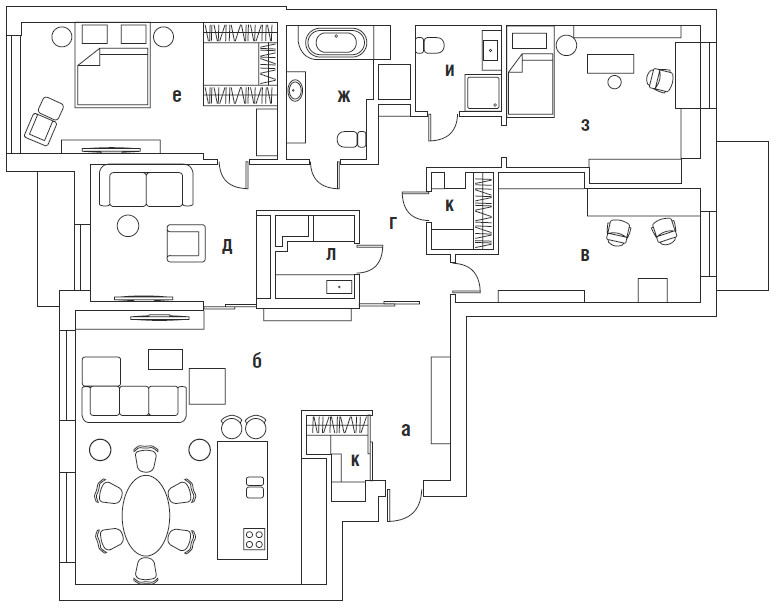 Планировка чёткая и ясная. Пространство состоит из приватного блока со спальнями и ванными комнатами и общественного с кухней–столовой и гостиной зоной. Между ними — стеклянные перегородки, которые позволяют полностью закрыть или открыть приватную часть, если это необходимо. Продуманно и рационально пространство обустроено и в плане быта: в квартире предусмотрено большое количество систем хранения, от отдельных гардеробных комнат, встроенных шкафов, стеллажей и полок до хозпомещения — постирочной.