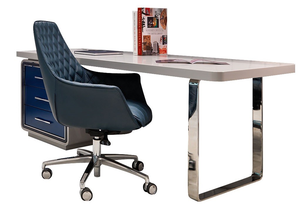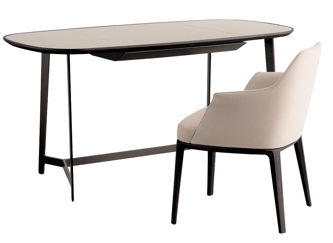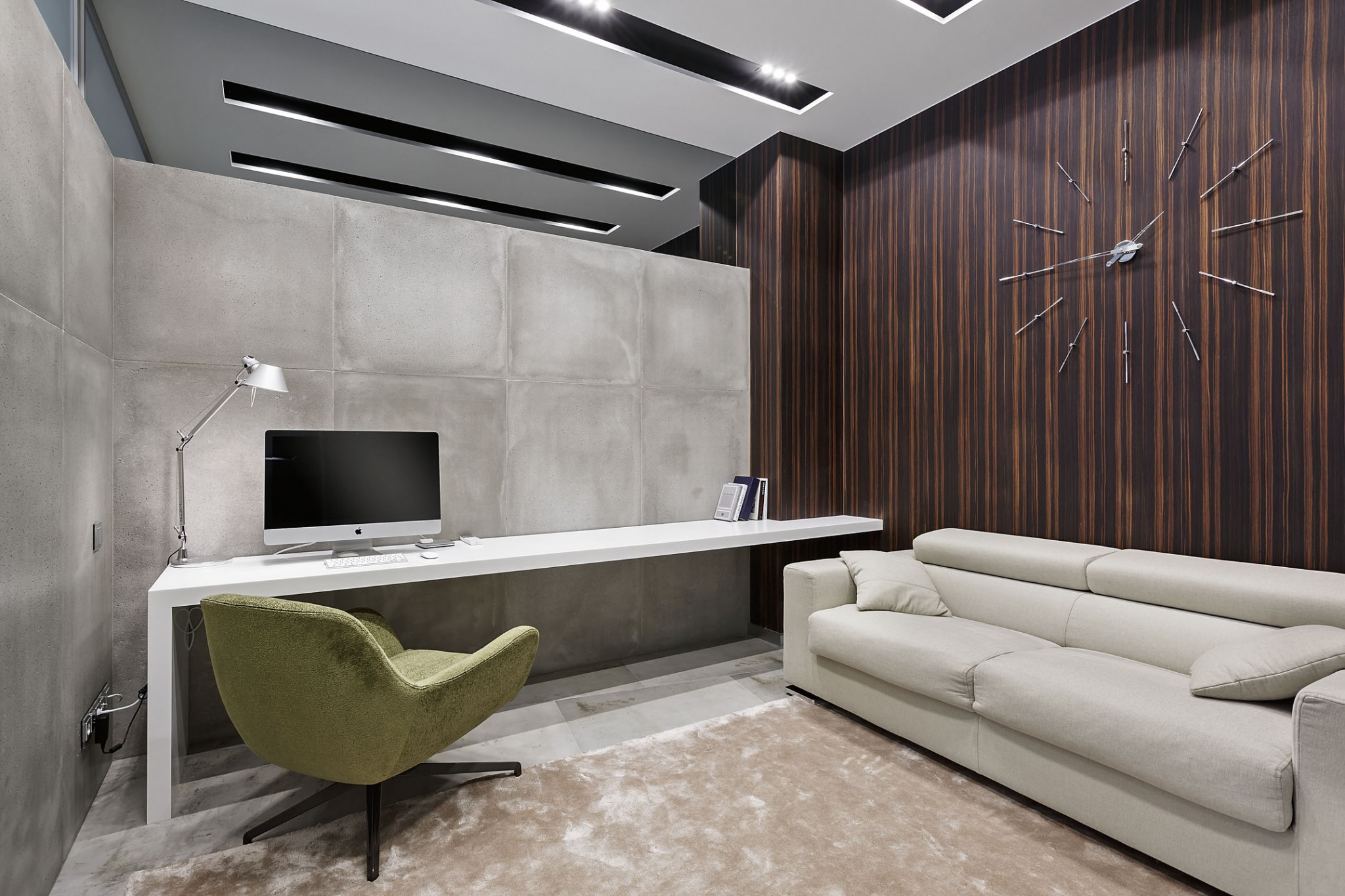 Дизайнер Наталия Сморгонская: Интерьер всего дома выполнен в стиле минимализм. В его оформлении активно используются бетонные фактуры, и кабинет хозяина дома не стал исключением. Интересная деталь: бетонная стена стыкуется с тонированным зеркалом, а также стеклом, через которое просматривается гостиная. Это усложняет пространство, позволяет избежать эффекта замкнутости и обеспечивает доступ дневного света. При необходимости стекло можно сделать матовым».