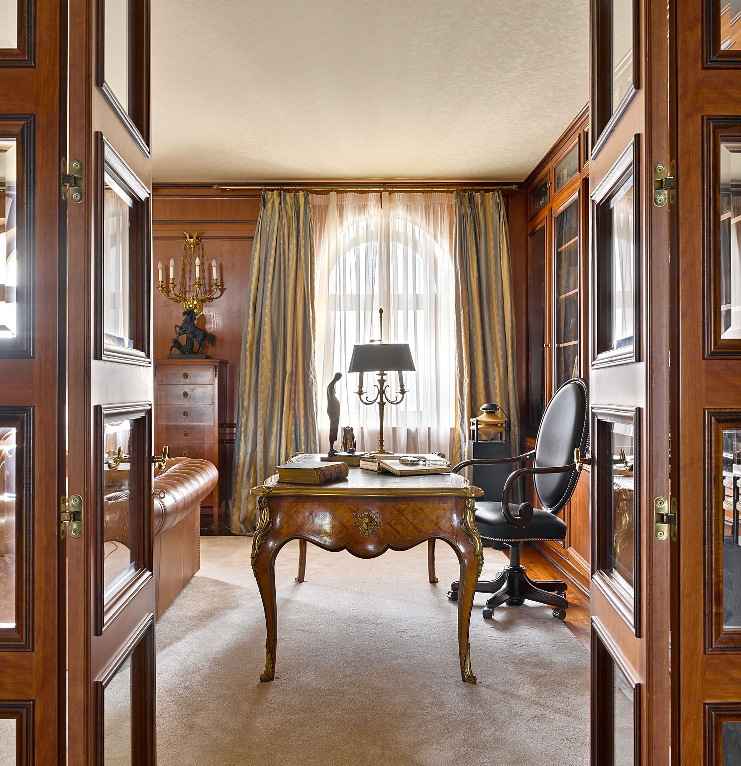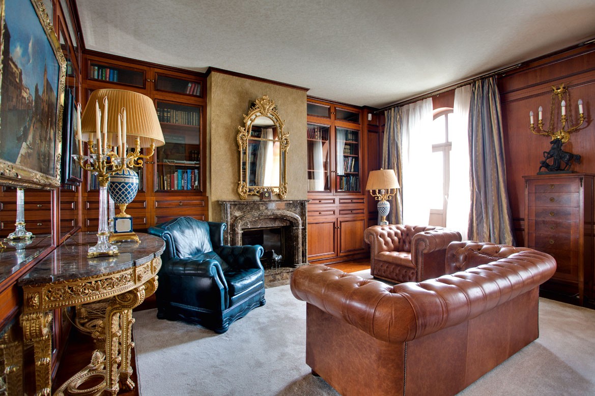 Автор проекта архитектор Ольга Фрейман: Это абсолютно классический кабинет–библиотека. Его стены оформлены панелями из вишнёвого дерева. Из этого же материала выполнены откосы арочных окон и встроенные книжные шкафы. Письменный стол и зеркало—антиквариат начала XIX века из австрийского замка Шёнбрунн. В зоне библиотеки расположены дровяной камин и английская мягкая мебель из натуральной кожи».