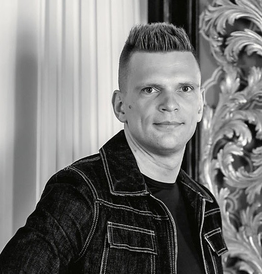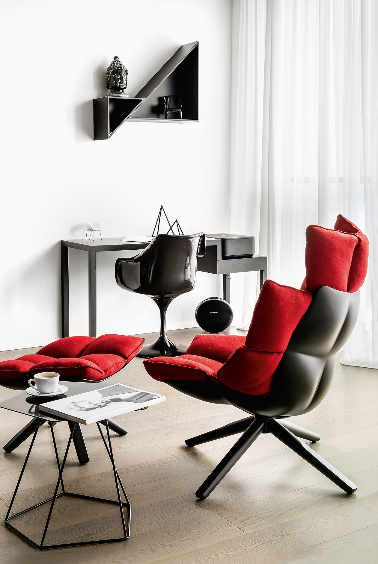 Архитектор Майкл Мирошкин: Рабочая зона расположена в пространстве гостиной. Мы любим монохромную цветовую гамму, современный стиль в дизайне, игры с пространством и светом. Вот из этих ингредиентов и сложился образ этого интерьера, брутального, с ироничными акцентами. Для залитого светом пространства использована мебель чёрного цвета, она особенно эффектно смотрится на фоне белых стен».