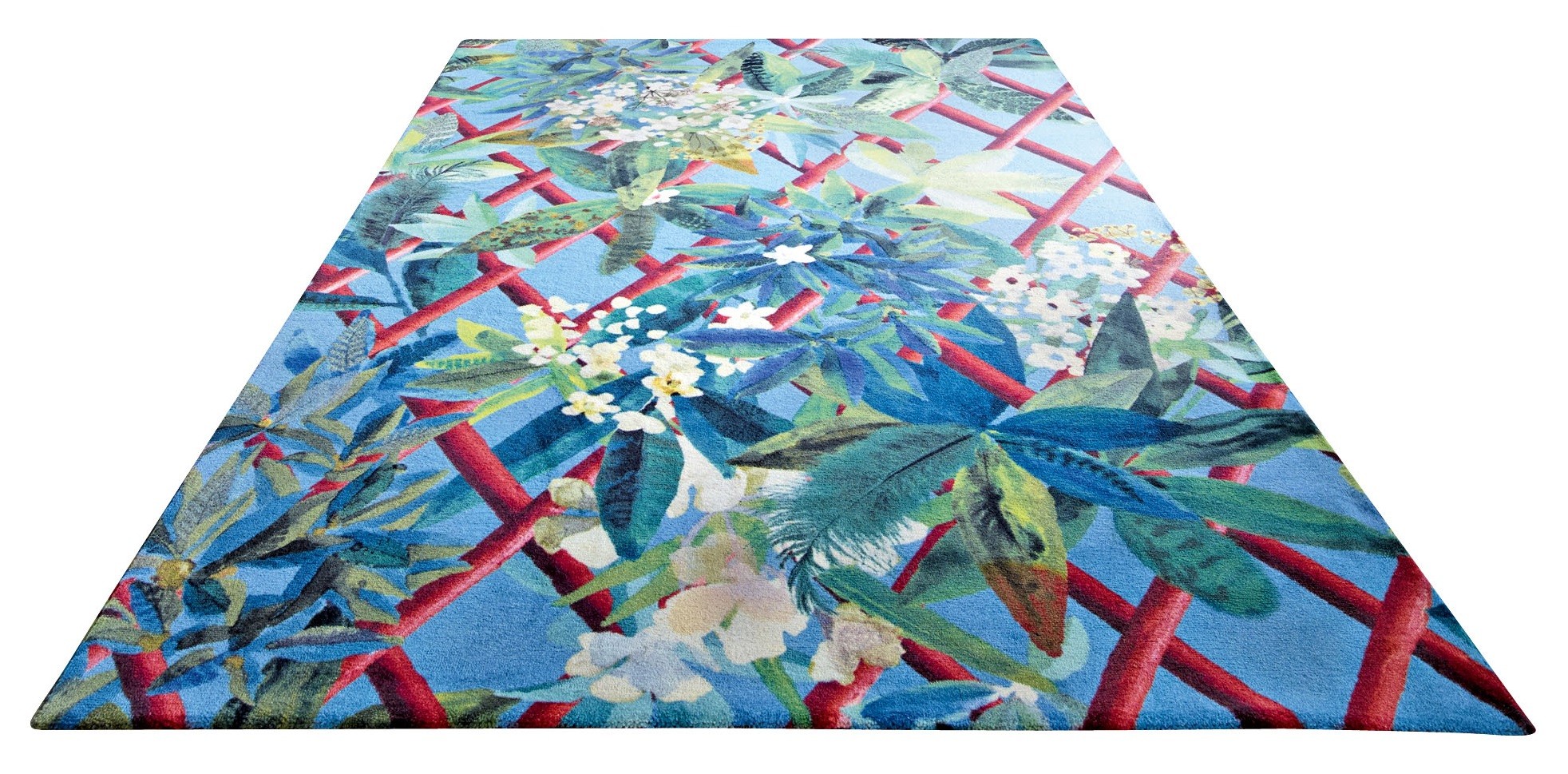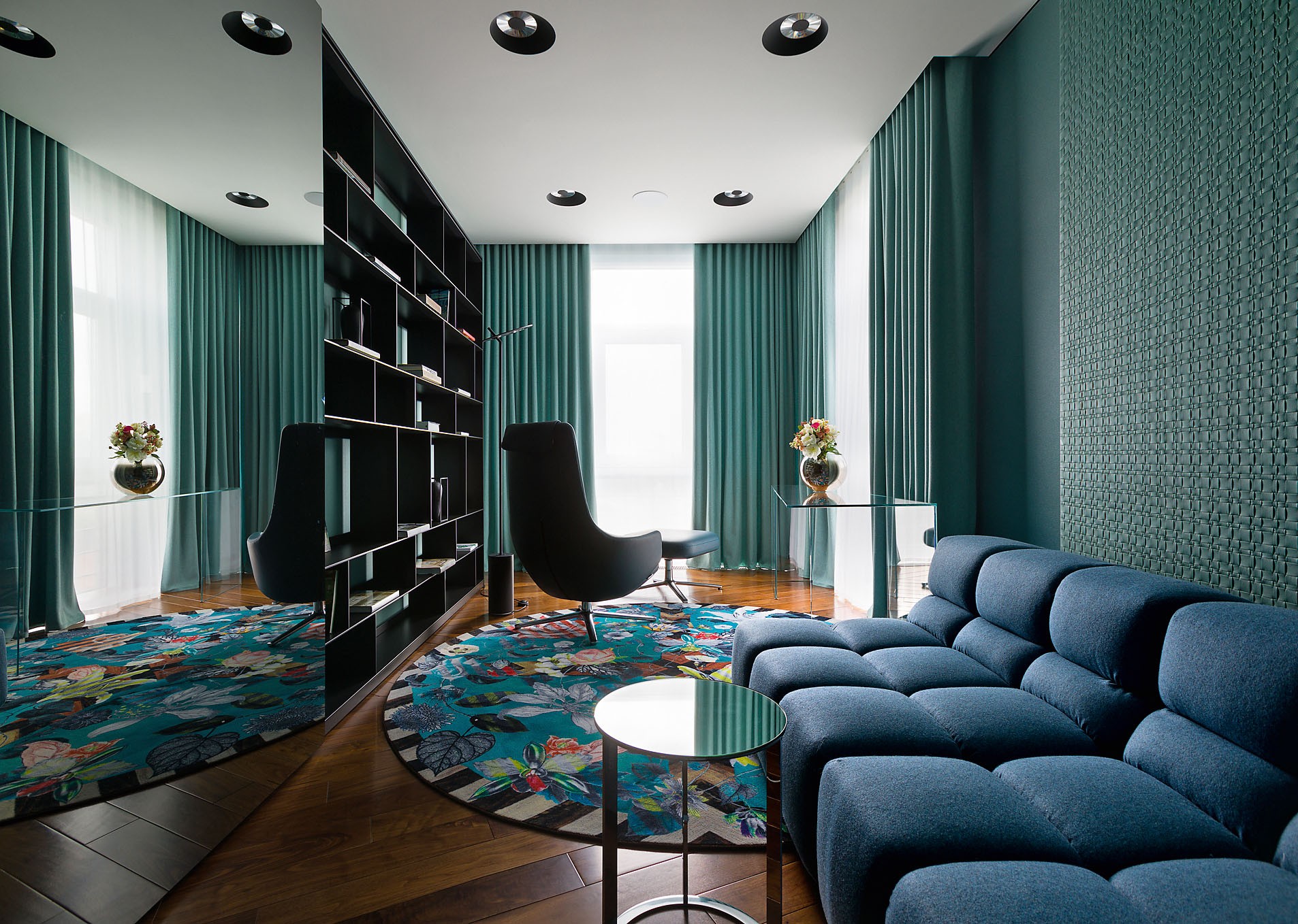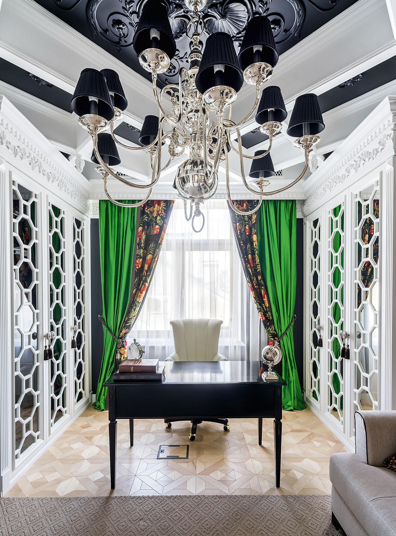 Автор проекта дизайнер Юрий Зименко: Мне нравится работать с цветом, экспериментировать с колористикой. Для интерьера этого кабинета был выбран зелёный цвет, так как он продолжал колористическую тему гостиной, расположенной рядом. Я использовал цвет с градиентной растяжкой от светло–зелёного до так называемого оттенка тиффани. На полу кабинета — паркет из массива ореха, уложенный асимметричной ёлочкой. Эффектной деталью в интерьере стал круглый ковёр с ярким рисунком».