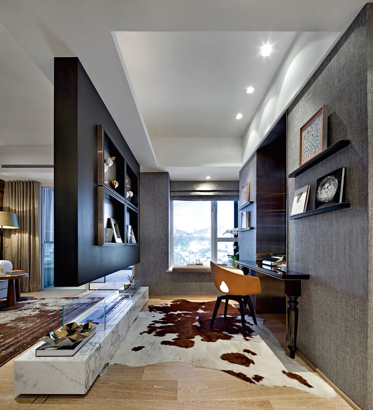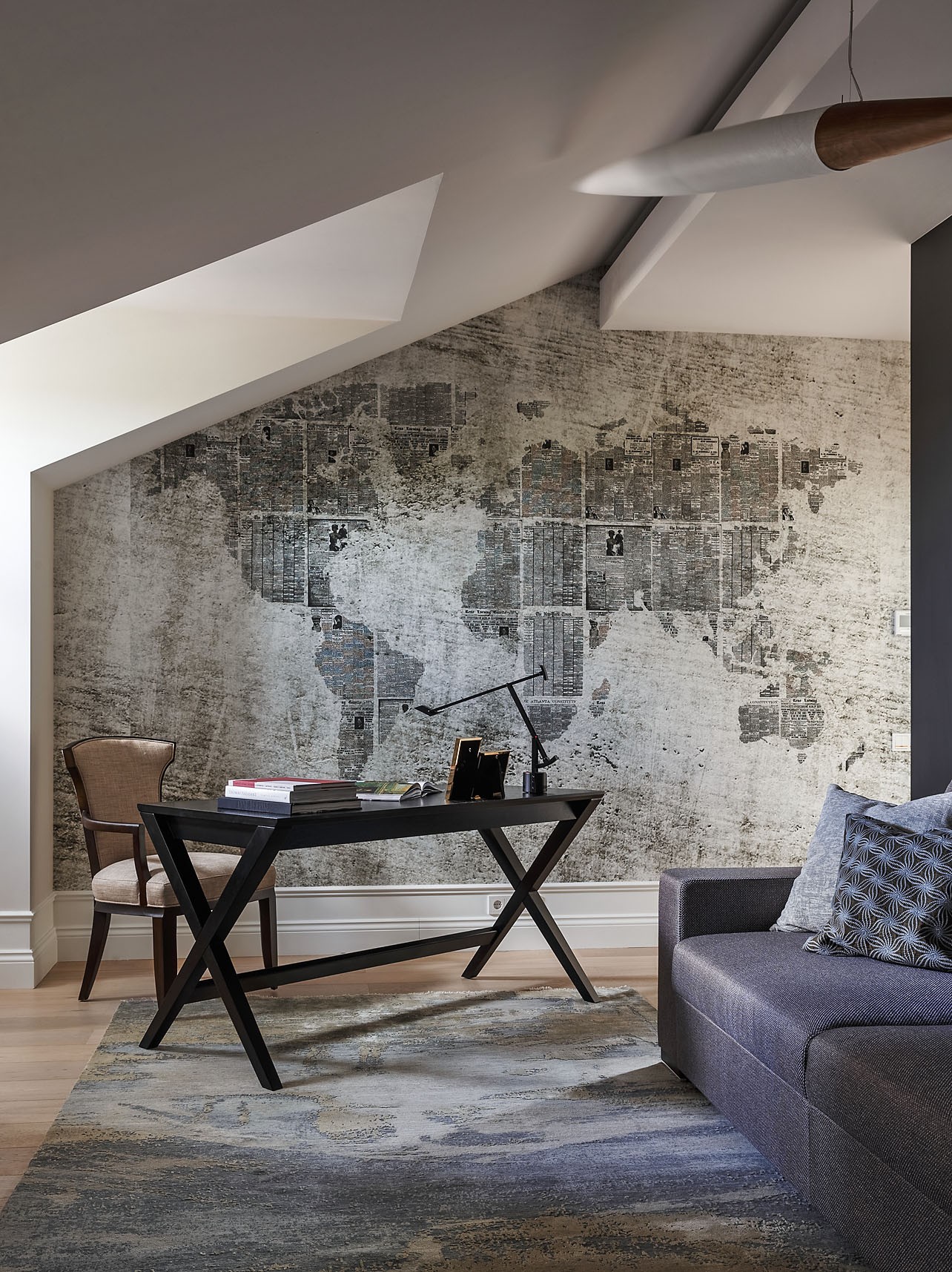 Архитектор Дмитрий Хорошев: Этот мужской кабинет на мансардном этаже загородного дома является ещё и курительной комнатой, поэтому здесь была установлена мощная автономная приточно–вытяжная вентиляция. А двухметровый подвесной светильник по форме напоминает сигару. Интерьер решён в монохромной гамме. Стена за письменным столом декорирована обоями со стилизованным изображением карты мира. Мебель выбиралась из элегантных и респектабельных американских марок, работающих в современной классике».