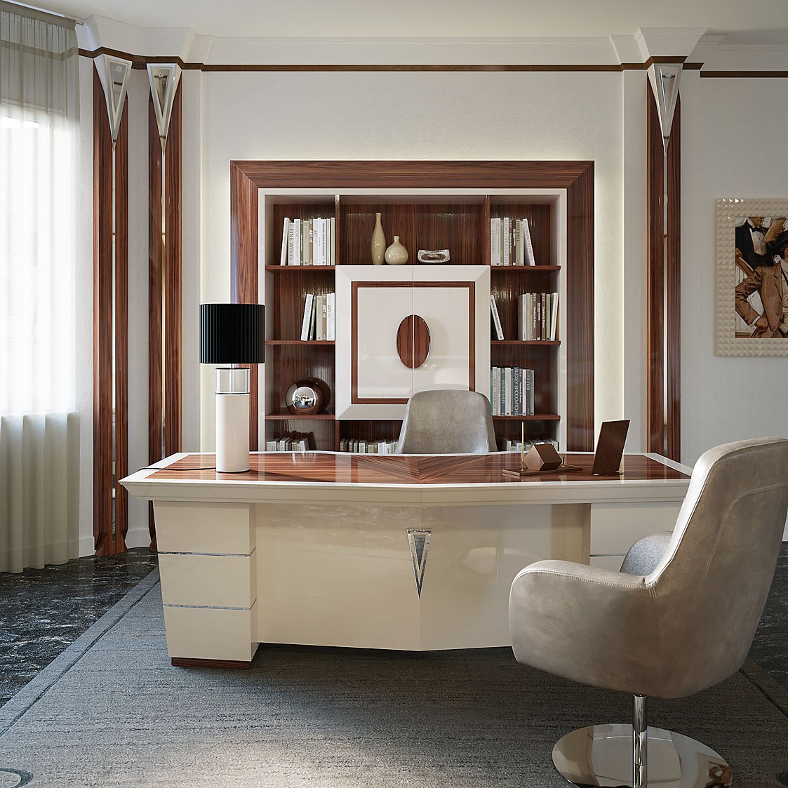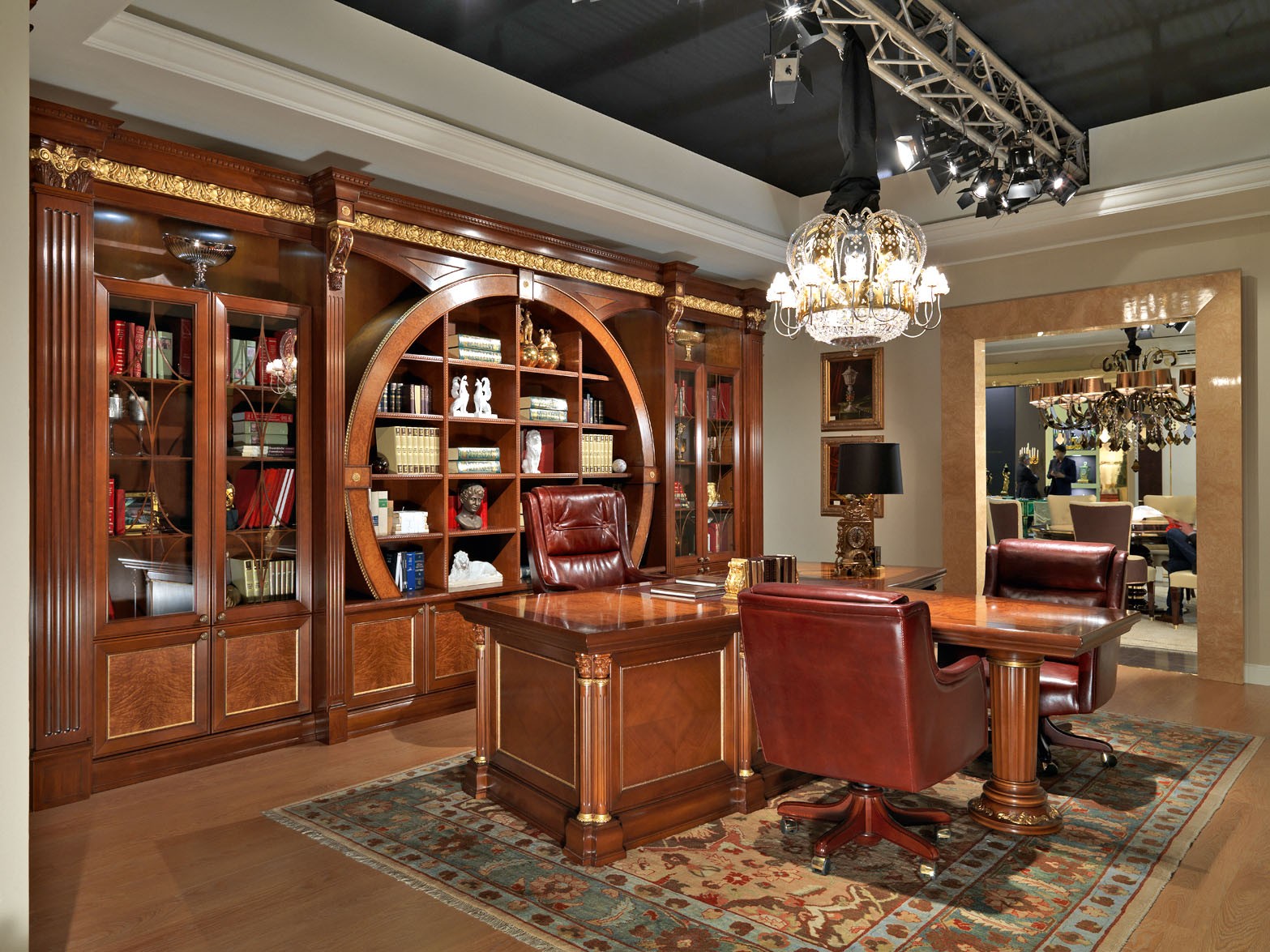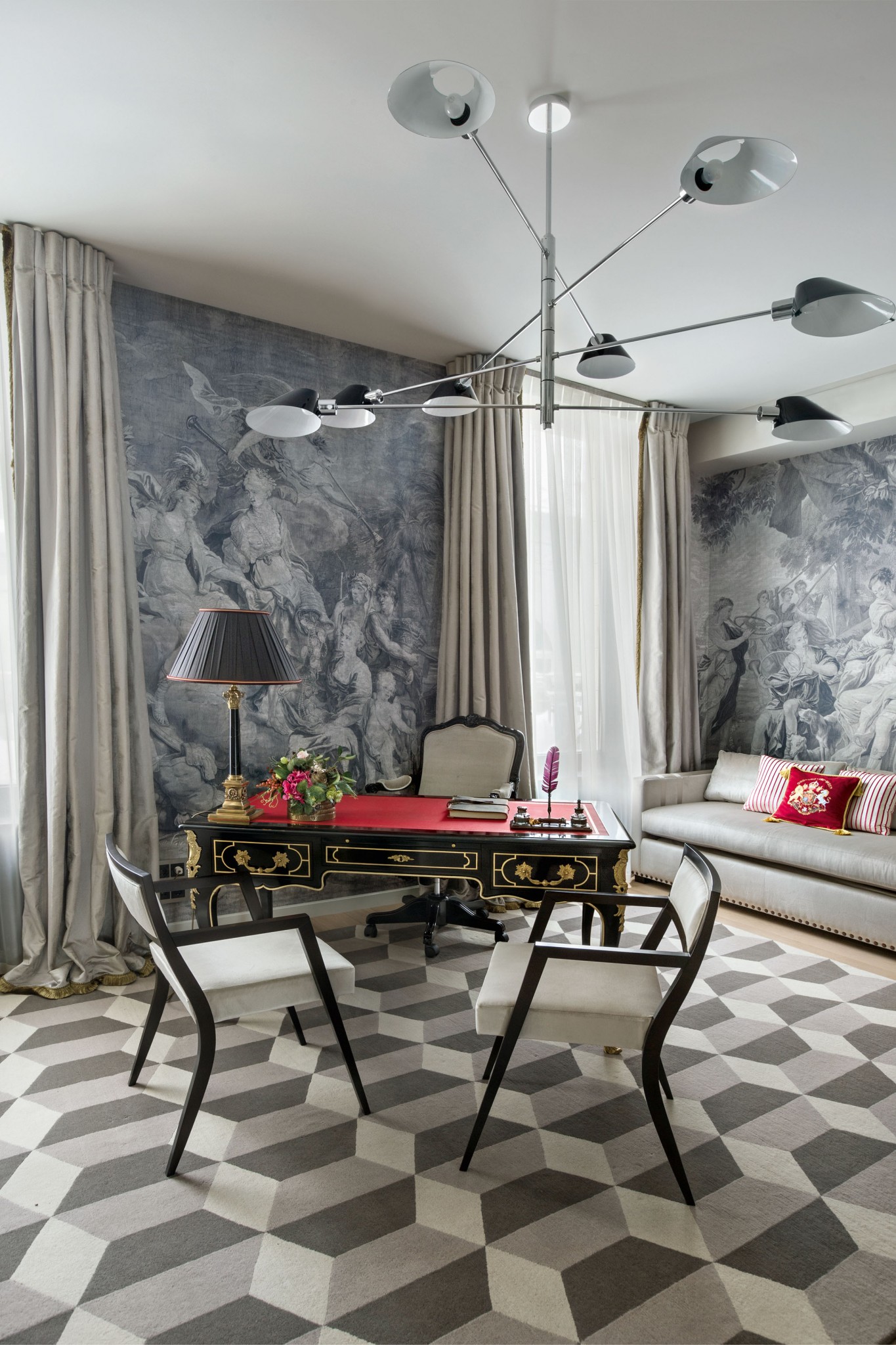 Автор проекта архитектор Игорь Сушков: В оформлении этого кабинета использованы классические приёмы: кессонированные потолки, лепнина, деревянные буазери, встроенные библиотечные шкафы, классическая мебель. Однако стилистику интерьера традиционной назвать сложно — яркие цвета и смелые их сочетания, тропический орнамент обоев и текстиля добавили кабинету выразительности».