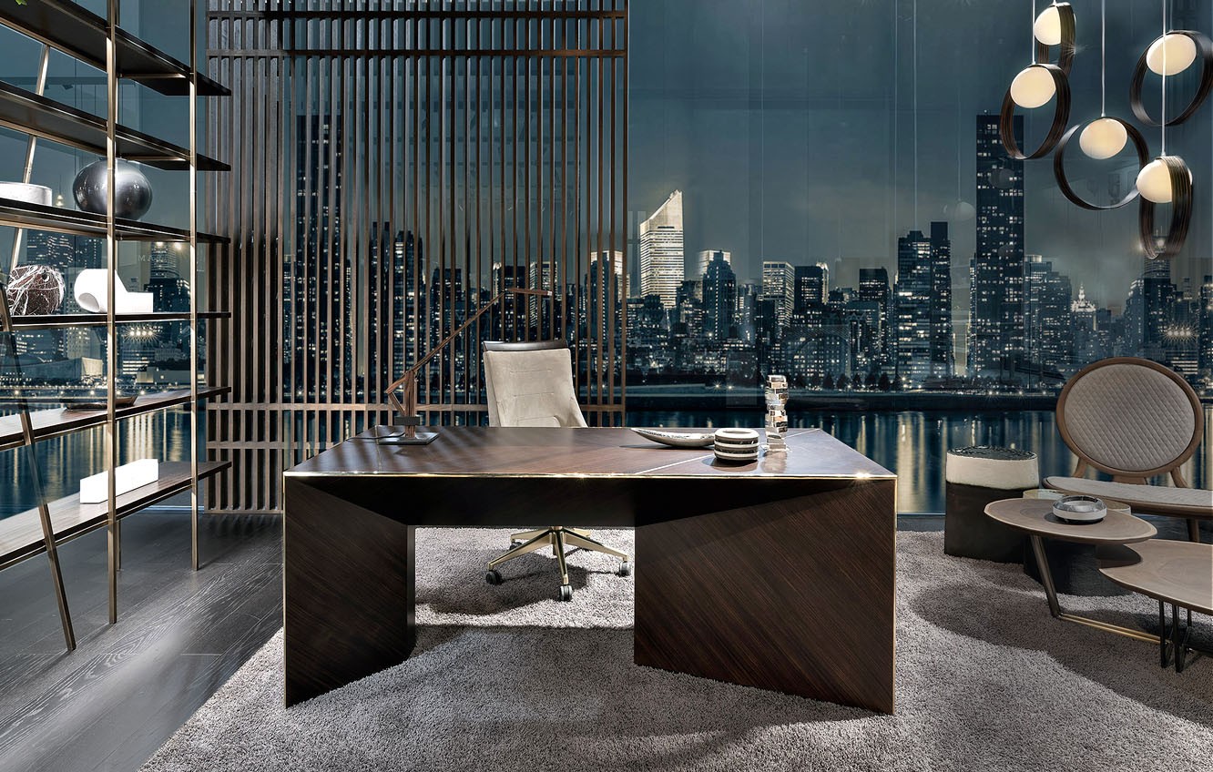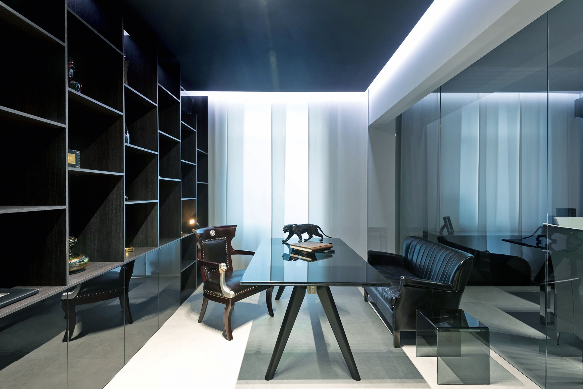 Автор проекта архитектор Сергей Наседкин: Кабинет входит в объединённое пространство общественной зоны, разделённое перегородками из дымчатого стекла, которые хорошо изолируют помещения, но при необходимости раздвигаются. Стекло, прохладный по ощущению материал, контрастирует с керамической плиткой тёплого оттенка на полу. Ровные полотна японских штор стилистически вторят перегородкам. Минималистичный дизайн разбавлен парой классических предметов».