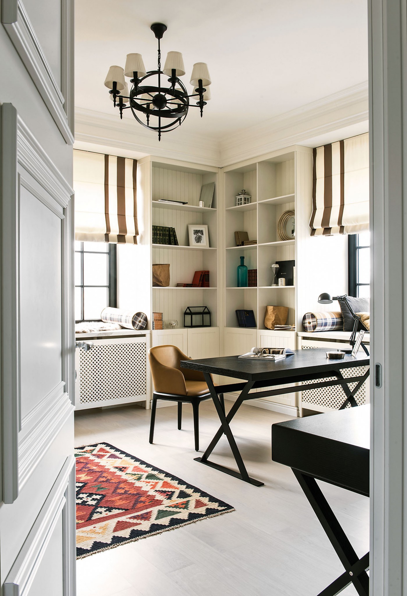 Автор проекта архитектор Марина Бочарова: Я люблю чёрно–белую гамму в интерьере. Мебель, аксессуары и оконные рамы чёрного цвета в сочетании со светлыми стенами смотрятся очень графично. В этом кабинете была увеличена ширина подоконников, что позволило сделать по периметру комнаты стеллажи. А сами подоконники выполнены из камня и дополнены подушками, чтобы можно было на них с комфортом сидеть».