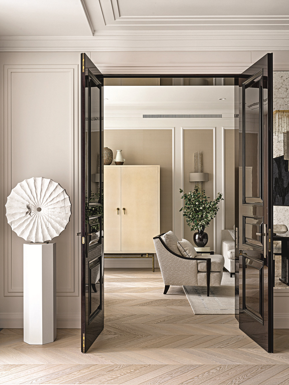 К уединенной гостиной примыкает приватный блок с гардеробной и главной спальней, а обе гостевые спальни с санузлами отделили от основного пространства холлом. Он же ведет в специально оборудованную постирочную и санузел при входе. «Нам было очень важно учесть все пожелания заказчика и оснастить квартиру всем необходимым, при этом сохранив простор и легкость помещений, — говорит Анастасия, — а благодаря декору и предметам искусства пространство обретает завершенный вид, в интерьере появляется душа».