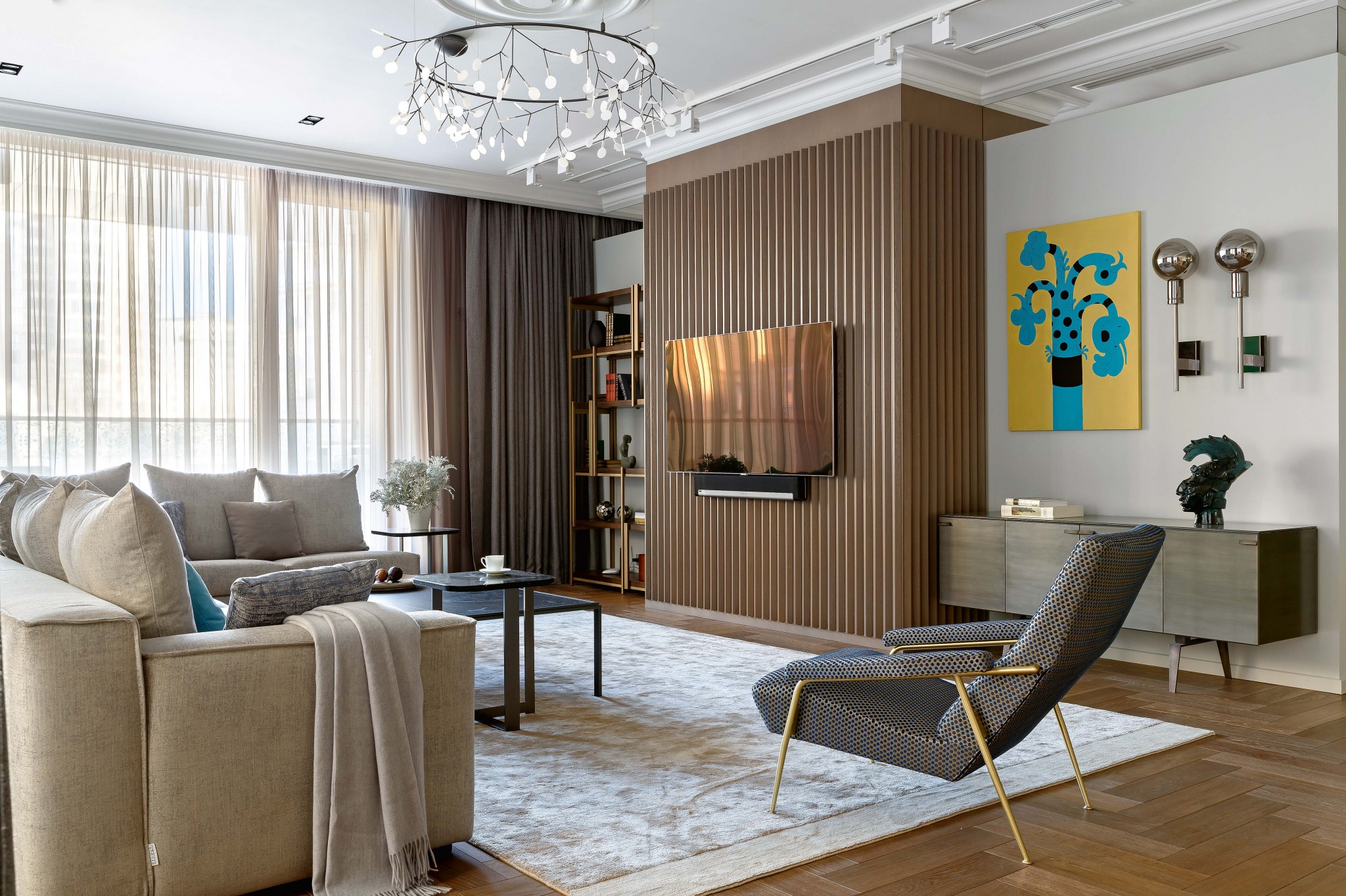 Каждый проект — это возможность сделать открытие: по‑новому оформить знакомое пространство, решиться на непривычные стилистические акценты или дать шанс приёмам, которые раньше были под запретом. Эта квартира в самом центре Москвы стала таким экспериментальным пространством и для авторов проекта, и для хозяйки. Эксперимента осторожного, хорошо выверенного и тонкого. Потому что именно такой хотела видеть свои новые апартаменты заказчица. «Наш предыдущий совместный проект был образцом современного минималистского дизайна. Здесь перед нами была задача выстроить пространство, созвучное вкусу хозяйки, но при этом не повторяться. В процессе поиска мы рассматривали варианты от брутальной стилистики в духе лофта с кирпичной кладкой до элементов французской классики. Но в итоге наше видение будущего пространства сформировалось вокруг образа современного, лаконичного интерьера с классическими элементами декора и яркими цветовыми акцентами», — рассказывает Светлана Жданова. Концепция отразилась и на планировочном решении. Общественную зону не стали дробить перегородками. Функциональное разделение подчёркнуто с помощью декоративных средств. Полы в кухне–столовой облицованы керамогранитом холодного бежевого цвета, а для гостиной и приватной зоны архитекторы выбрали паркет натурального оттенка. Колористика обеих зон квартиры держится одного направления: натуральный беж, благородный серый цвет, чистый белый. При этом каждое из помещений квартиры оттеняет