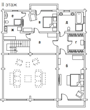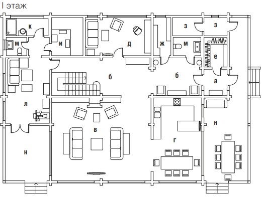 Загородый дом включает в себя много смыслов. Это целая идеология, уходящая корнями в далёкое прошлое. Характерно, что только убранист способен извлечь из жизни на природе все струны удо вольствия. Именно в противопо ставлении «город —деревня» ещё с античных времён формировалось понимание виллы, усадьбы, поме стья как целого мира, связанного с наслажде нием природой, с высокими занятиями ли тературой, философией и живописью, с праздностью во имя роскоши общения и, са мое главное, сладкого ничегонеделания — dolce far niente. Поэтому архитекторы взяли под контроль абсолютно все процессы — от проектирования дома до вмешательства в ландшафтный план. Один из готовых проек тов деревянного дома, который выбрала за казчица, дорабатывали и развивали: увеличи вали количество окон и расширяли оконные проёмы, пристраивали террасы, дом растяги вали и продлевали, делали более светлым и просторным. Перед домом строго по оси вы рыли бассейн. Водоём — знаковый для усадьбы момент, важная составляющая загородной постройки. Фасад отражается в водной глади, затем дробится и исчезает при порыве ветра, когда набегает водная рябь, — все эти эффекты мы найдём в любом памятнике античной, а затем ренессансной архитектуры. Всё это на следие переехало и в новое время, и сюда, к нам, в XXI уже теперь век. Но встал