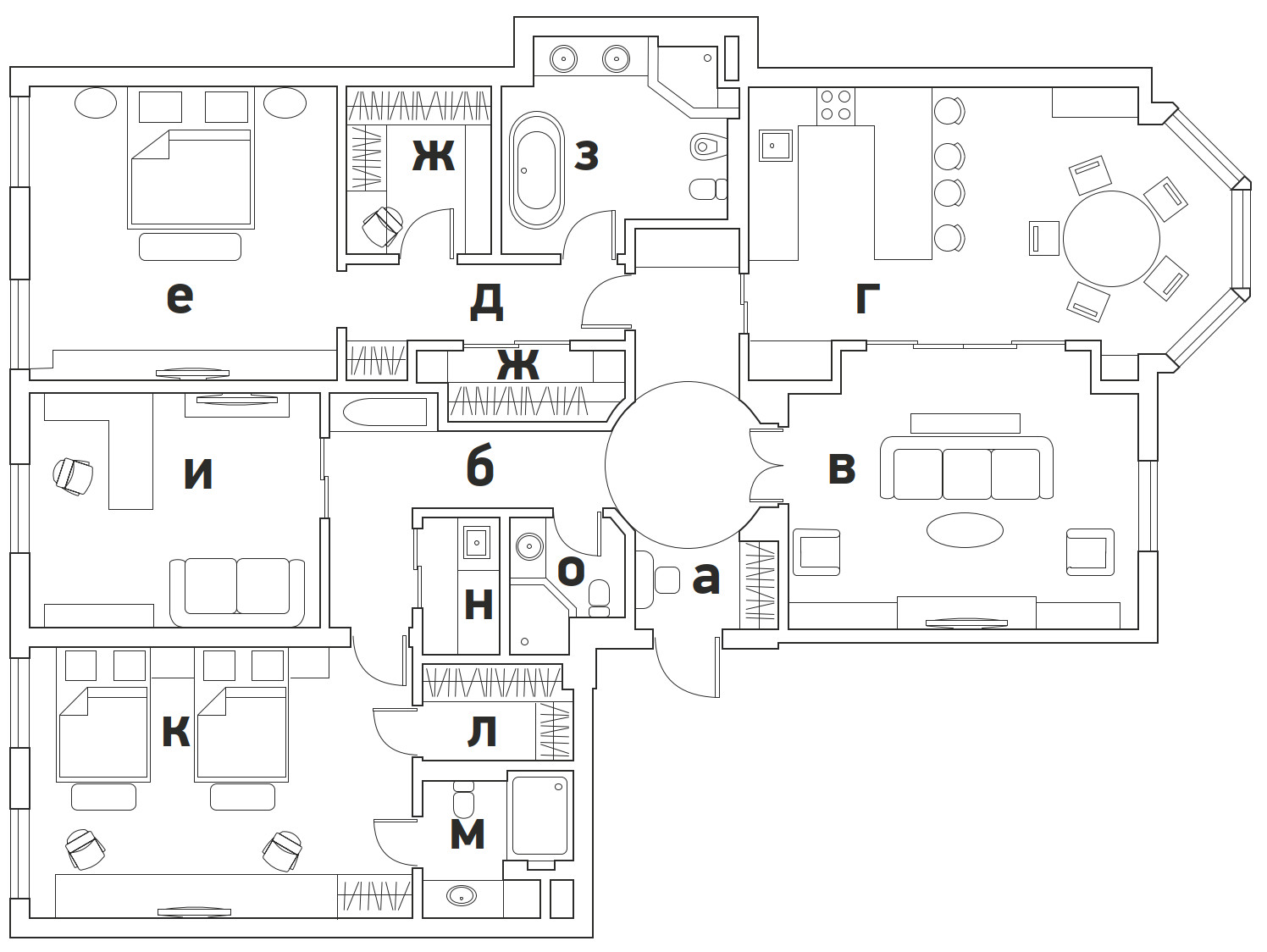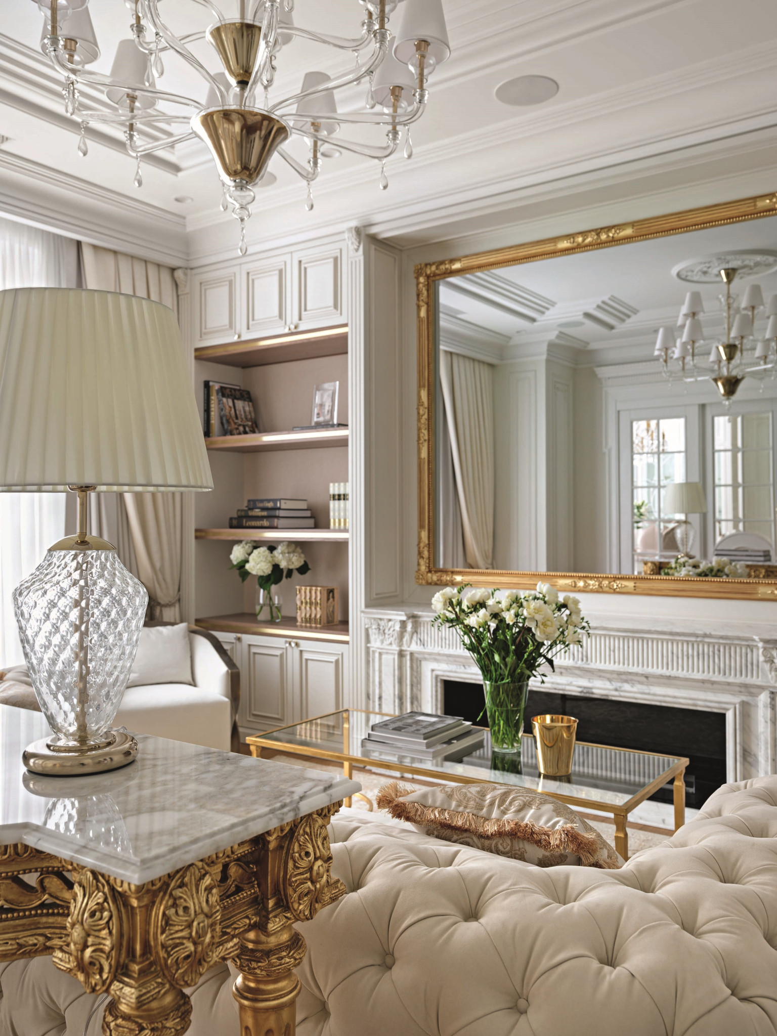 Планировка квартиры ясная и комфортная: справа от входа — парадная зона, состоящая из гостиной и кухни-столовой, слева — приватная, со спальнями и кабинетом. В спальной зоне удалось выделить место для двух отдельных гардеробных и при этом сохранить большое пространство для ванной комнаты. В квартире три санузла, а также есть маленькая, но функциональная постирочная. На планировочное решение повлияли несущие колонны и расположение мокрых зон, поэтому не получилось избежать коридоров, но их задействовали для создания дополнительных мест хранения. А самое главное, что коридор между приватной и парадной частями квартиры удалось превратить в элегантный, классический по стилю холл — за счет узора на полу, выполненного в технике инкрустации латунью, и архитектурно выразительного потолочного купола. «Он получился вследствие грамотной работы с высотами, — объясняет управляющий проектом Александр Пригодич. — Часть потолка в коридоре пришлось занизить для прокладки системы вентиляции, но в центральной точке мы сохранили высоту 3,5 метра и подчеркнули ее куполом». Дополнительным акцентом в этой зоне служит знаковая хрустальная люстра Baccarat. В этой квартире есть и второй подобный купол — он расположен на потолке в столовой над обеденным столом: центр купола и стола находится на единой оси. Акцент сделан на работе с природным рисунком мрамора: с помощью раскладки и естественного узора камня на полу создали центр композиции, который совпал с центром стола и купола. Благодаря таким деталям интерьер выглядит безупречно, а чтобы придать ему живость, его дополнили красивыми акцентными вещами. Это, например, золоченая резная консоль и камин в гостиной. Или, допустим, люстра в столовой: в солнечном свете кристаллы создают фантастическую игру бликов. «Этот интерьер по сути эклектичный, с элементами современной классики, — объясняет Диана. — Мы уже давно не ориентируемся на чистые стили, а стараемся создать гармоничное пространство, исходя из запроса заказчика. Тренды скоротечны; мы же стремимся сделать интерьер, который будет оставаться актуальным на протяжении многих лет — такой, который не захочется менять еще лет двадцать». Технологически эта квартира исключительно современна: она оснащена системой «умный дом», которая отвечает за канальное кондиционирование, увлажнение воздуха, акустику, сценарии освещения, сюда же подключены система безопасности и видеонаблюдение. Казалось бы, здесь уже есть всё для комфорта хозяев, но интерьер продолжает улучшаться. Недавно, уже после того, как объект был сдан и проведена съемка, авторы подобрали в столовую сервиз Bernardaut, компаньоны от Baccarat, Lalique, менажницы Villari, кофейные пары, вазы Lalique и бокалы, а интерьер кабинета дополнили скульптурами от Villari.