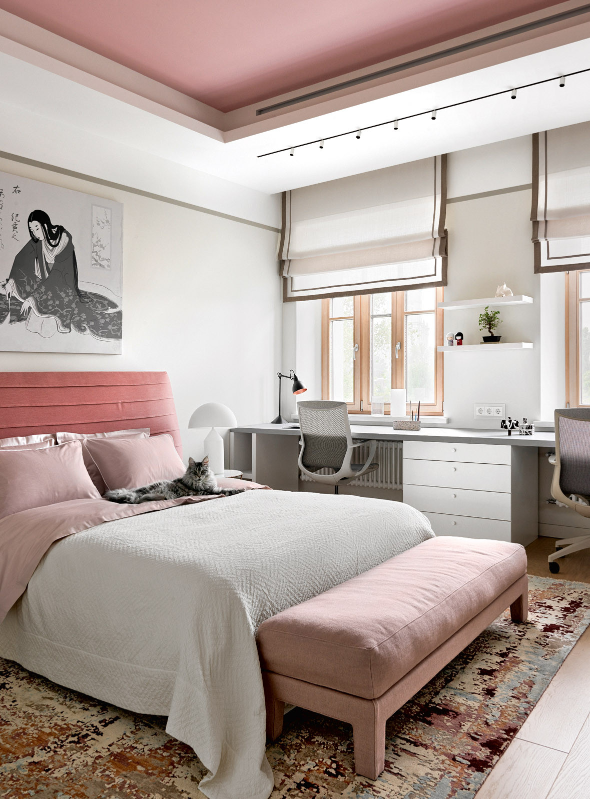 В планировочном решении автор проекта придерживалась ставшей уже классической схемы разделения пространства на общественную и приватную зоны. Гостиную разместили ближе ко входу, спальни, соответственно, — в глубине квартиры. В процессе перепланировки в гостиной возник тёмный аппендикс. Дизайнер предложила поставить здесь зеркальную стену и организовать зимний сад, на что хозяева с удовольствием согласились. «Проектом мы предусмотрели и тренажёрный зал (с большим зеркалом и балетным станком), и зимний сад, и комфортные рабочие места — заказчики видели свою городскую квартиру максимально комфортной, как в загородном доме. Но на тот момент мы ничего не знали про пандемию: проектирование объекта закончили до неё, а начало стройки пришлось как раз на длинный прошлогодний локдаун. Это было пожеланием владельцев, но впоследствии оказалось очень правильным решением: в условиях нестабильной ситуации у хозяев есть все условия, чтобы пережить домашнюю изоляцию безо всяких проблем», — замечает Оксана.