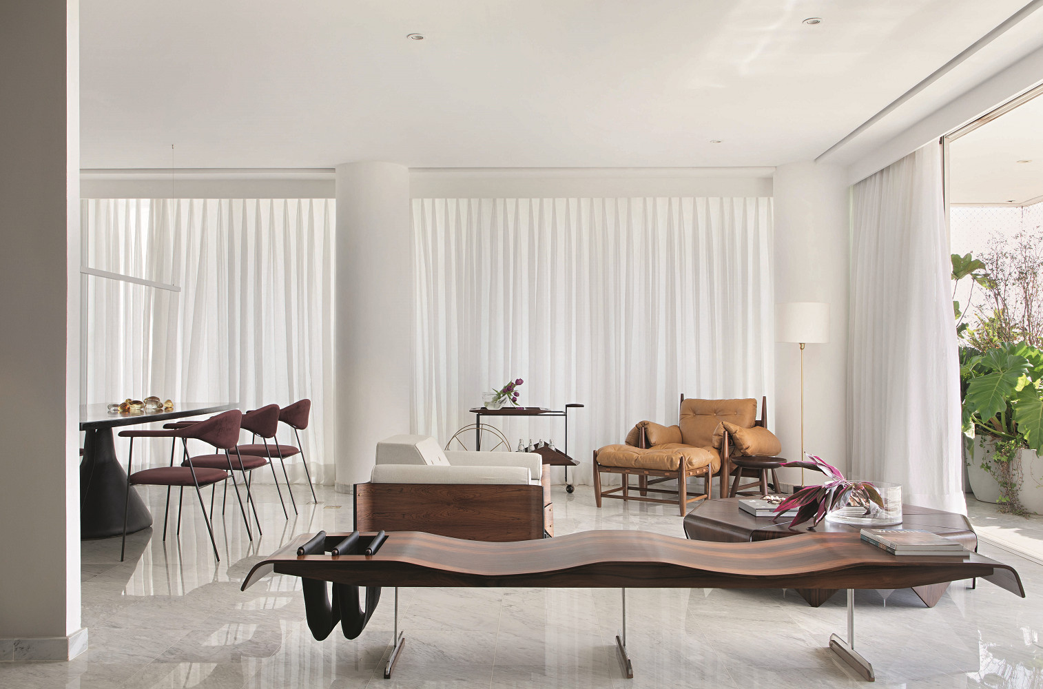 Когда молодая семейная пара арендовала эту квартиру, им поставили жесткие условия: можно вносить изменения в интерьер, но минимальные — не больше чем освежить и обставить. Так что приглашенным архитекторам из фирмы Lucas Fernandes Arquitetos пришлось ограничиться минимальной реставрацией и оформлением с подбором обстановки и арта. Весь интерьер сформировался вокруг культовых предметов дизайна. Бразильский модернизм хорошо известен в мире коллекционного дизайна, а в этом интерьере прозвучали все его крупные имена: Хорхе Зальзупин, Серхио Родригес, если брать арт — Роберту Бурле Маркc. Визуальный ряд дополнили современные авторы, наследующие традиции модернизма, как, например, Дзанини де Дзанин и Джадер Альмейда. Работы модернистов стали «замковыми камнями» каждого из помещений дома. На площади в 300 кв. м это просторная двухчастная гостиная: с ТВ-зоной и лаунджем, столовая с небольшой кухонной зоной, рабочее пространство и две