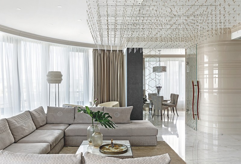 В ней мы разместили все спальни, ванные, гардеробные комнаты и хозяйственные помещения. А на базе второй мы создали парадное, общественное пространство». Само место, жилой комплекс, площадь объекта и видовые параметры определили качественные характеристики дизайна. Это, несомненно, люксовый интерьер со всеми вытекающими отсюда решениями — от высококачественных материалов, традиционно применяемых в интерьерах подобного уровня, до ультрасовременных технологий, обеспечивающих комфортный микроклимат и достойный уровень жизни. Для отделки полов, ванных комнат использован мрамор из итальянских и португальских карьеров, дубовый итальянский паркет, на стенах — панели из кожи, алькантары, буазери из лакированного дерева, в обстановке — мебель и светильники топовых европейских производителей. Заметное место в интерьере занимает живопись. Для этого проекта архитекторы специально собрали коллекцию современного искусства. Причём подбор произведений, осуществлённый