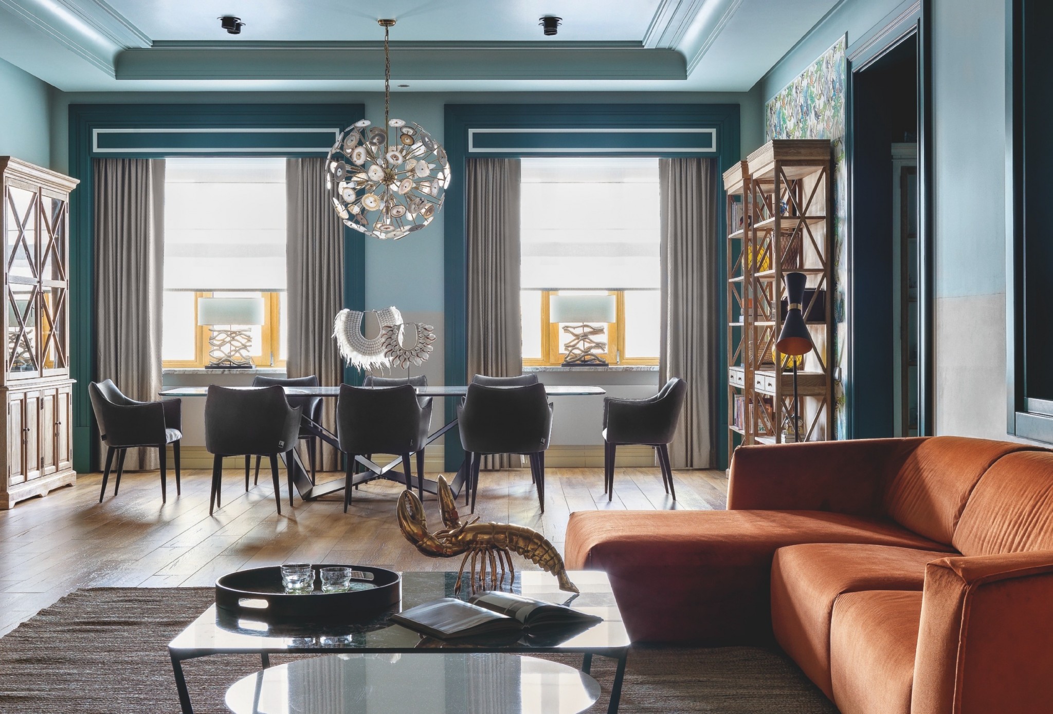Евгения Мишина: Хозяевам нужны были эмоции, им это было очень важно. А эмоции даёт цвет. И, как оказалось, мы с ними были на одной волне. Ни чёрные обои с золотыми ананасами и тропическими джунглями, ни тёмно– зелёные проёмы или голубые стены и потолки—мои предложения не вызывали у них никаких вопросов. Для заказчиков это было настолько естественно и органично, словно они всю жизнь прожили в ярких интерьерах. Хотя это далеко не так. Как и большинство из нас, они выросли в стандартных бежевых интерьерах. Для меня как для дизайнера важно, как будут ощущать себя люди в интерьере, насколько им будет здесь комфортно. В семье подрастают дети, постоянно разбросаны игрушки, и мне хотелось, чтобы в этом хаосе, круговороте детей, нянь, бабушек, пирогов и блинов обстановка была более или менее гармоничной. Когда в семье появляются дети, гармония, как правило, пропадает—пластиковые игрушки разрушают идеальную картинку. Мне не хотелось отгораживать детей от взрослой жизни. Поэтому игра с цветом— некий элемент детскости—помогла нам добиться желаемого. И дети, и взрослые в этом интерьере ощущают себя на равных.